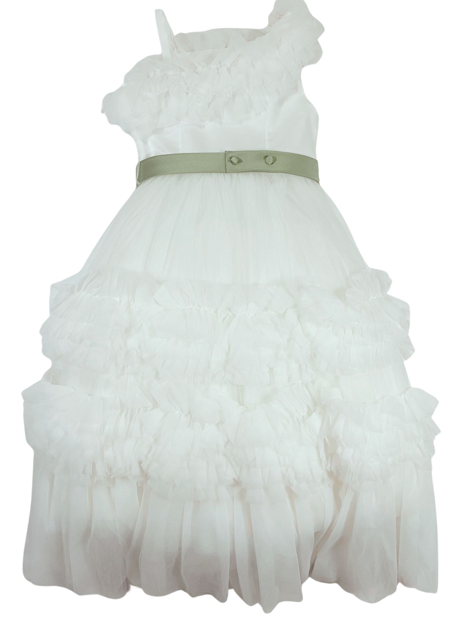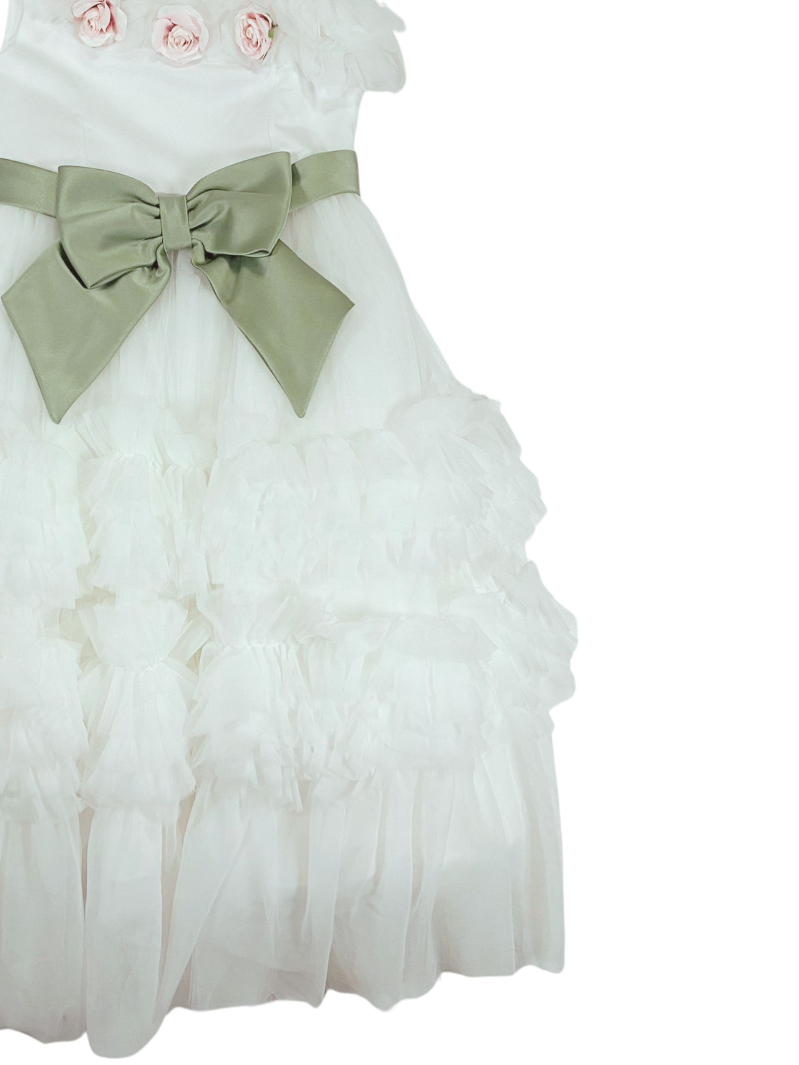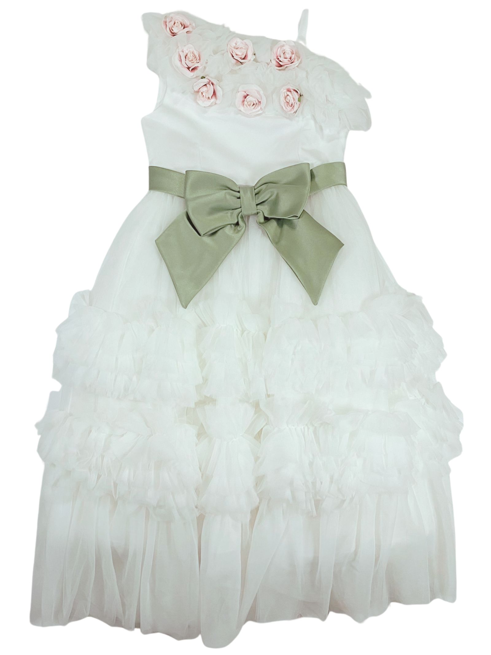 Colorichiari Kids abito cerimonia di colore bianco, design monospalla con una bretella, fiocco centrale a contrasto verde, applicazione fiori, zip laterale, foderato, strato superiore in tulle arricciato. Composizione: 100% poliestere. Made in Italy