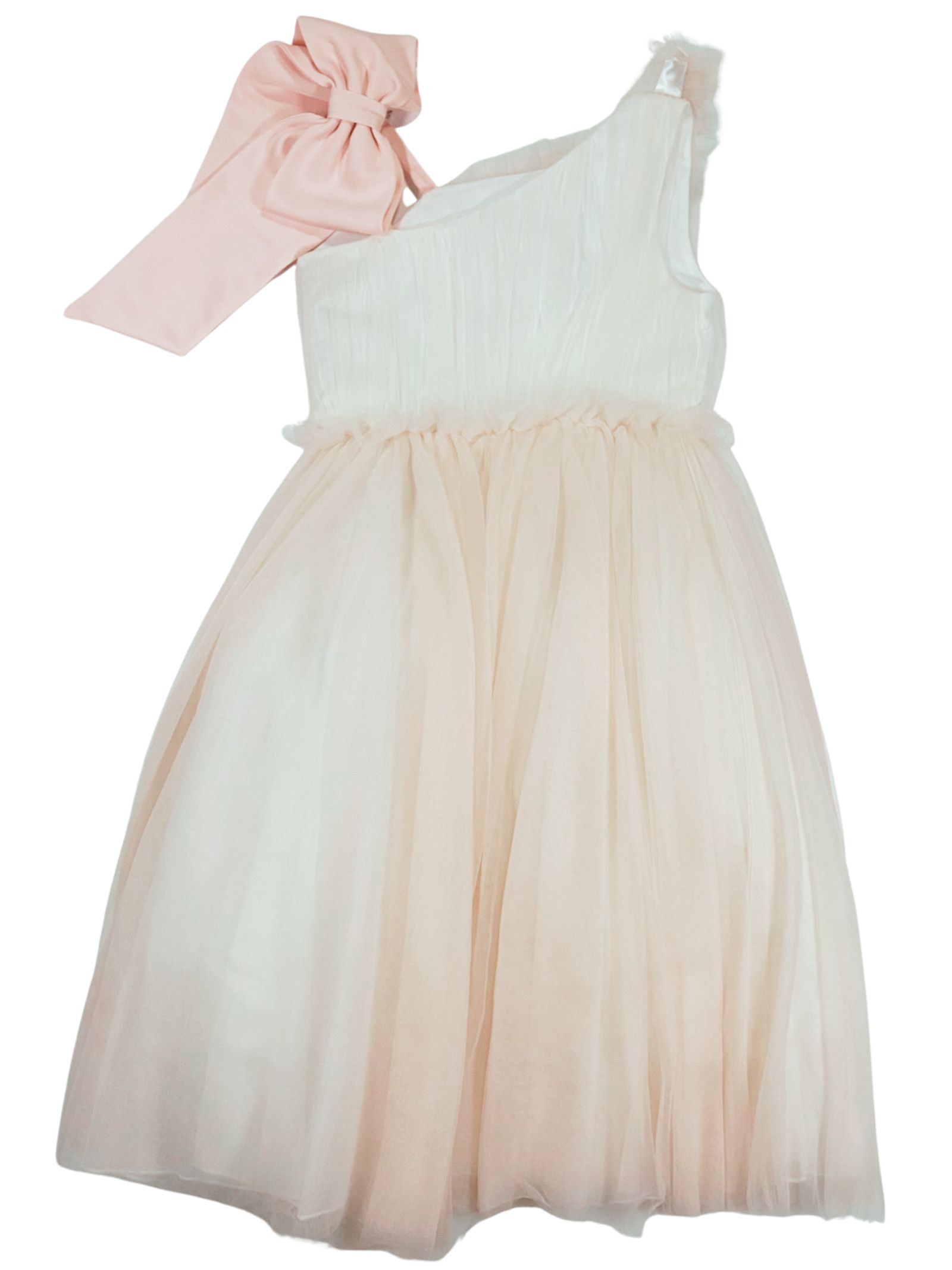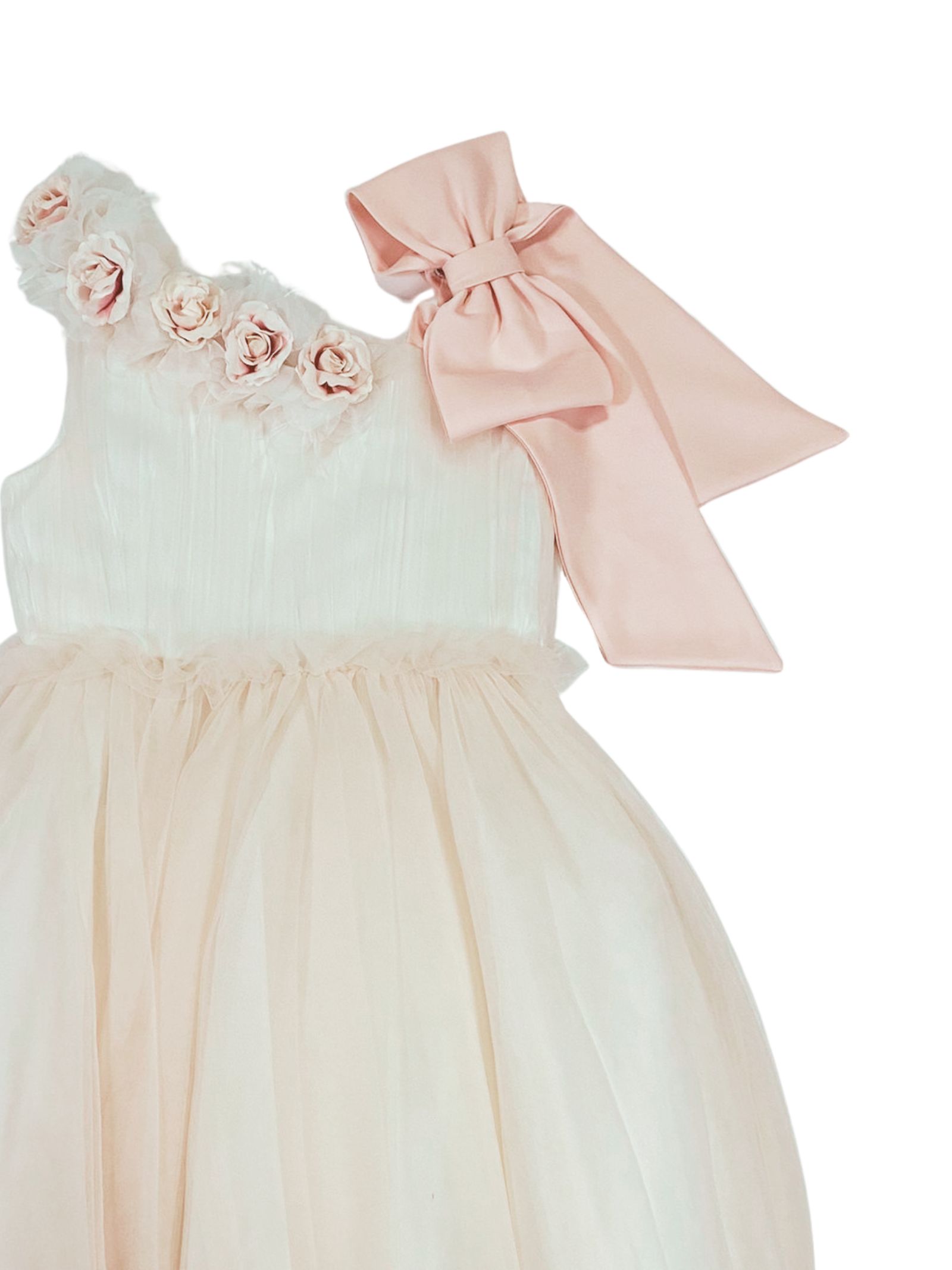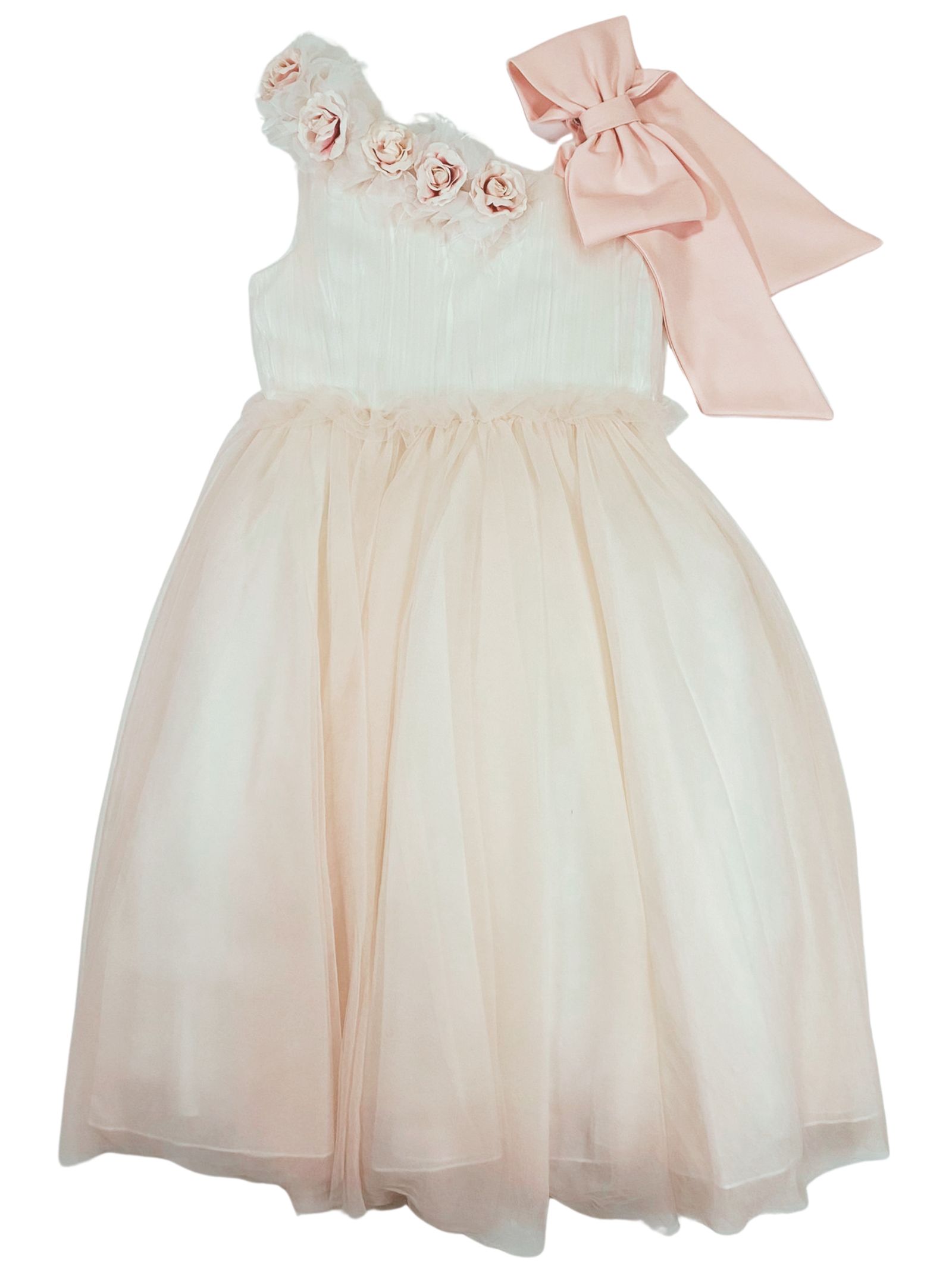 Colorichiari Kids abito cerimonia monospalla di colore rosa/bianco, fiocco su una spalla, applicazione a fiori, zip laterale, foderato, strato superiore in tulle. Composizione: 96% poliestere 4% elastan. Made in Italy