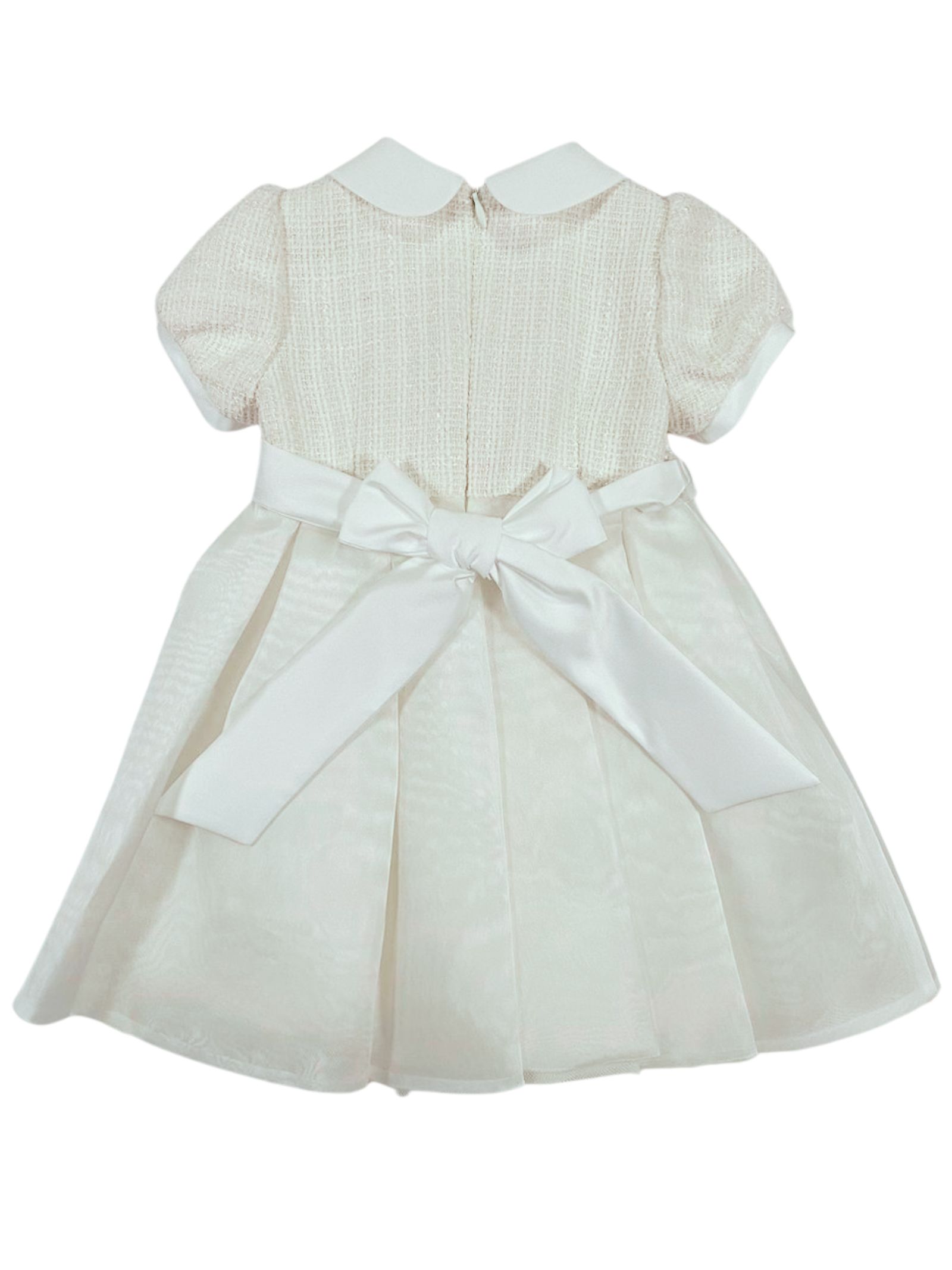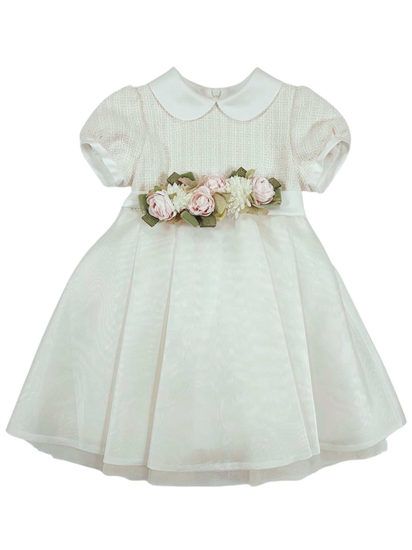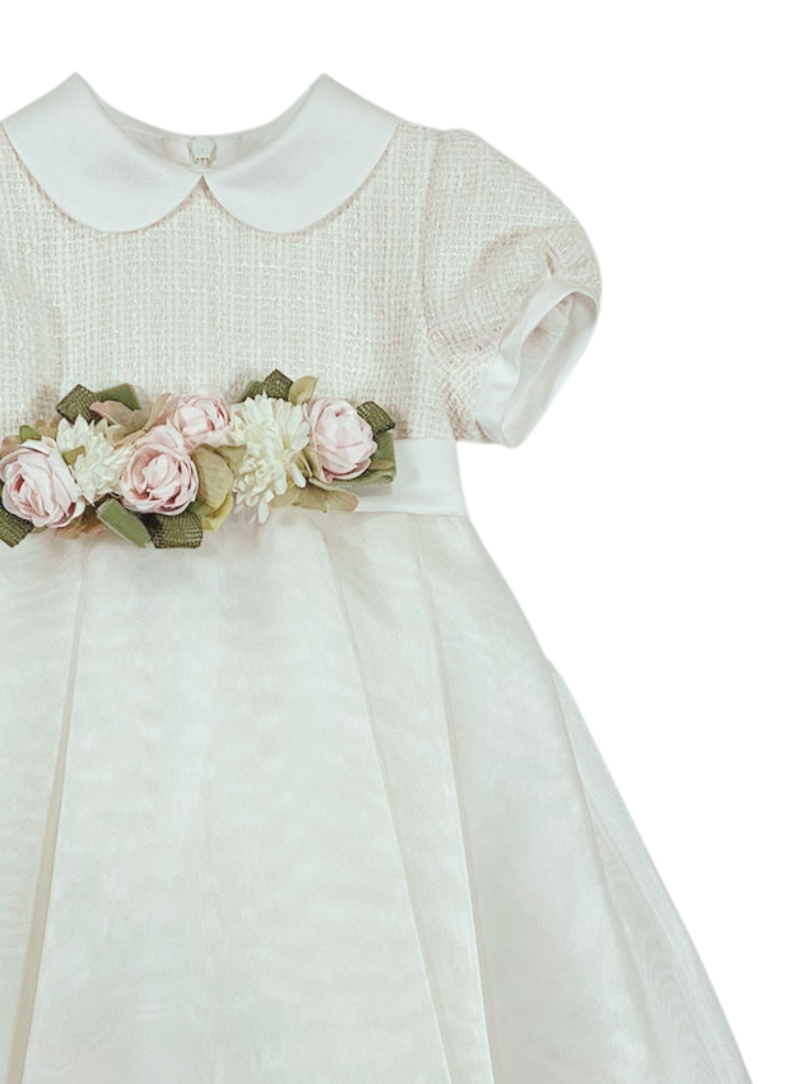 Colorichiari Kids abito cerimonia di colore bianco, mezze maniche a sbuffo, colletto tondo, cintura con applicazione centrale fiori e fiocco sul retro, zip posteriore, foderato, strato superiore in tulle. Composizione: 100% poliestere. Made in Italy