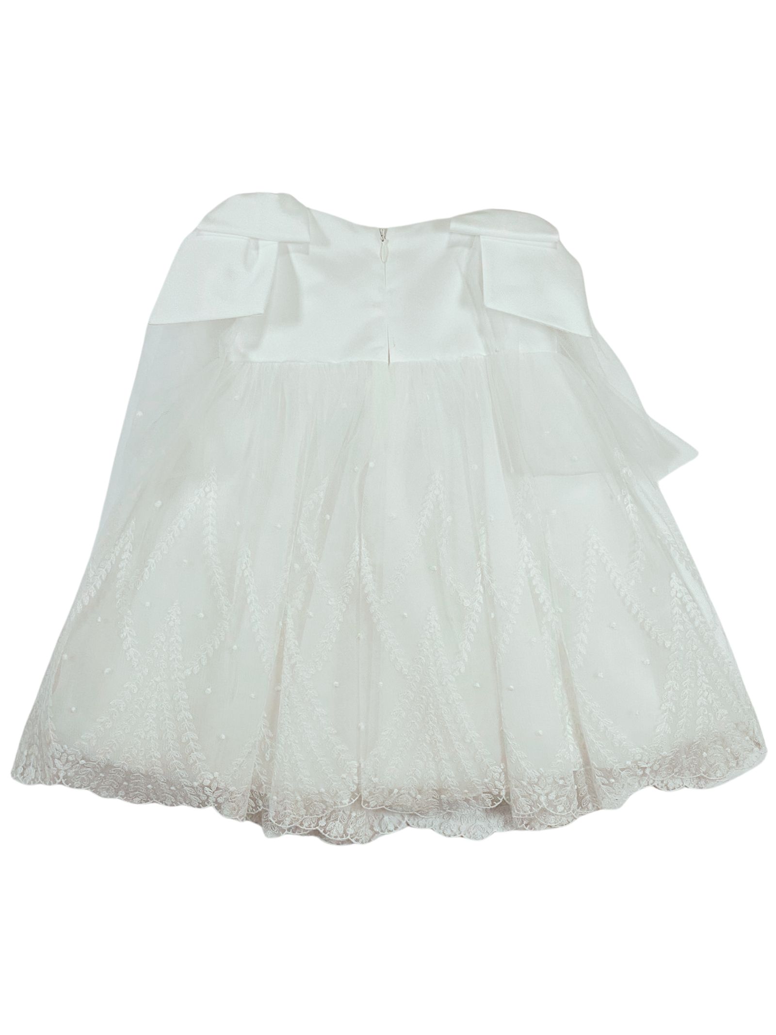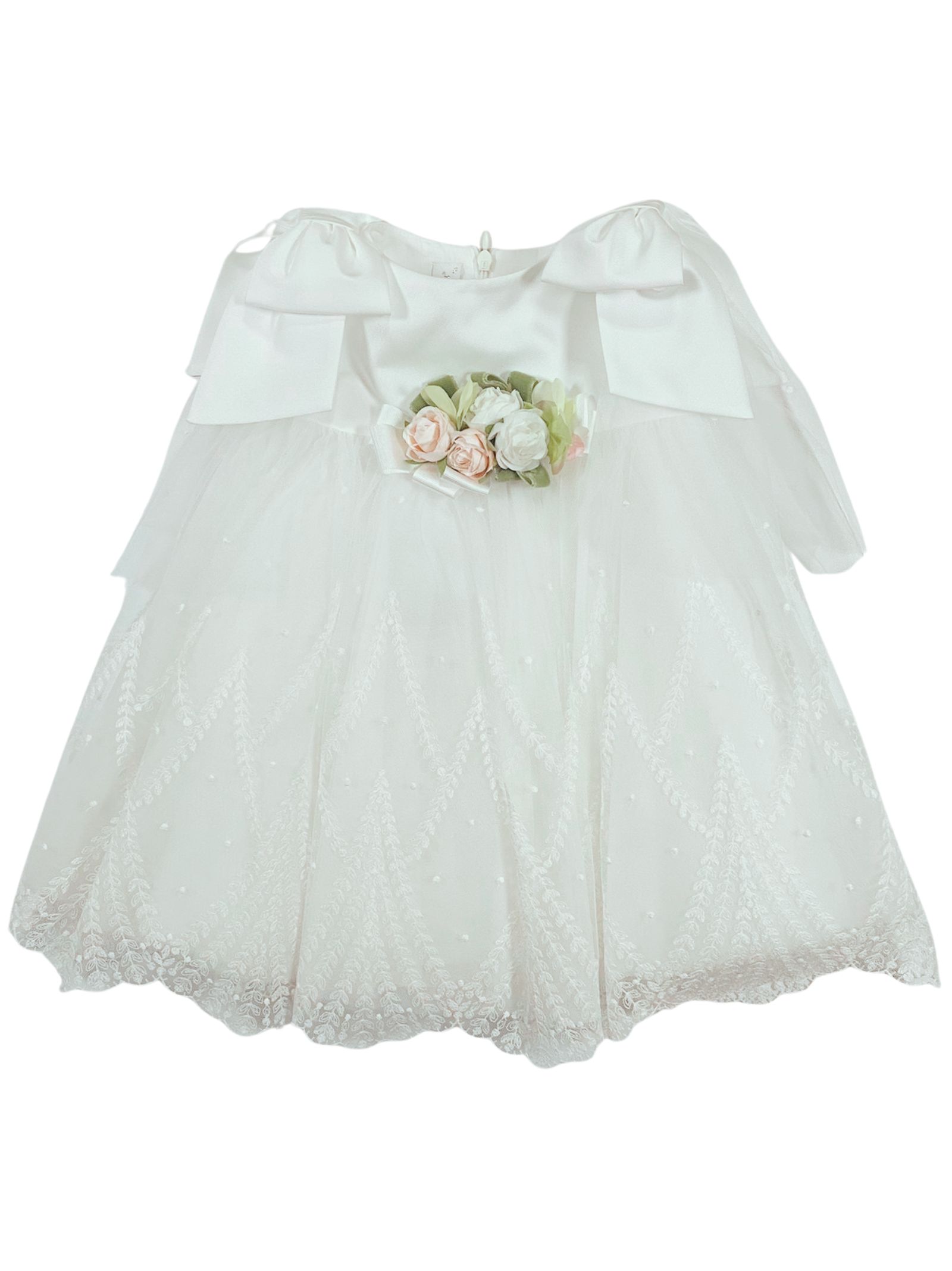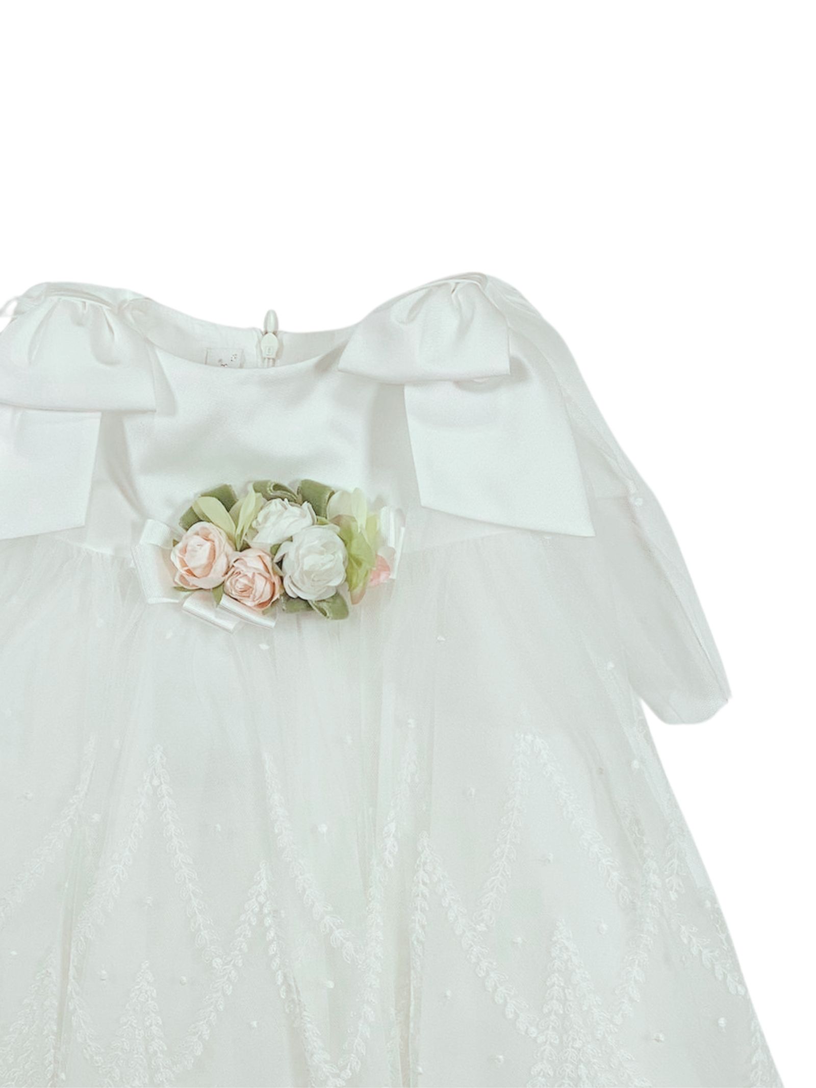 Colorichiari Kids abito cerimonia di colore bianco, giromaniche, applicazione centrale fiori, due fiocchi sulle spalle con tulle, zip sul retro, foderato, strato superiore in tulle con ricami. Composizione: 100% poliestere. Made in Italy