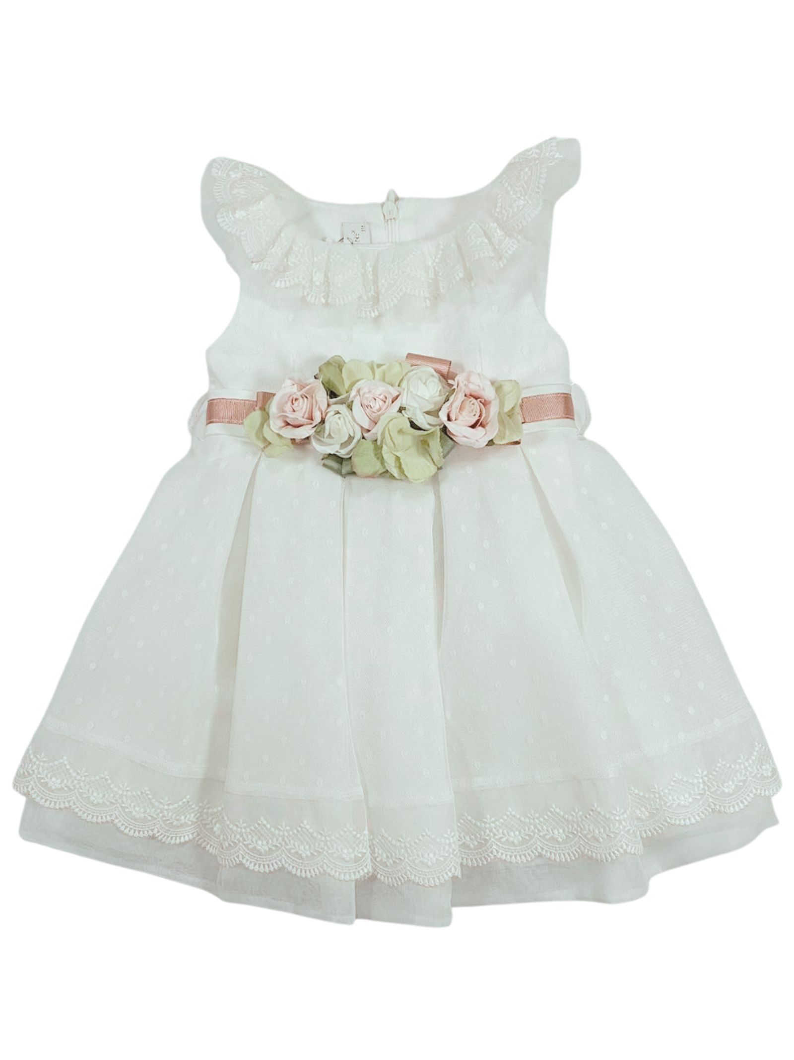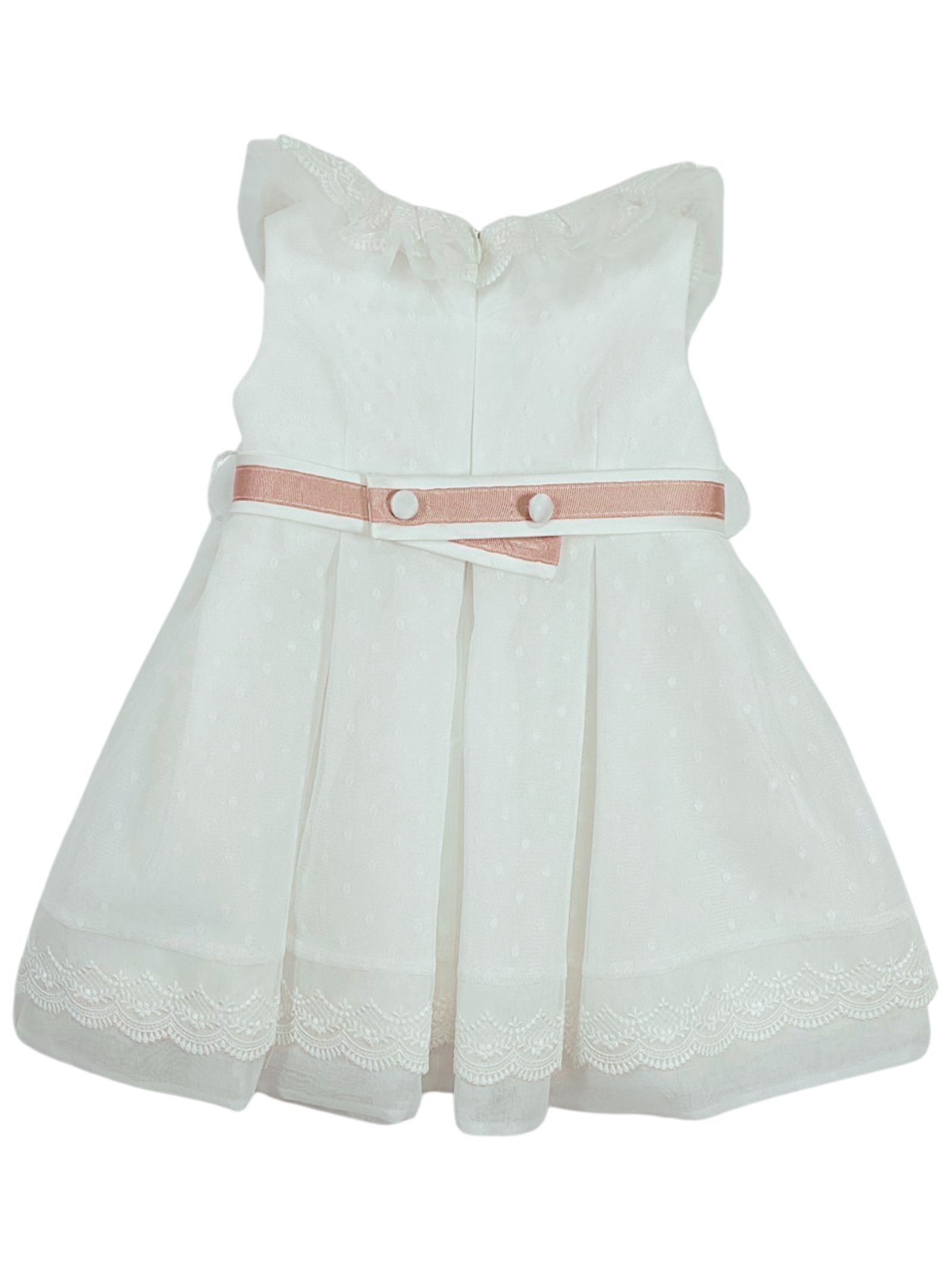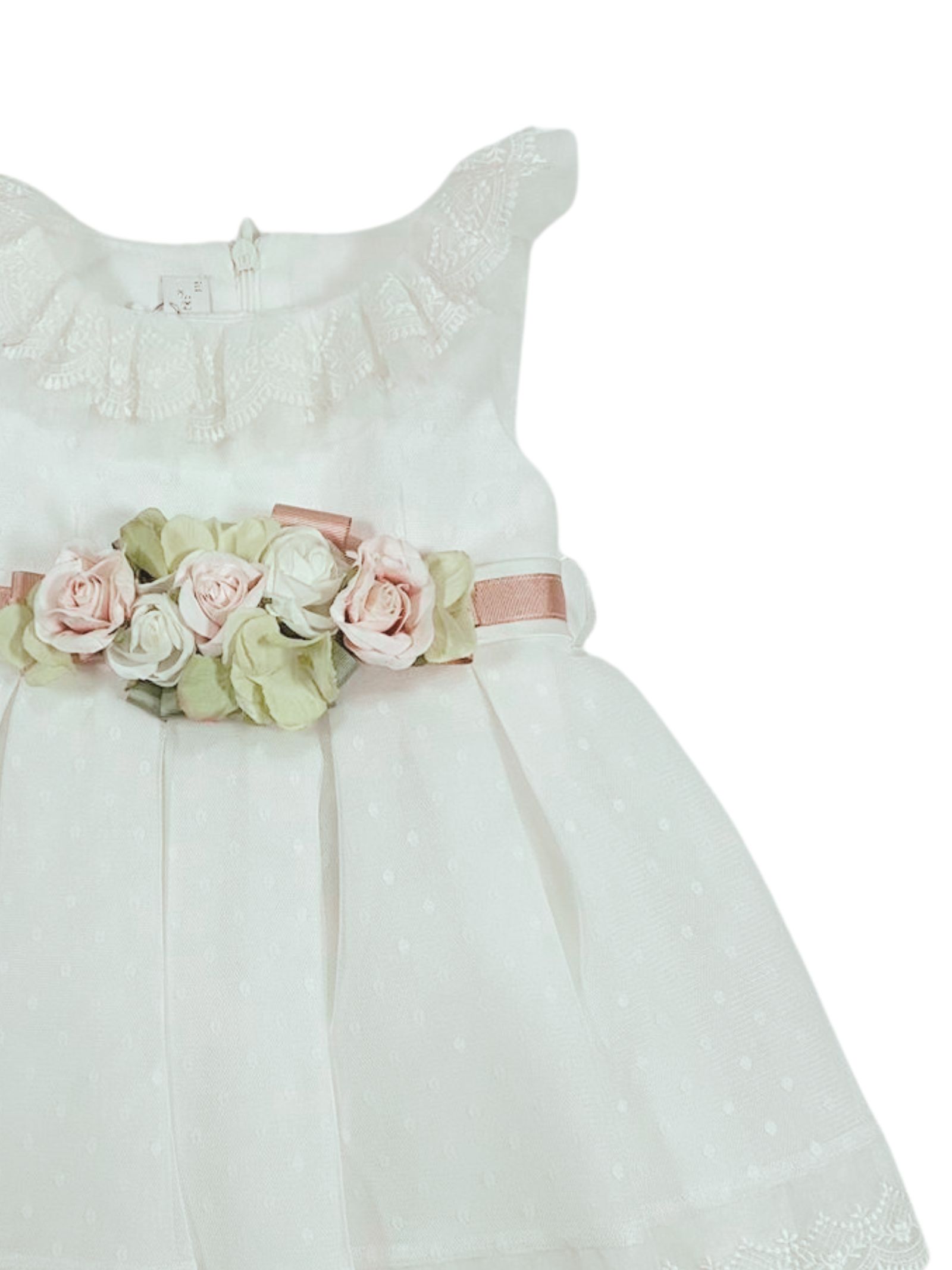 Colorichiari Kids abito cerimonia di colore bianco, giromaniche, cintura a contrasto rosa con applicazione centrale fiori, scollo rotondo con tulle, zip sul retro, foderato, strato superiore in tulle con ricami. Composizione: 100% poliestere. Made in Italy