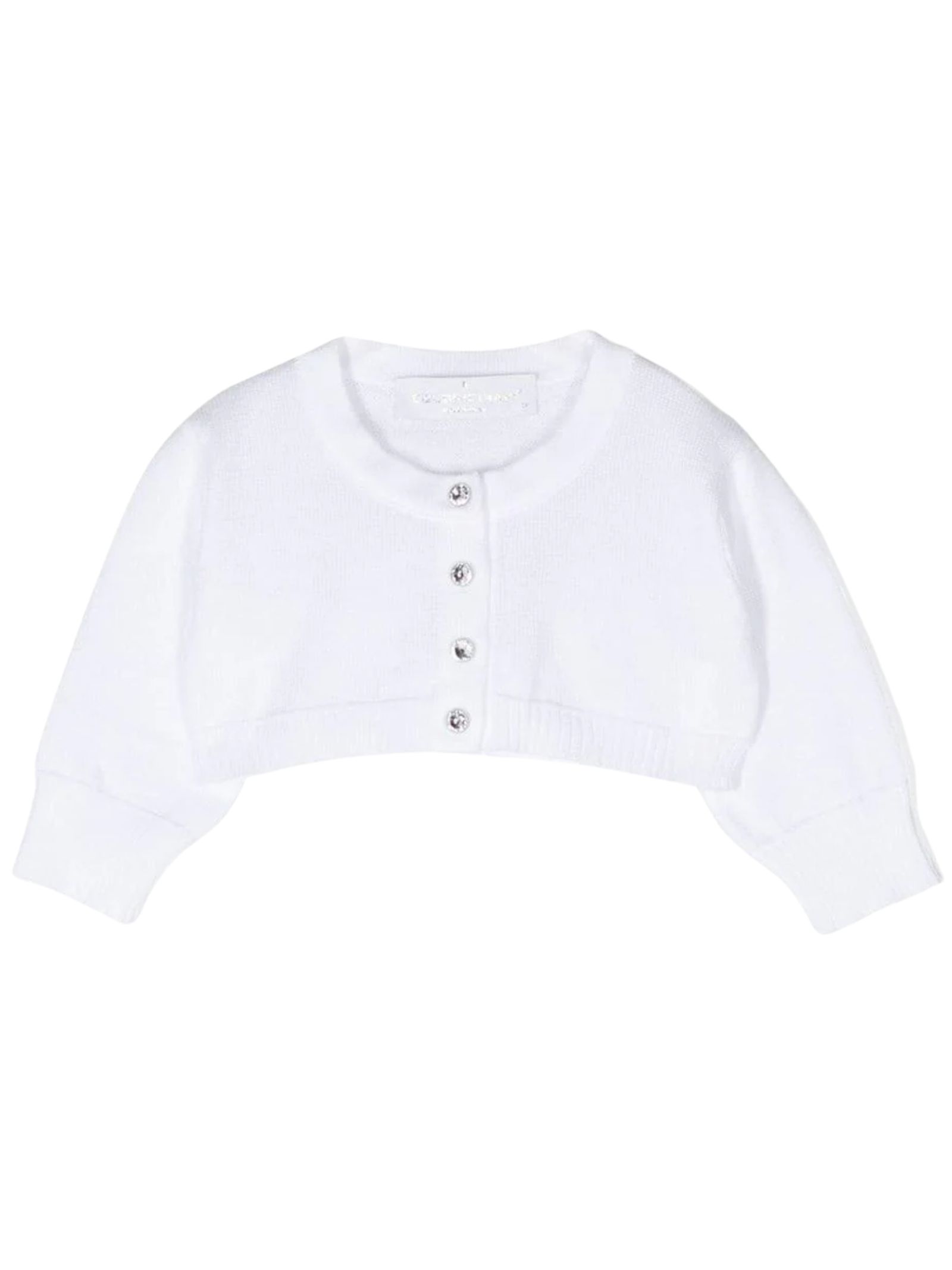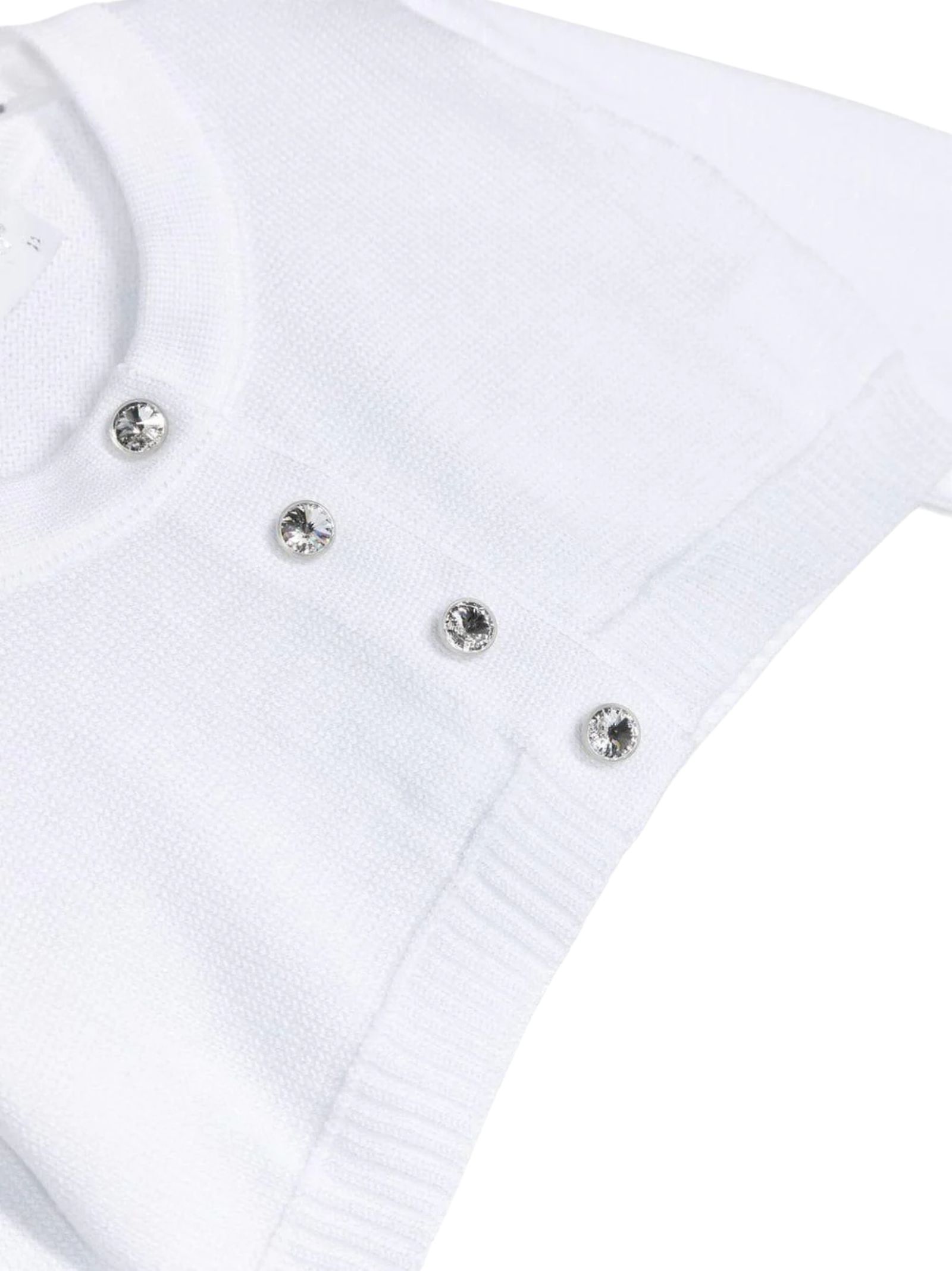 COLORICHIARI Kids cardigan di colore bianco, lavorazione a maglia, bottoni decorati con cristalli, girocollo, chiusura frontale con bottoni, maniche lunghe, polsini e orlo a coste. Composizione: 100% cotone. Made in Italy