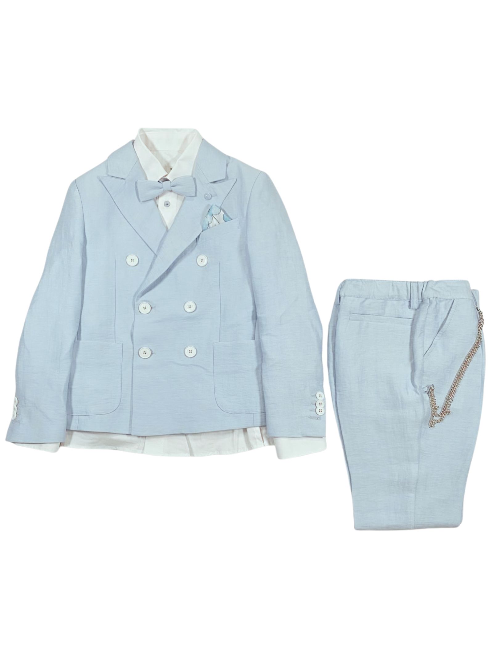 Colorichiari Kids completo abito cerimonia di colore azzurro, composto da giacca doppiopetto fodera in viscosa, camicia bianca, papillon e fazzoletto abbinati; pantalone classico con vita regolare e applicazione catena estraibile, vestibilità regolare. Composizione: 88% lino 12% poliammide. Made in Italy