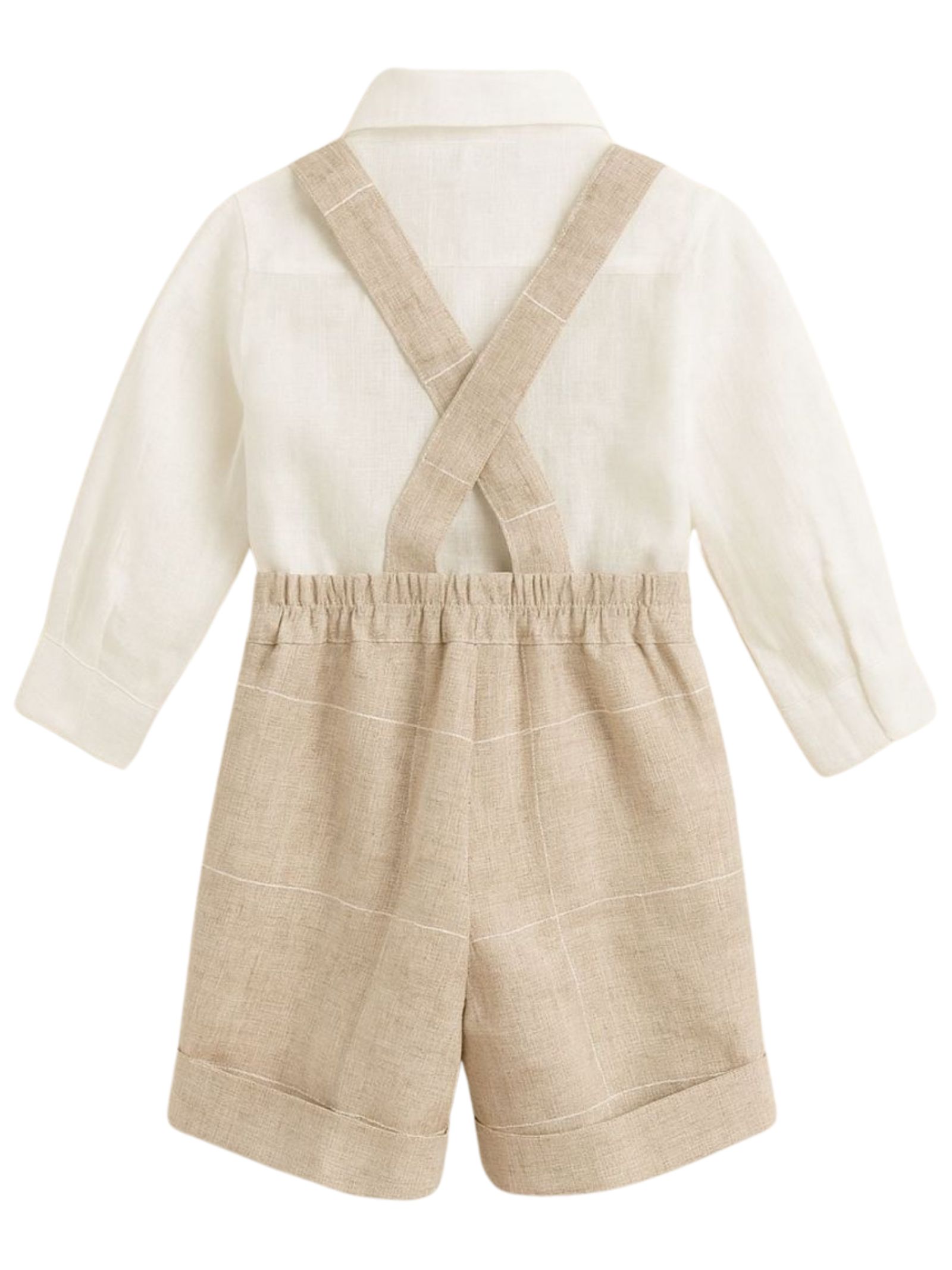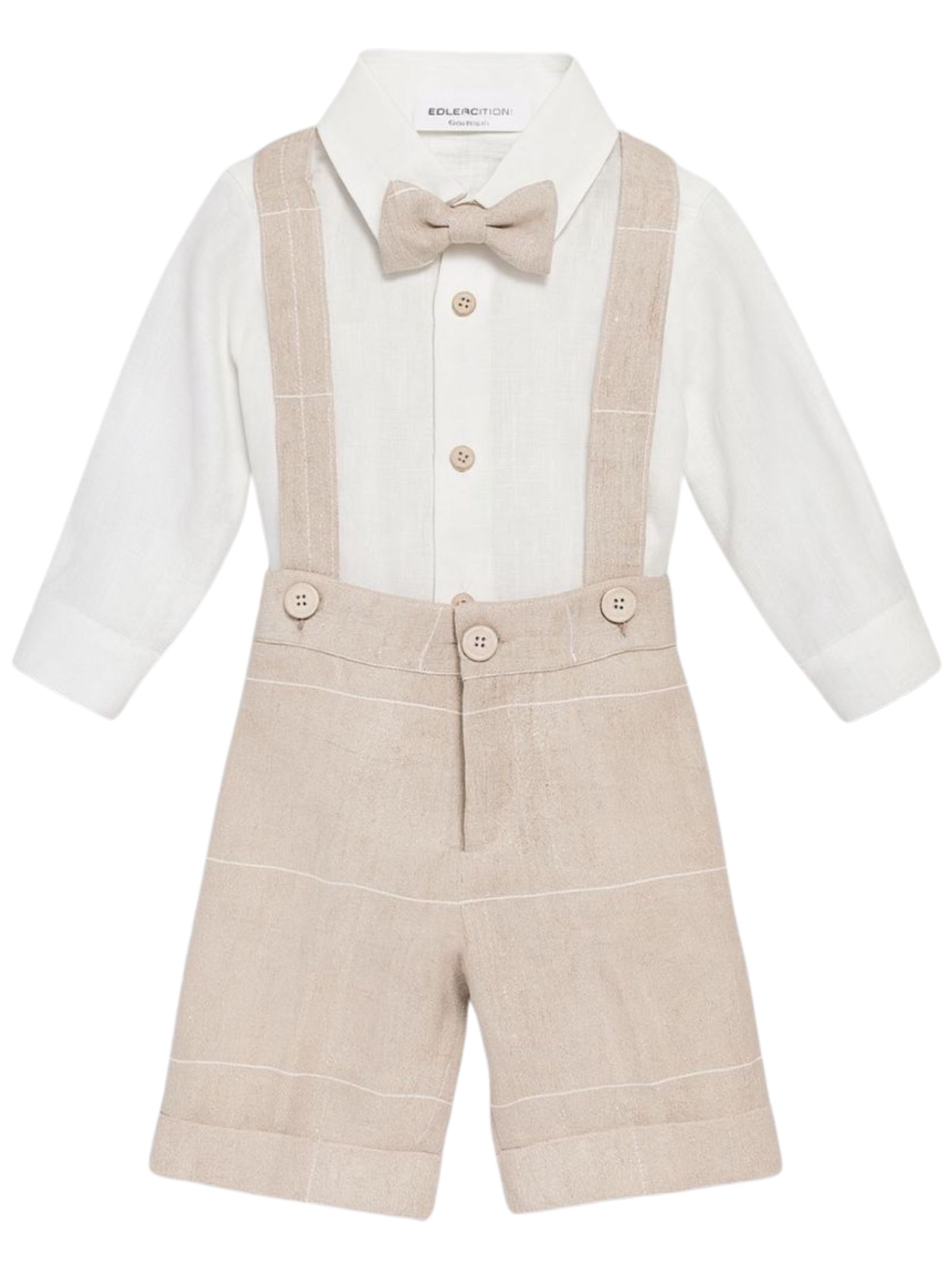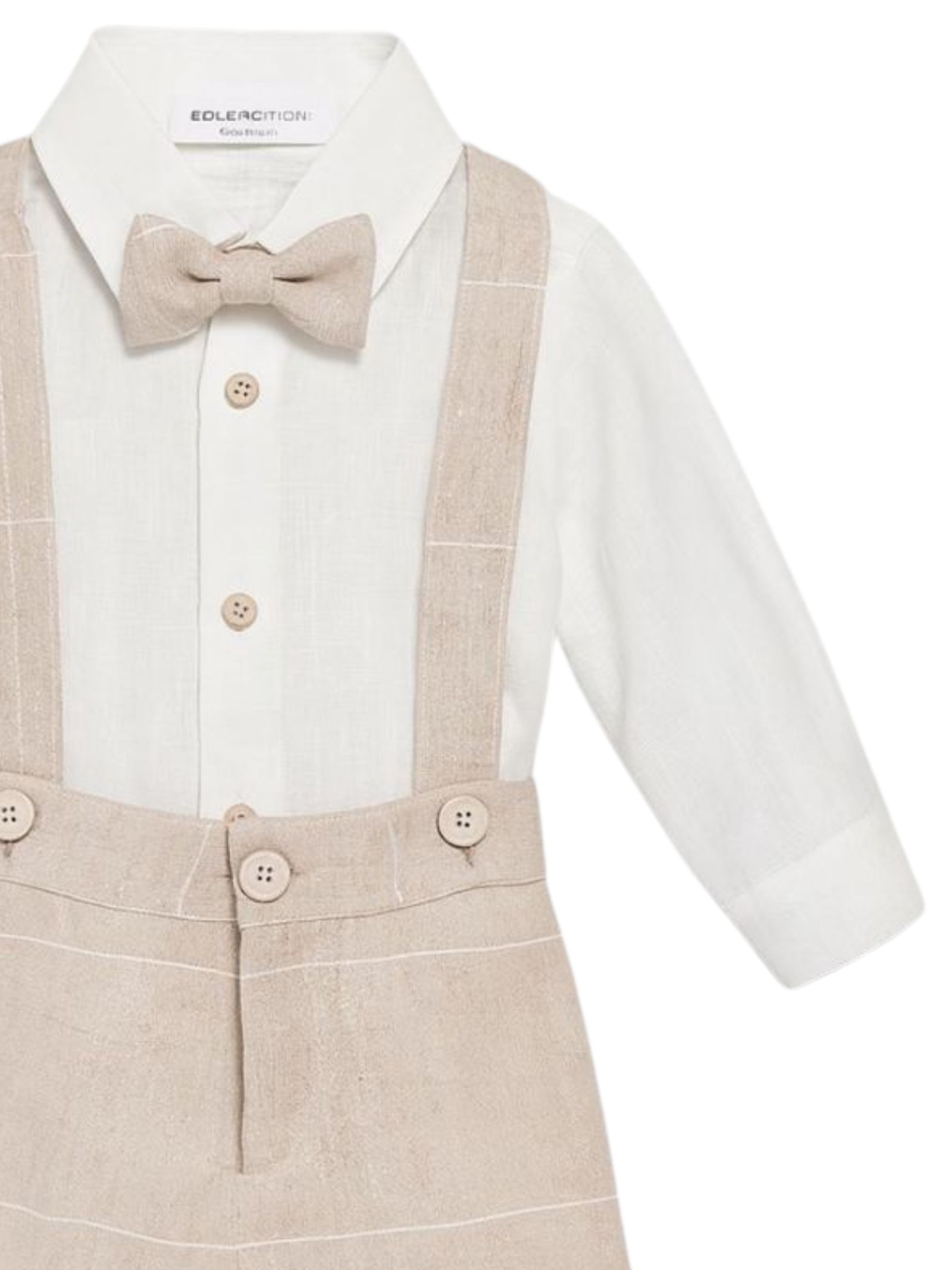 Colorichiari Kids completo cerimonia di colore bianco/sabbia, design con bretelle, camicia maniche lunghe, papillon abbinato. Composizione: 100% lino. Made in Italy