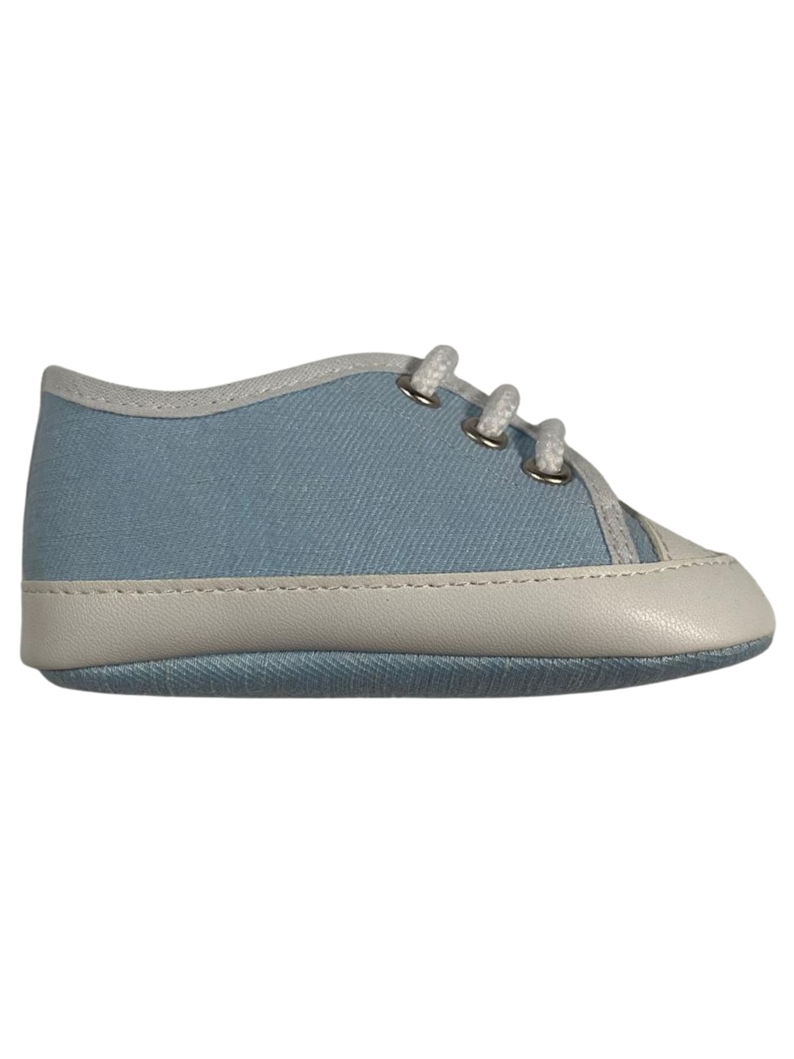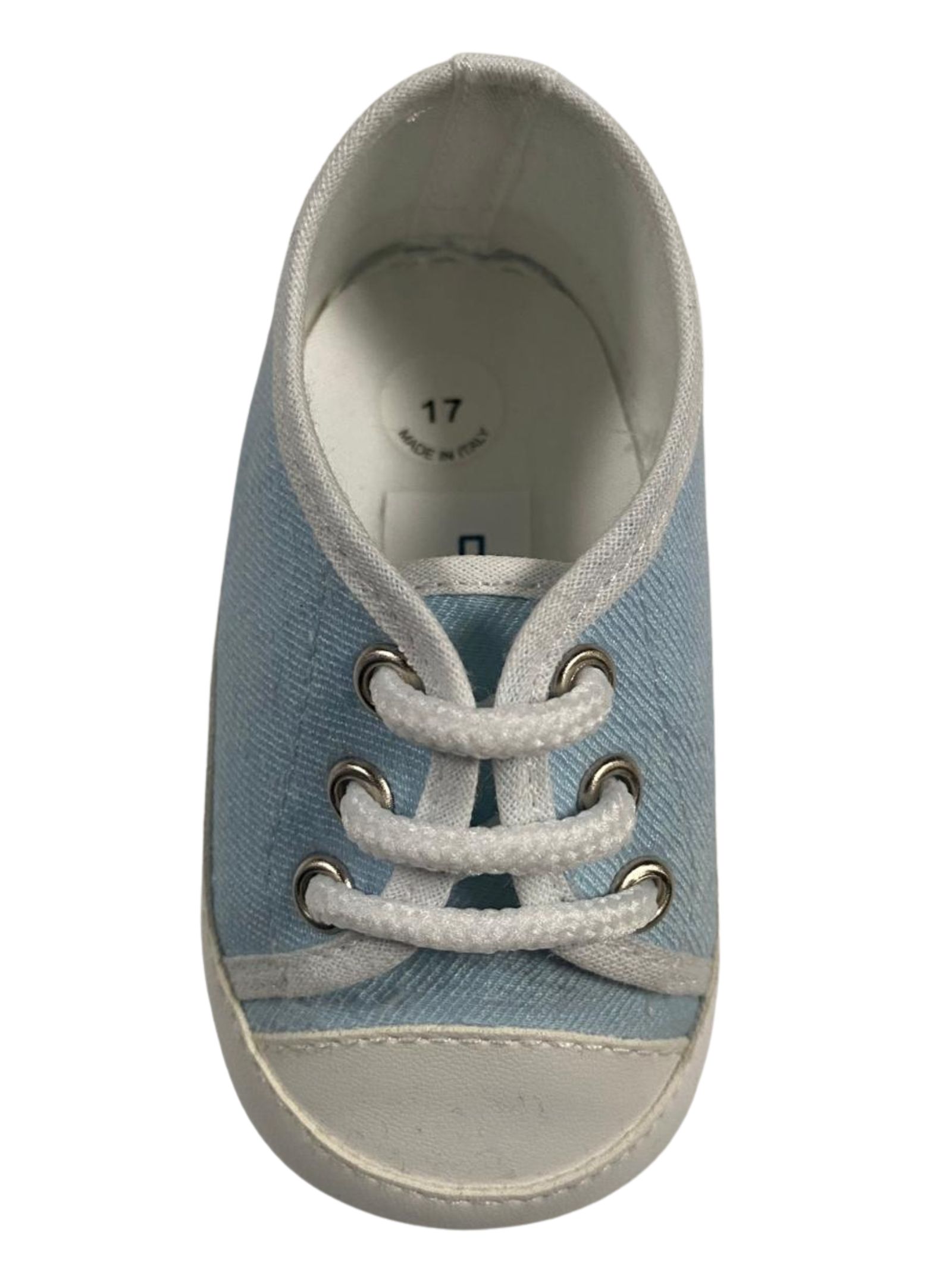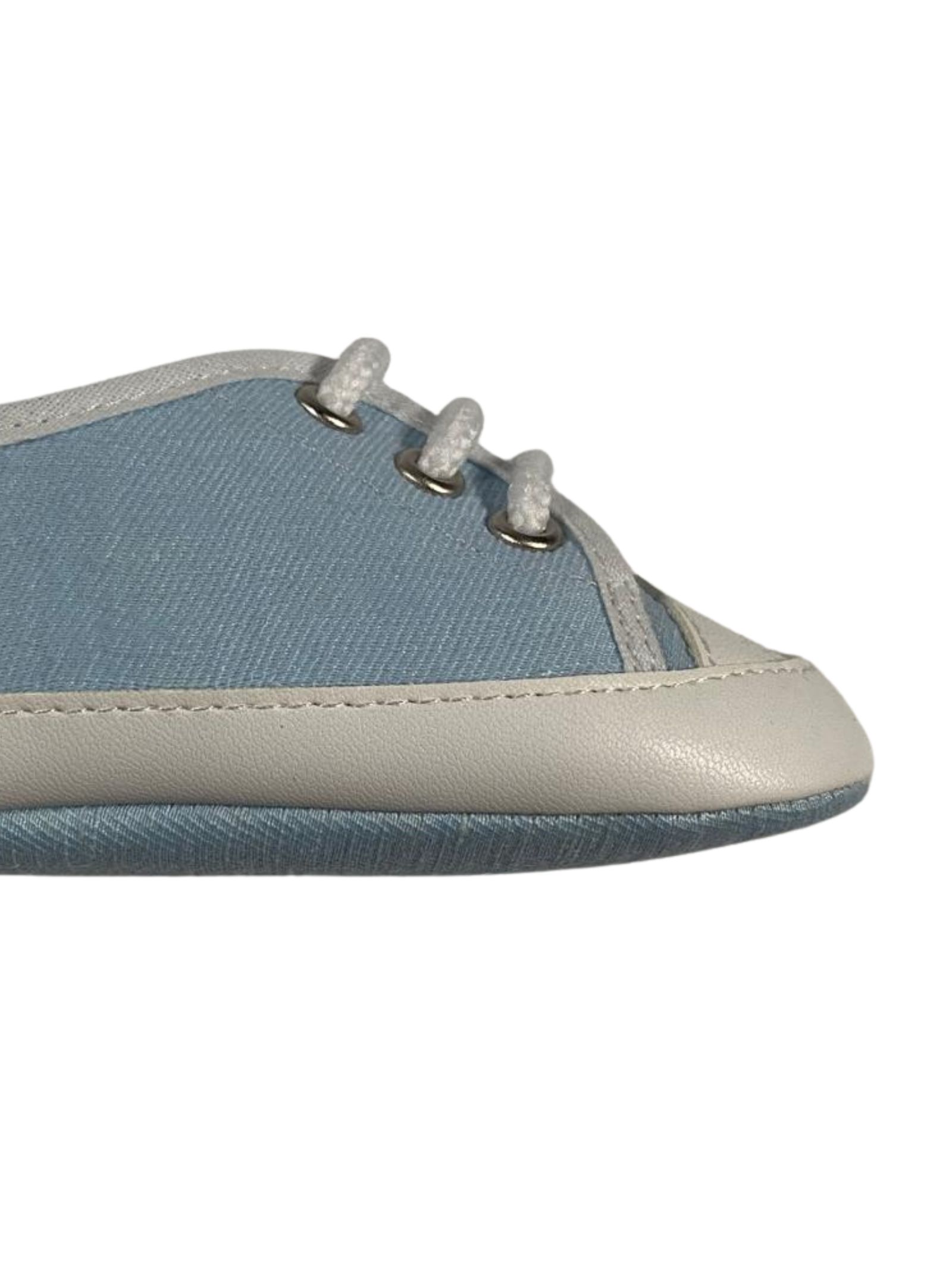 Colorichiari Kids scarpe pre-walk realizzate in cotone di colore azzurro, modello con lacci, punta tonda, dettagli in pelle a contrasto bianco, suoletta con logo. Composizione: 80% cotone 20% poliammide. Made in Italy