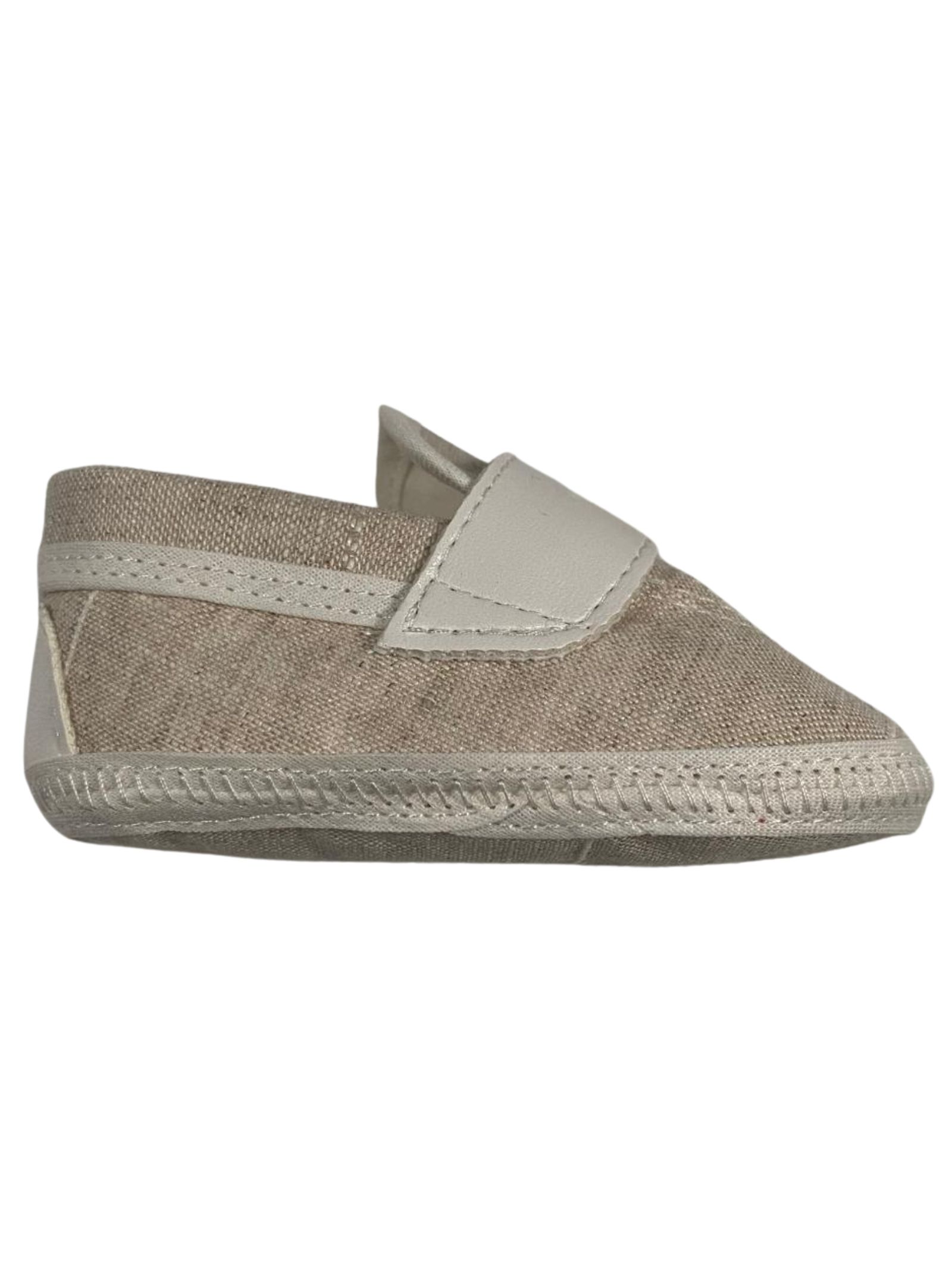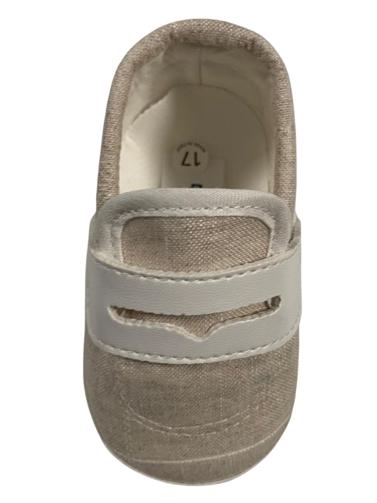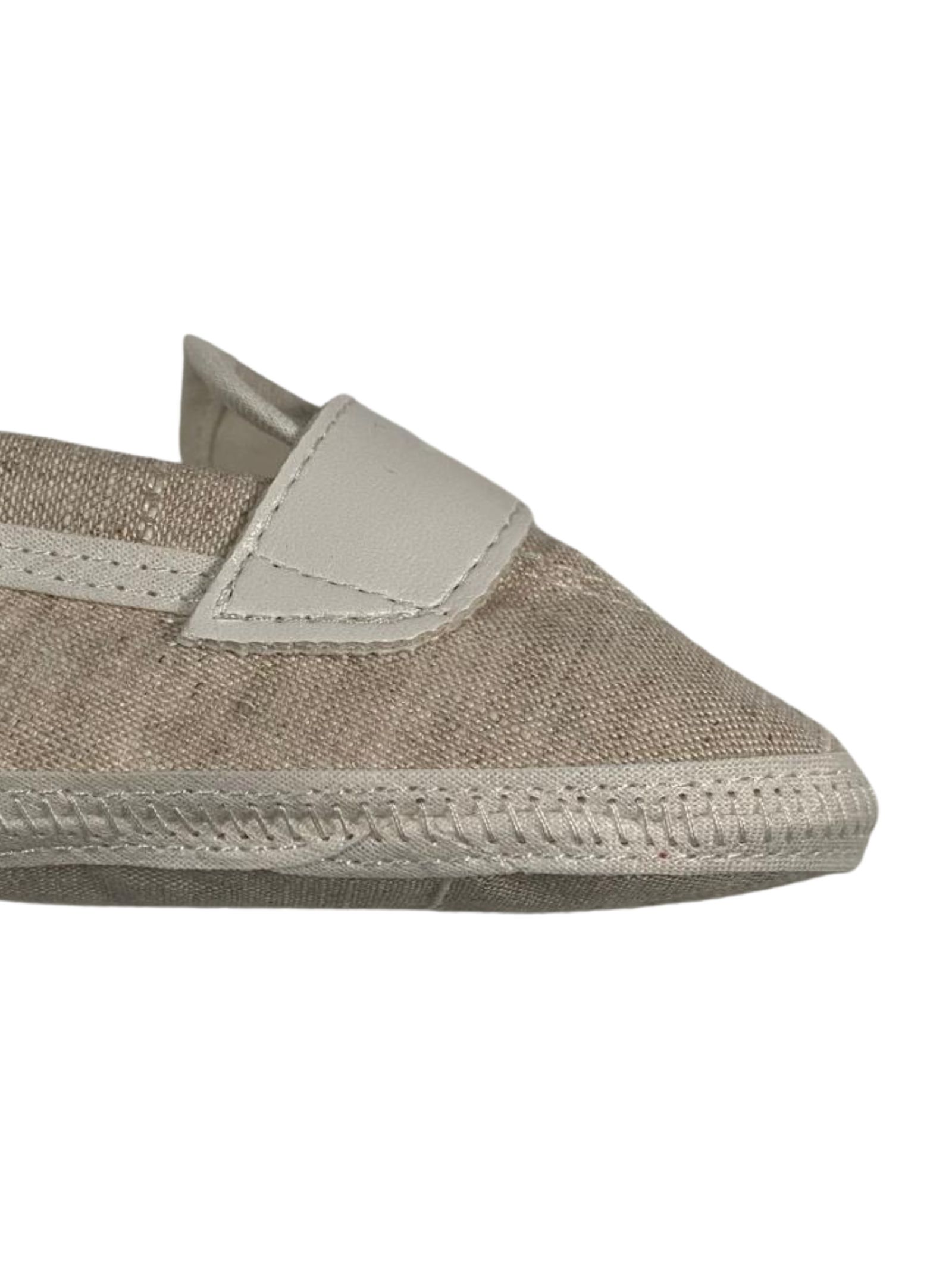 Colorichiari Kids scarpe pre-walk realizzate in lino di colore sabbia, modello mocassino, dettagli in pelle a contrasto bianco, suoletta con logo. Composizione: 88% lino 12% poliammide. Made in Italy
