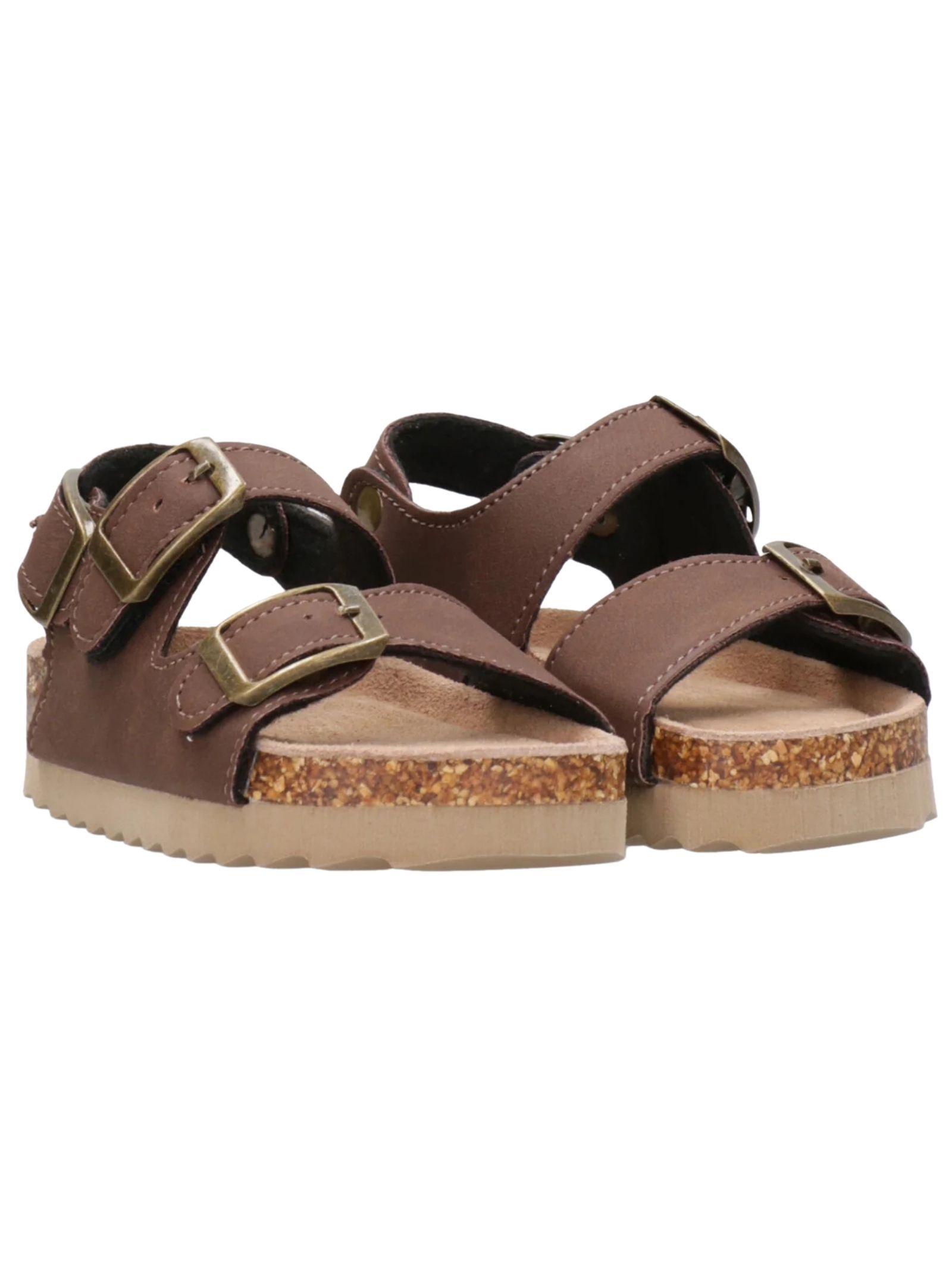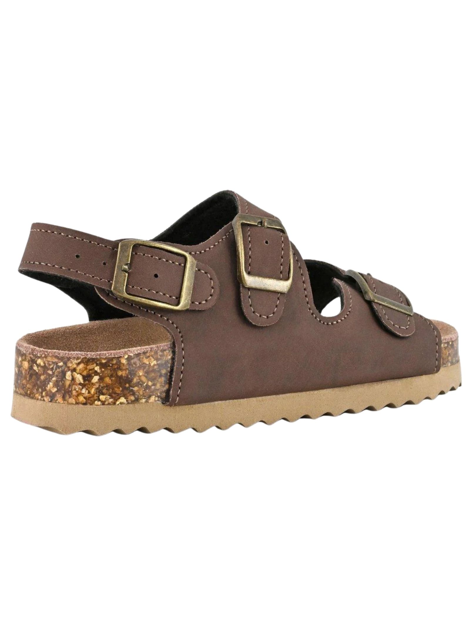 Colors of California Kids sandali in pelle di colore marrone, tre cinturini regolabili, chiusura frontale con velcro, soletta in camoscio, suola in gomma antiscivolo a contrasto beige.
