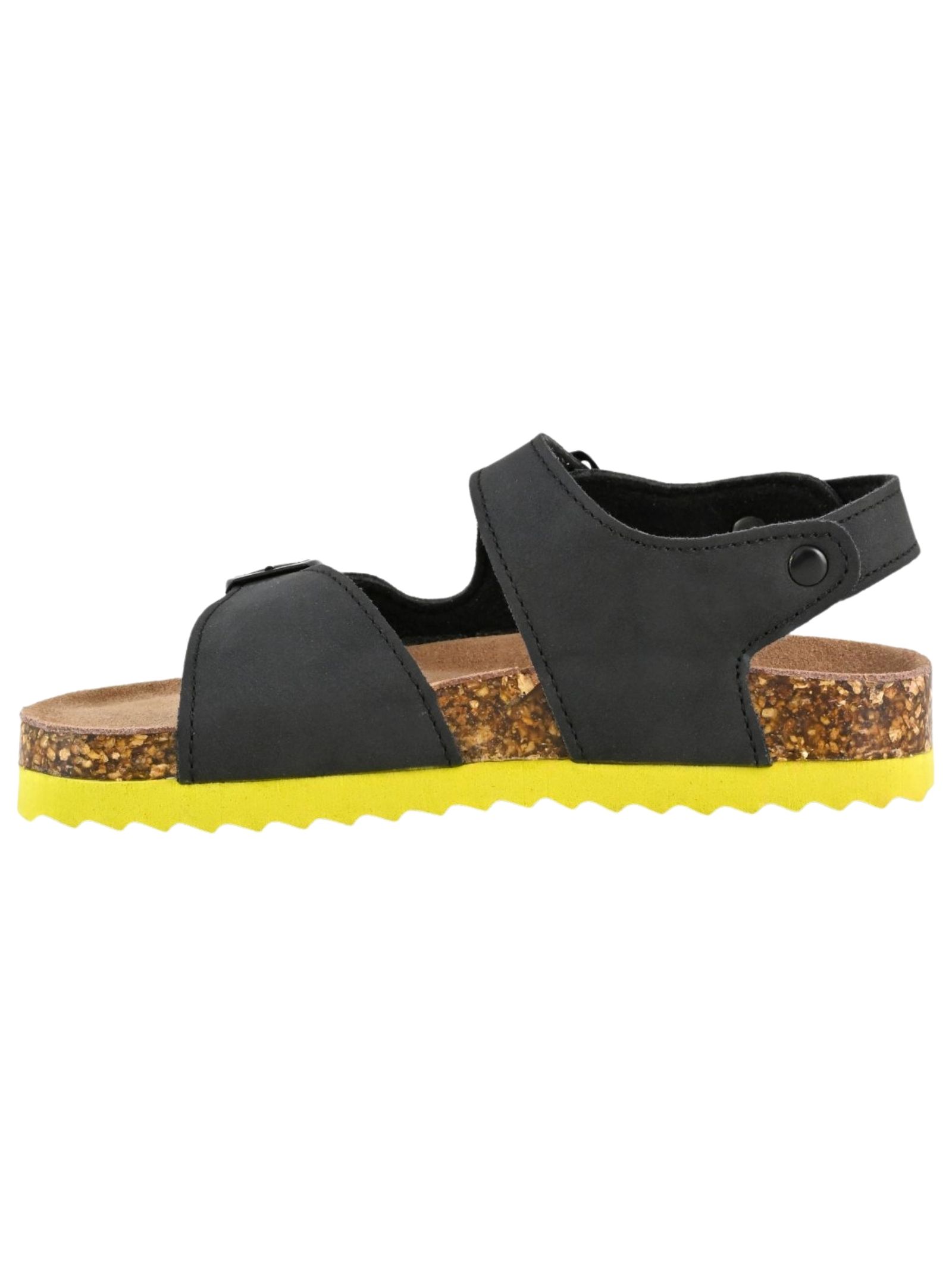 Colors of California Kids sandali in pelle di colore nero, tre cinturini regolabili, chiusura frontale con velcro, soletta in camoscio, suola in gomma antiscivolo a contrasto giallo.