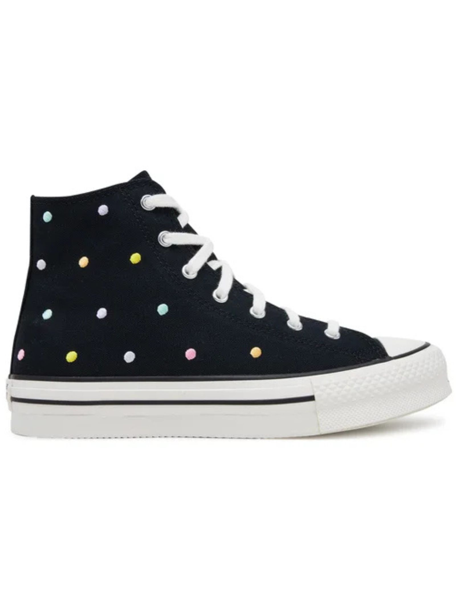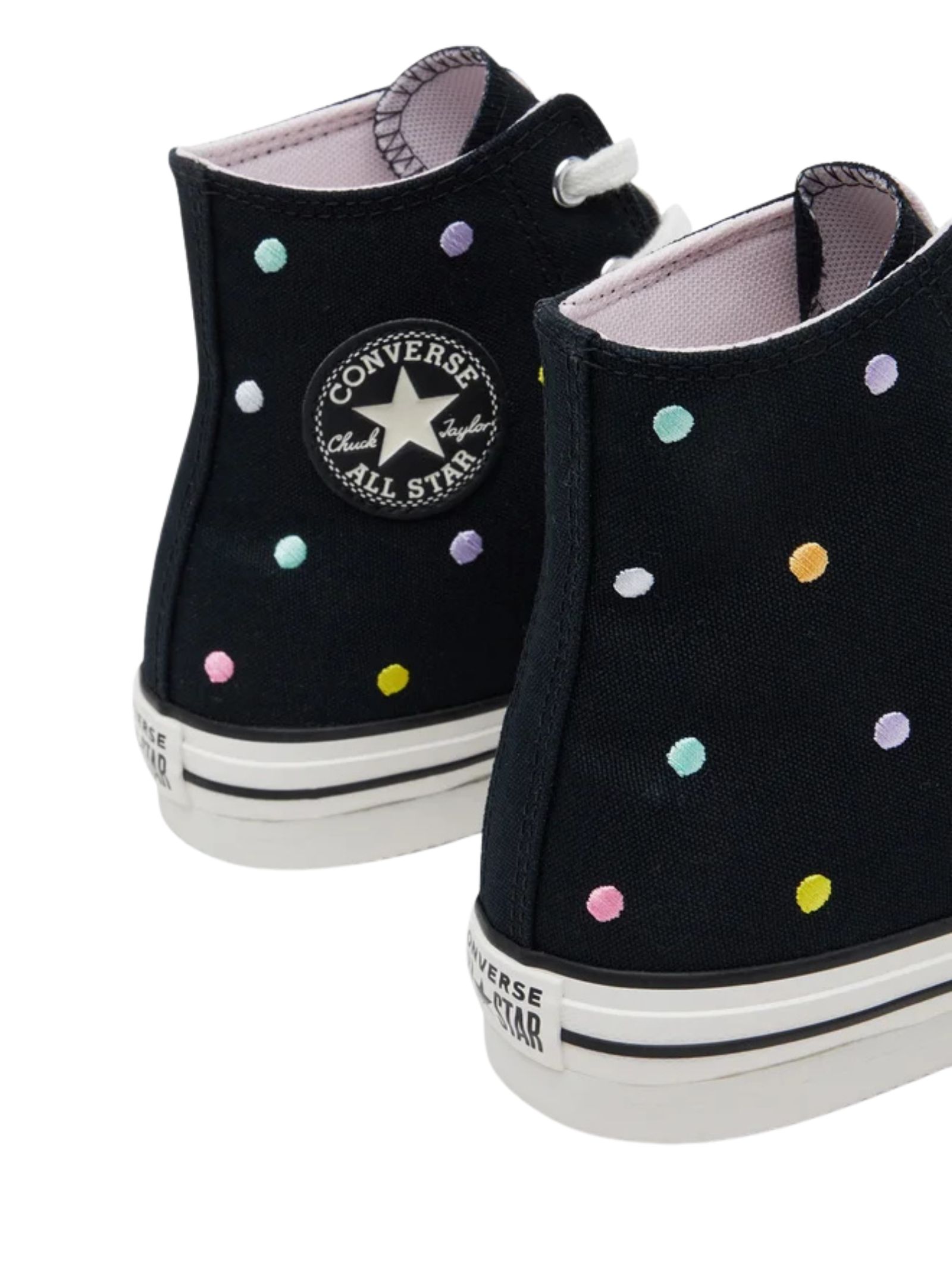 CONVERSE Kids Sneakers in tela di colore nero, con suola platform in gomma, lacci e punta tonda; ammortizzazione in morbida schiuma sotto il piede per un comfort ottimale, decorate con iconica patch Chuck Taylor su un lato e pois multicolor ricamati all-over. Composizione: 100% tessili