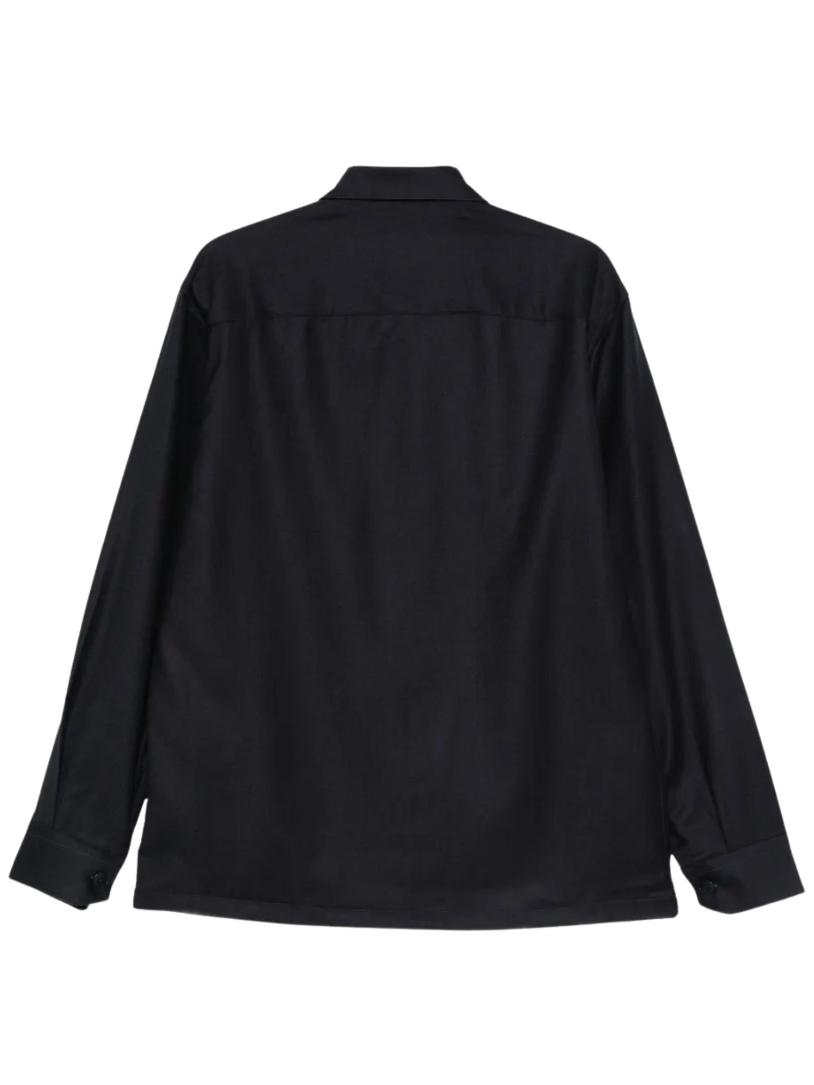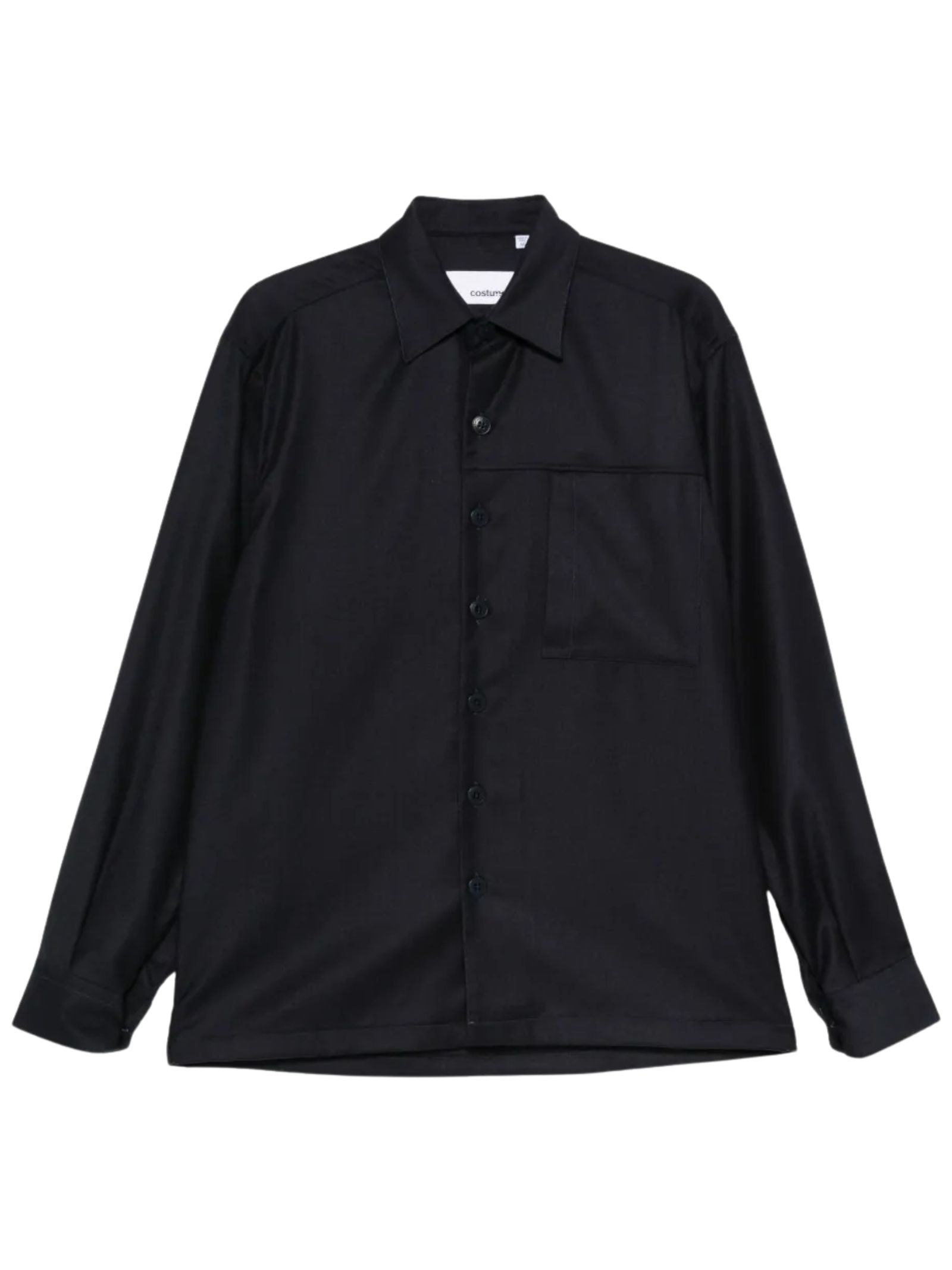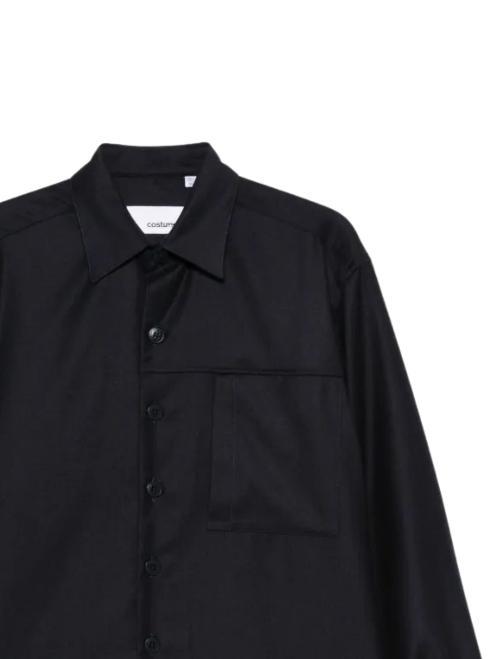 Costumein Kids camicia realizzata in fresco lana modello Timisoara di colore blu scuro, colletto classico, maniche lunghe, chiusura frontale con abbottonatura, tasca applicata sul petto, orlo curvo, vestibilità regolare. Made in Italy