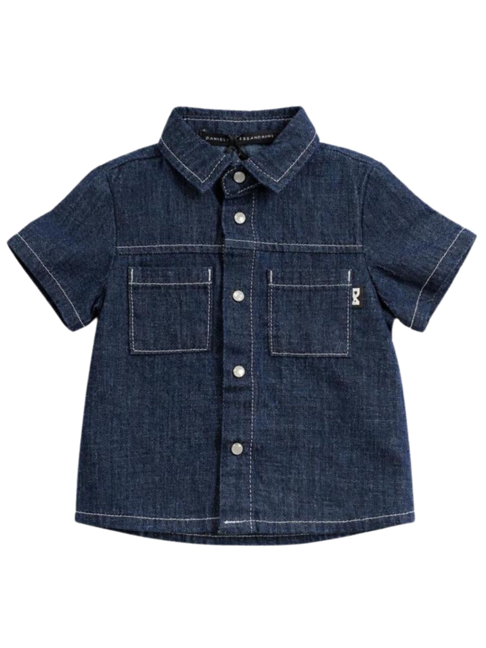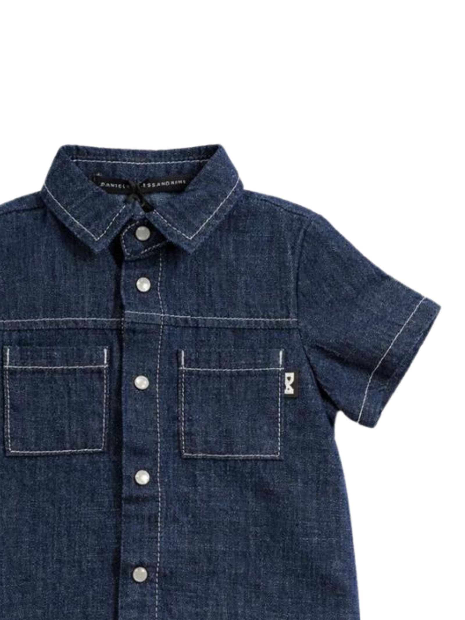 Daniele Alessandrini Kids camicia in jeans di colore blu, cuciture a vista, due tasche sul petto, mezza manica, bottoni automatici, vestibilità regolare. Composizione: 100% cotone