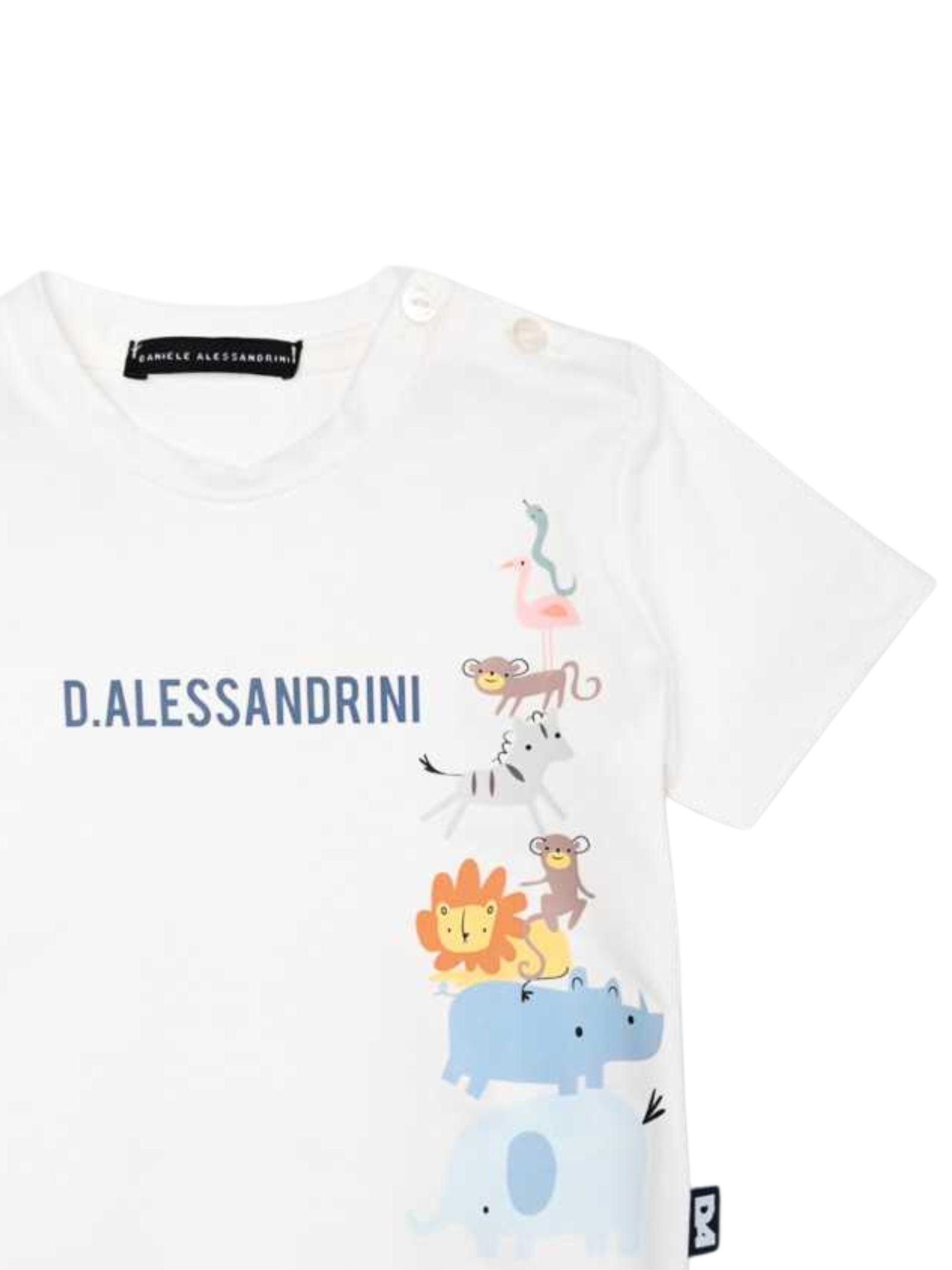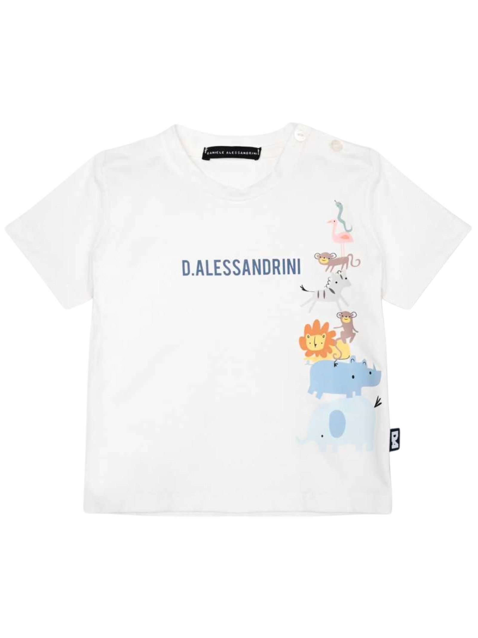 Daniele Alessandrini Kids t-shirt di colore bianco, modello girocollo, mezze maniche, stampa con logo a contrasto, apertura con bottoni sulla spalla, orlo dritto, vestibilità regolare. Composizione: 90% cotone 10% elastan. Made in Italy