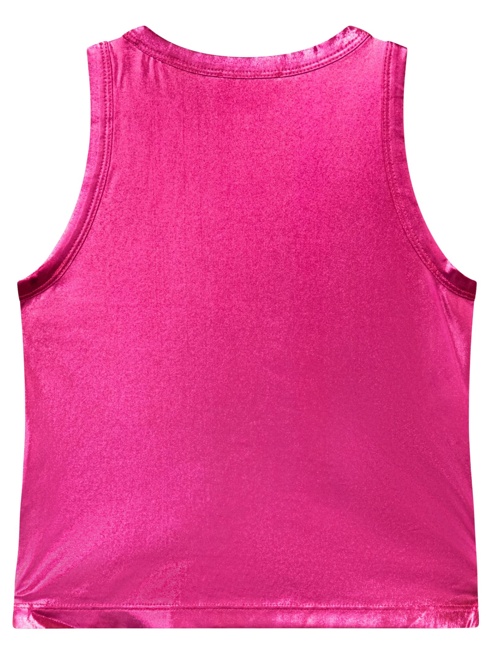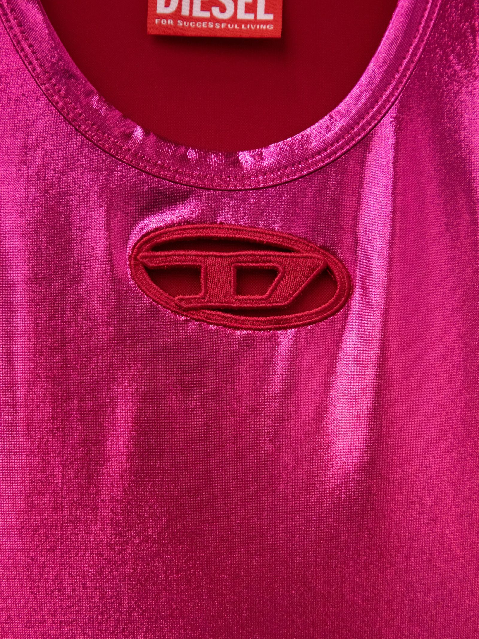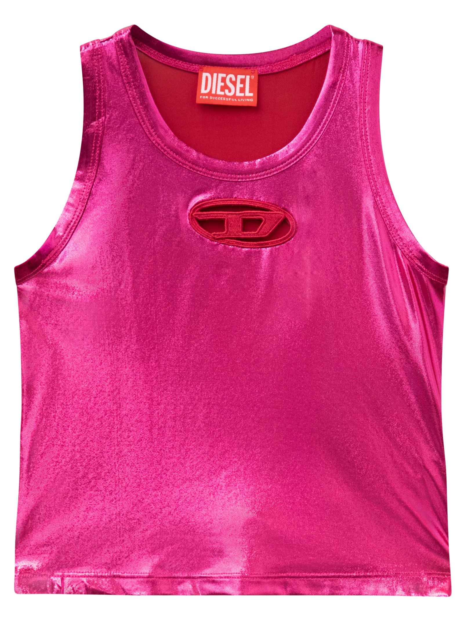 Diesel Kids top di colore fucsia metallizzato, modello corto, girocollo, ricamo traforato iniziale logo centrale, design aderente. Composizione: 96% poliestere 4% elastan