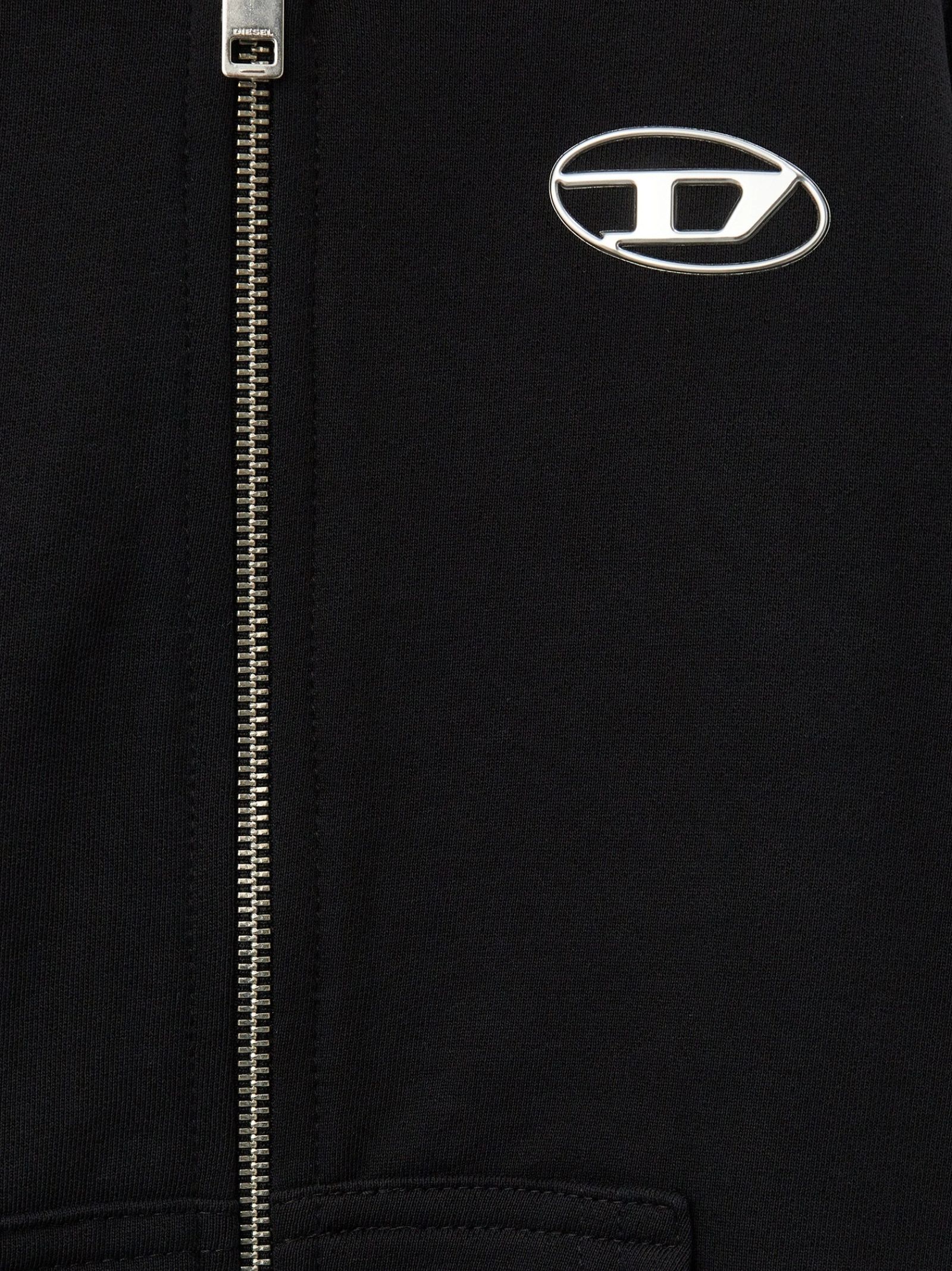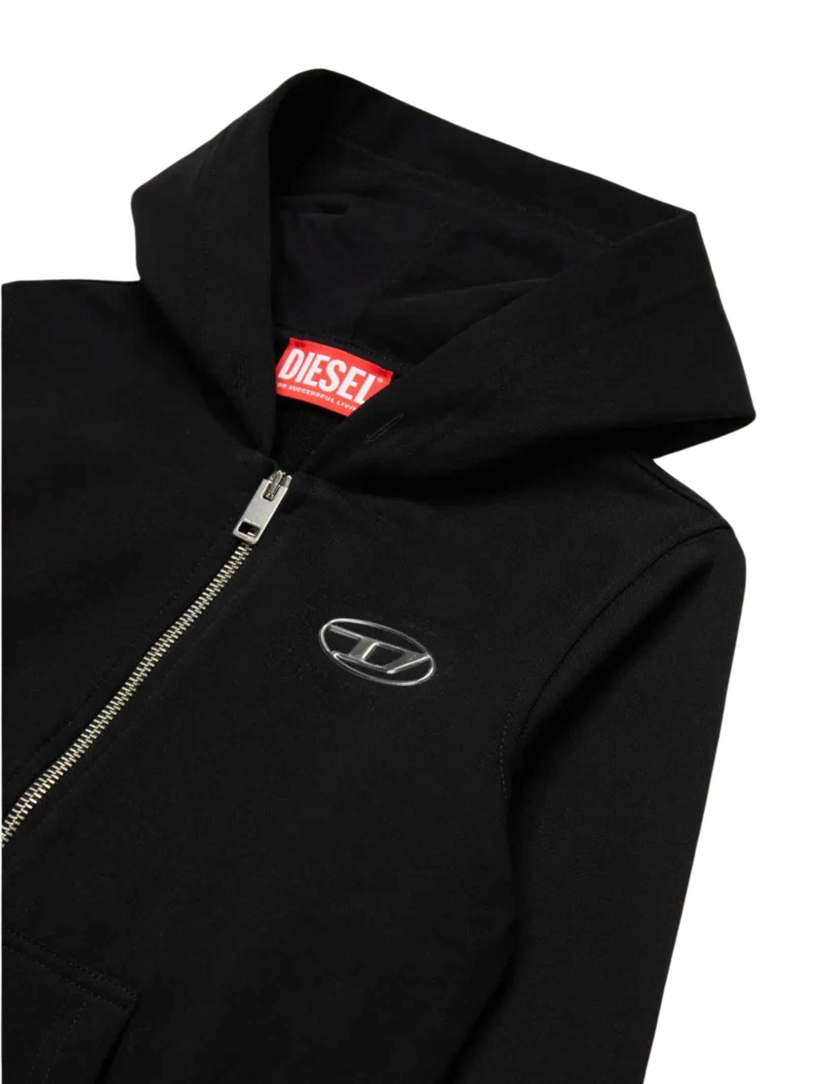 Diesel Kids felpa di colore nero, design con cappuccio, maniche lunghe, logo Oval D effetto metallizzato sul petto, chiusura con zip, due tasche laterali, lavorazione a costine su polsini e fondo. Composizione: 100% Cotone