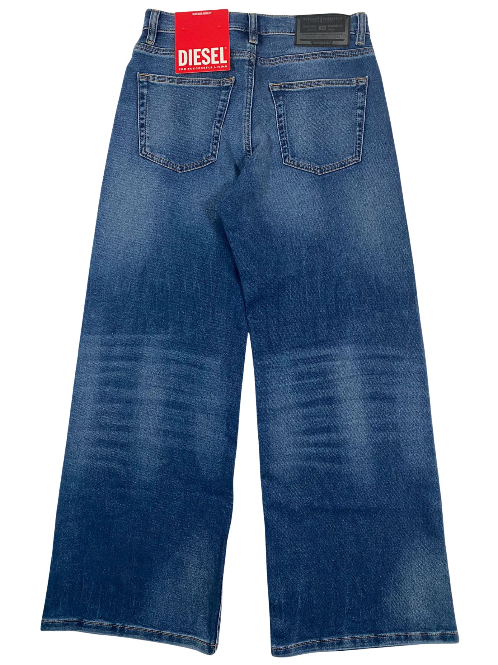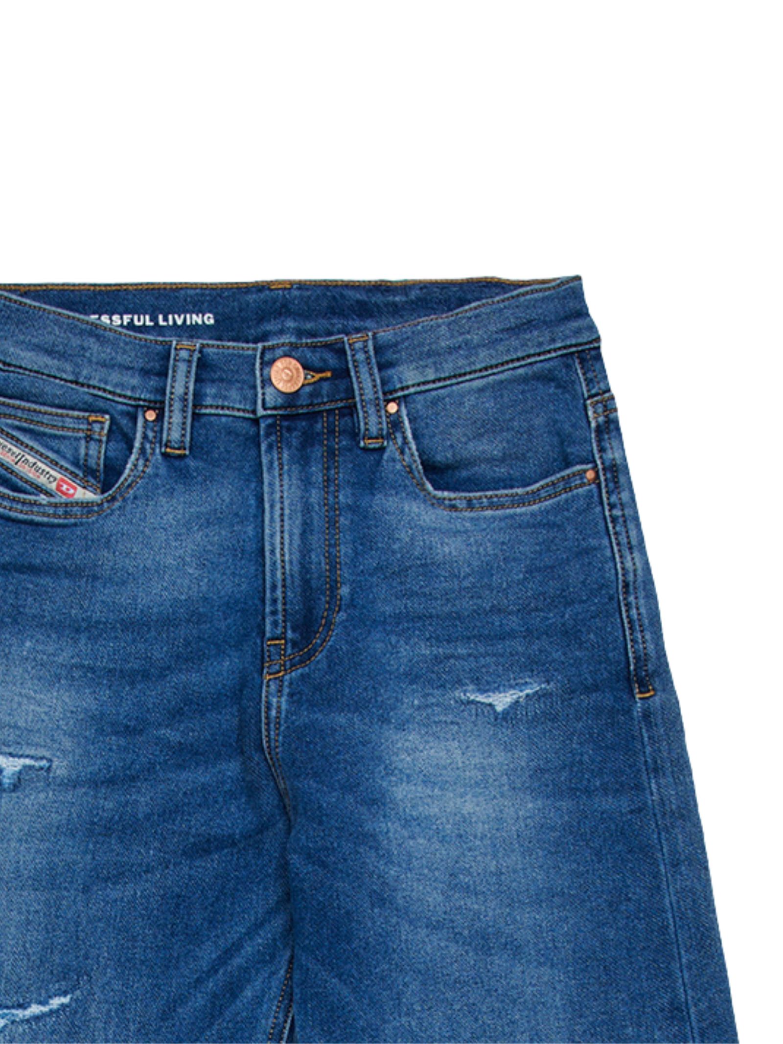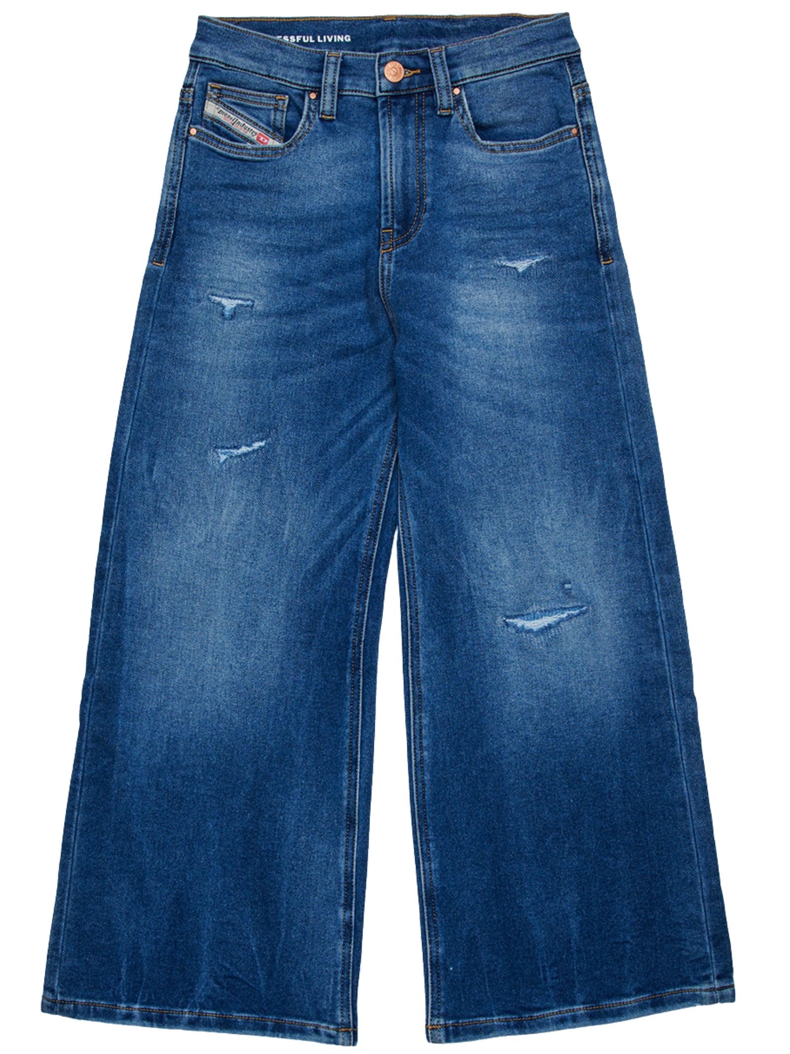 Diesel Kids jeans dal lavaggio blu scuro caratterizzato da sbiaditure, modello 5 tasche, con passanti per cintura, chiusura frontale con zip e bottone, vita regolabile grazie ad elastico interno con bottoni e finti strappi dall'effetto usurato, decorati con patch logato sulla parte posteriore, vestibilità gamba ampia. Composizione: 82% cotone 16% poliestere 2% elastan