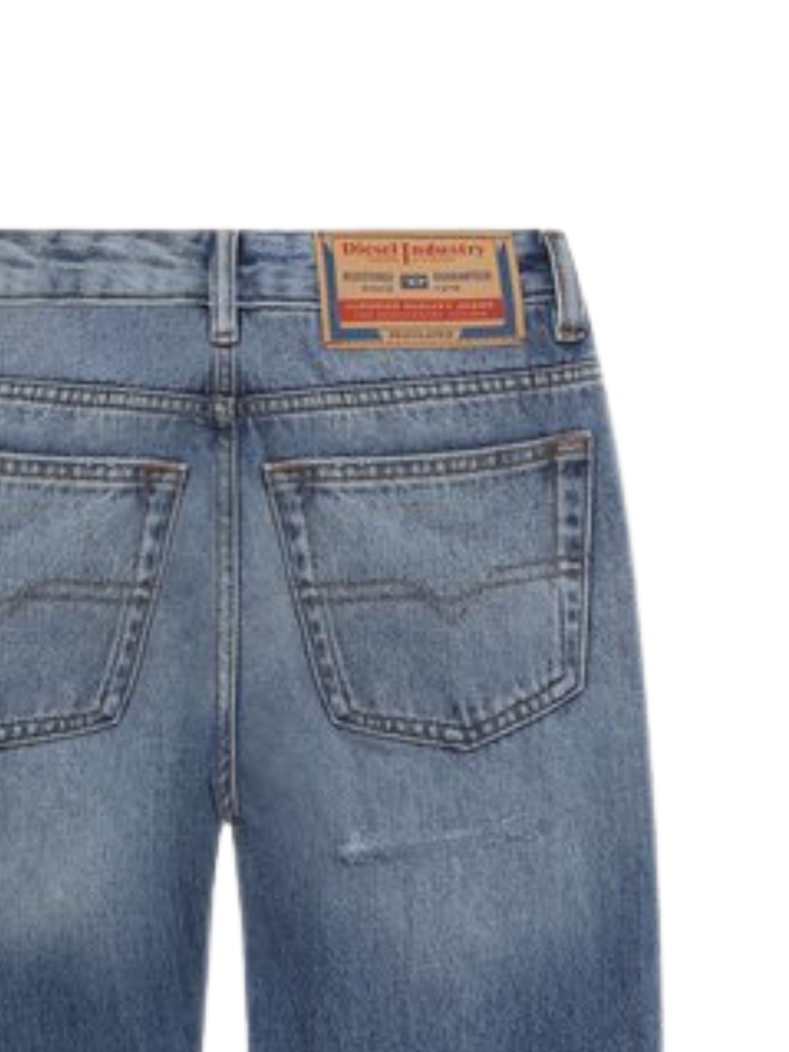 Diesel Kids jeans dal lavaggio blu medio caratterizzato da sbiaditure, modello 5 tasche, con passanti per cintura, chiusura frontale con zip e bottone, vita regolabile grazie ad elastico interno con bottoni e finti strappi dall'effetto usurato, decorati con patch logato sulla parte posteriore, vestibilità regolare. Composizione: 100% cotone