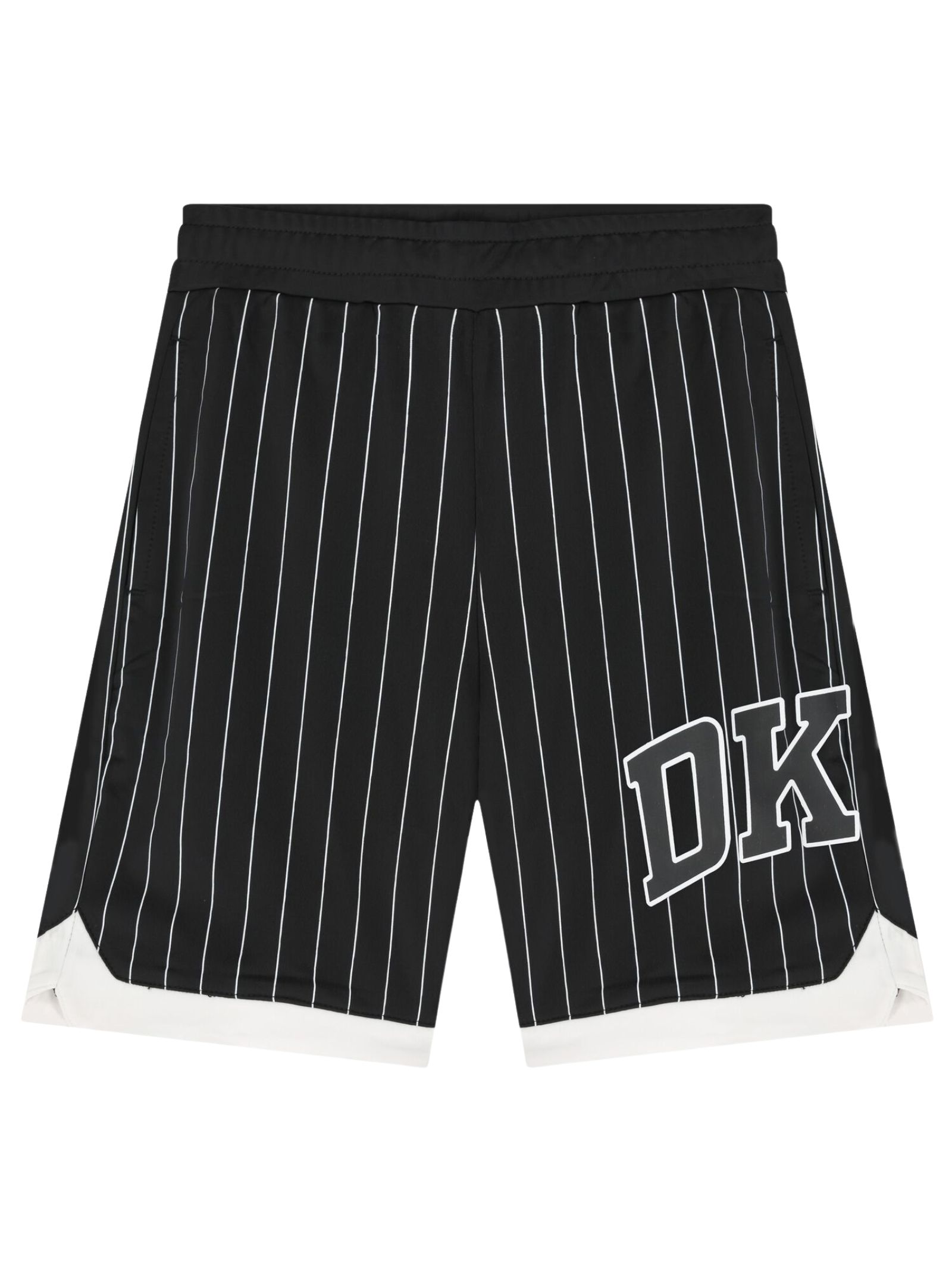 DKNY Kids bermuda di colore nero in fantasia a righe bianco, elastico in vita con coulisse interna, due tasche laterali, stampa logo a contrasto, vestibilità allentata. Composizione: 88% poliestere 12% elastan