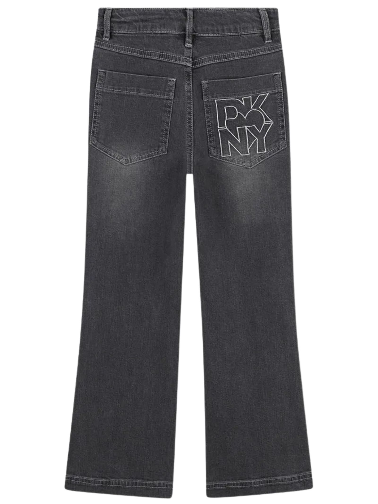 DKNY Kids jeans dal lavaggio grigio, dettaglio borchie, modello 5 tasche, design leggermente a zampa, vita regolabile all'interno, ricamo logo a contrasto sul retro, vestibilità regolare. Composizione: 99% cotone 1% elastan