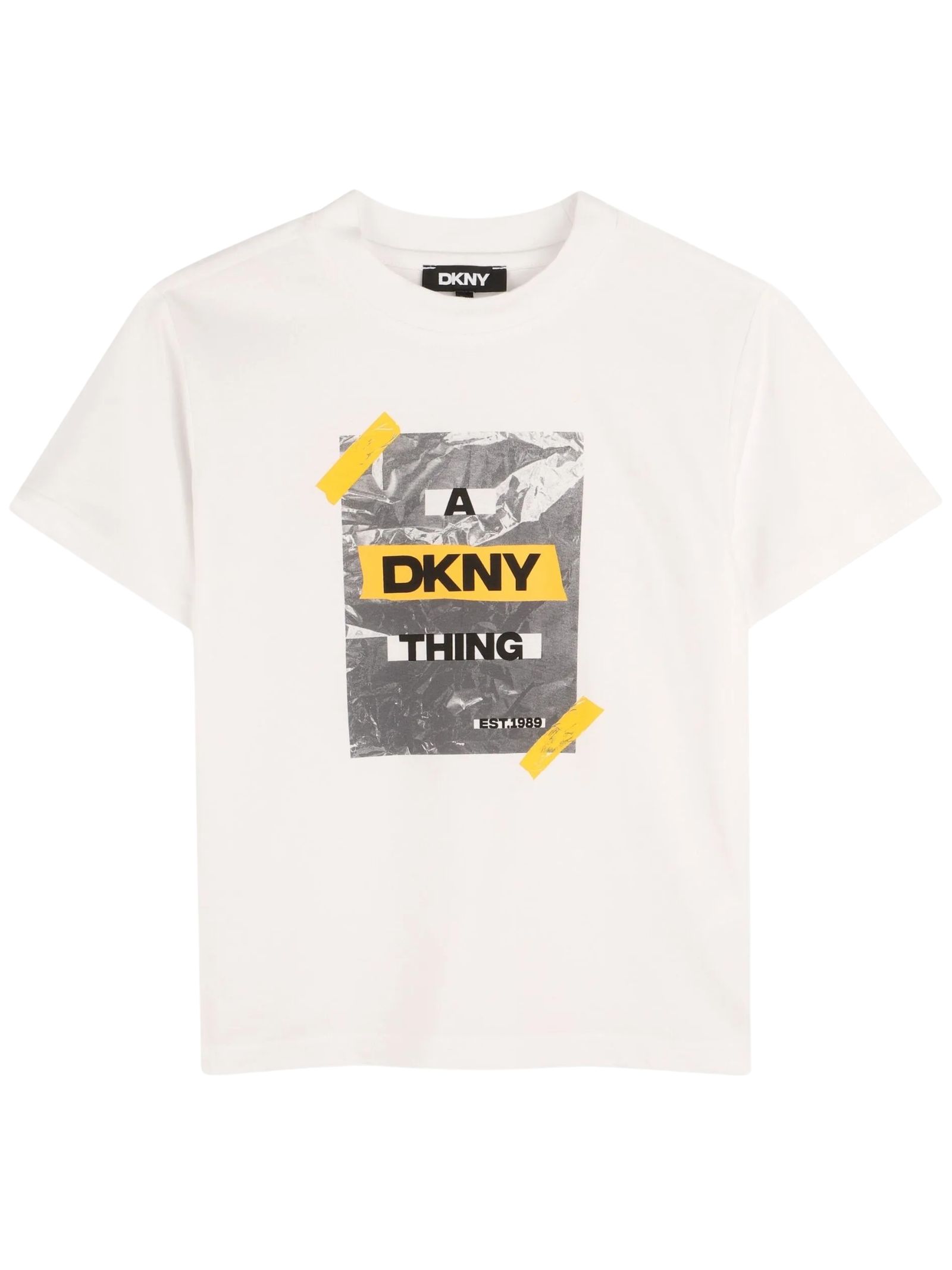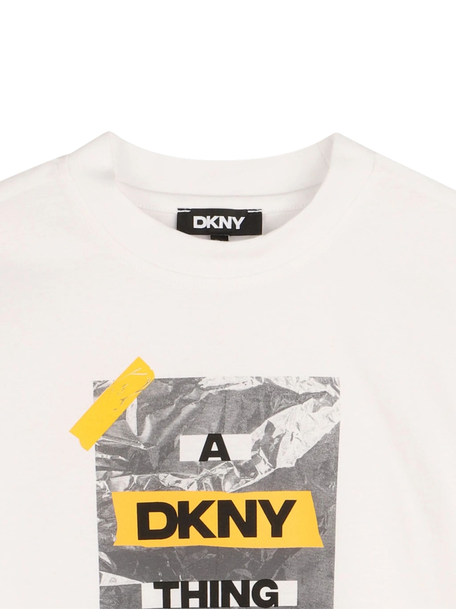 DKNY Kids t-shirt di colore bianco, modello girocollo, mezze maniche, stampa logo centrale a contrasto, orlo dritto, vestibilità regolare. Composizione: 100% cotone