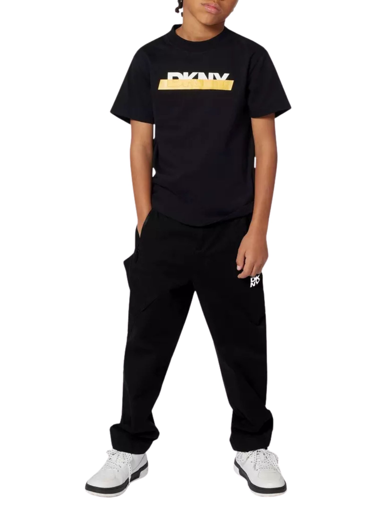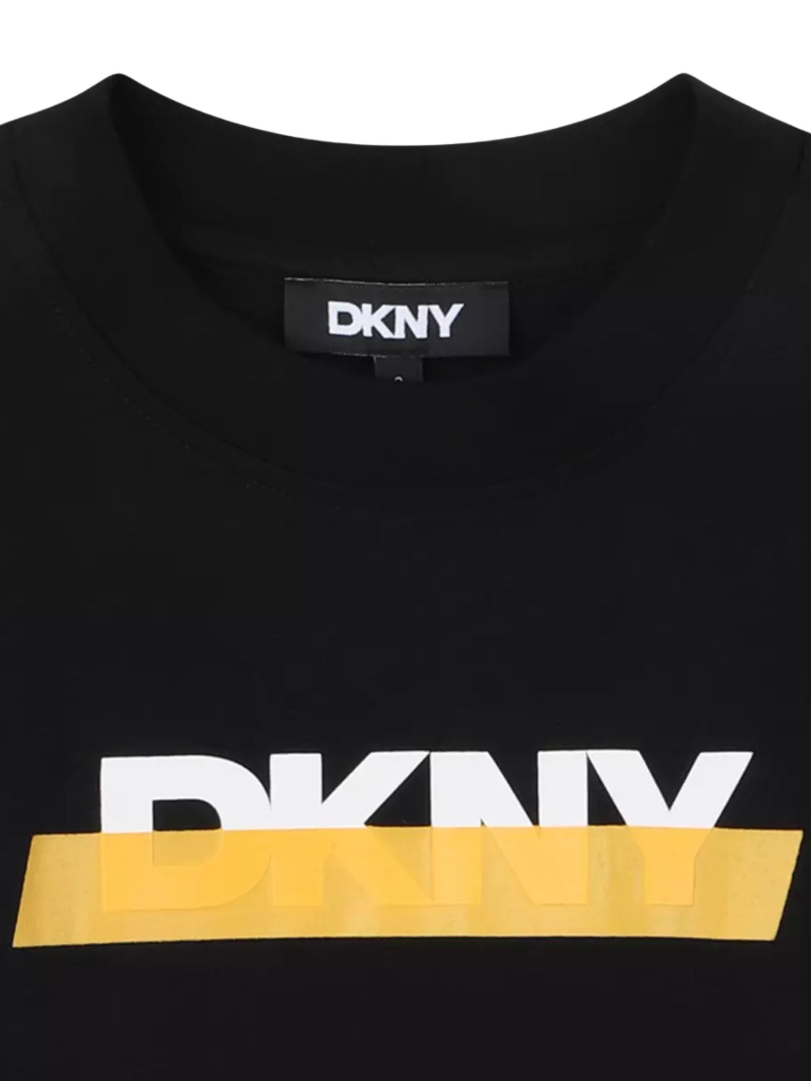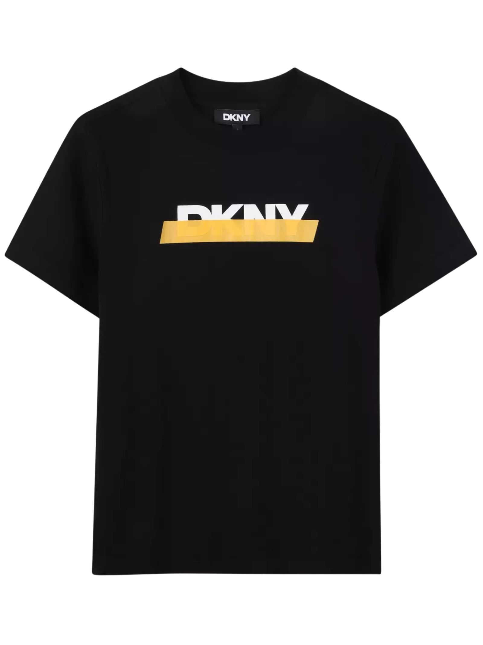 DKNY Kids t-shirt di colore nero, modello girocollo, mezze maniche, stampa logo centrale a contrasto, orlo dritto, vestibilità regolare. Composizione: 100% cotone