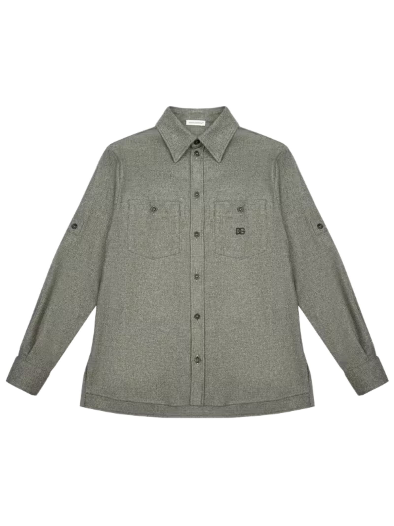 Dolce & Gabbana Kids camicia di colore grigio, ricamo a contrasto, due taschini sul petto, spacchetti laterali, orlo dritto, vestibilità regolare. Composizione: 85% poliestere 12% nylon 3% elastan. Made in Italy