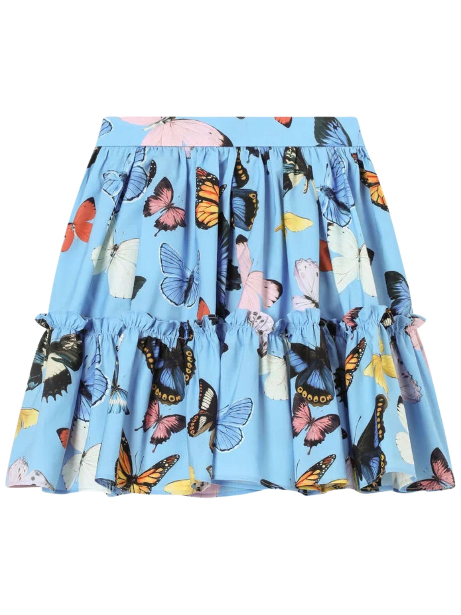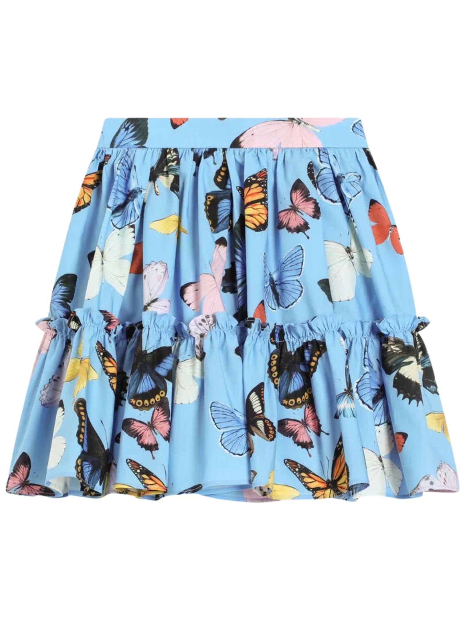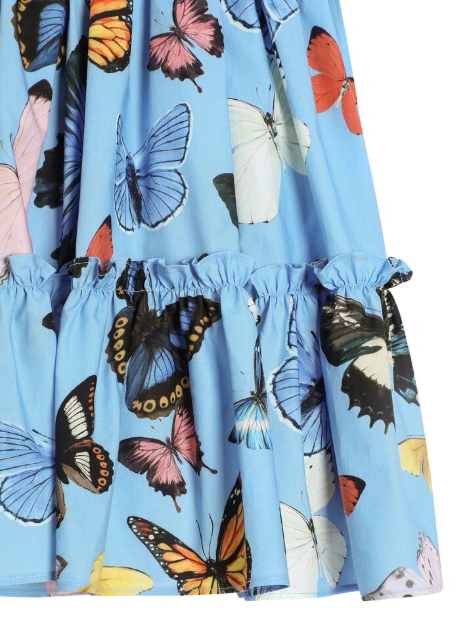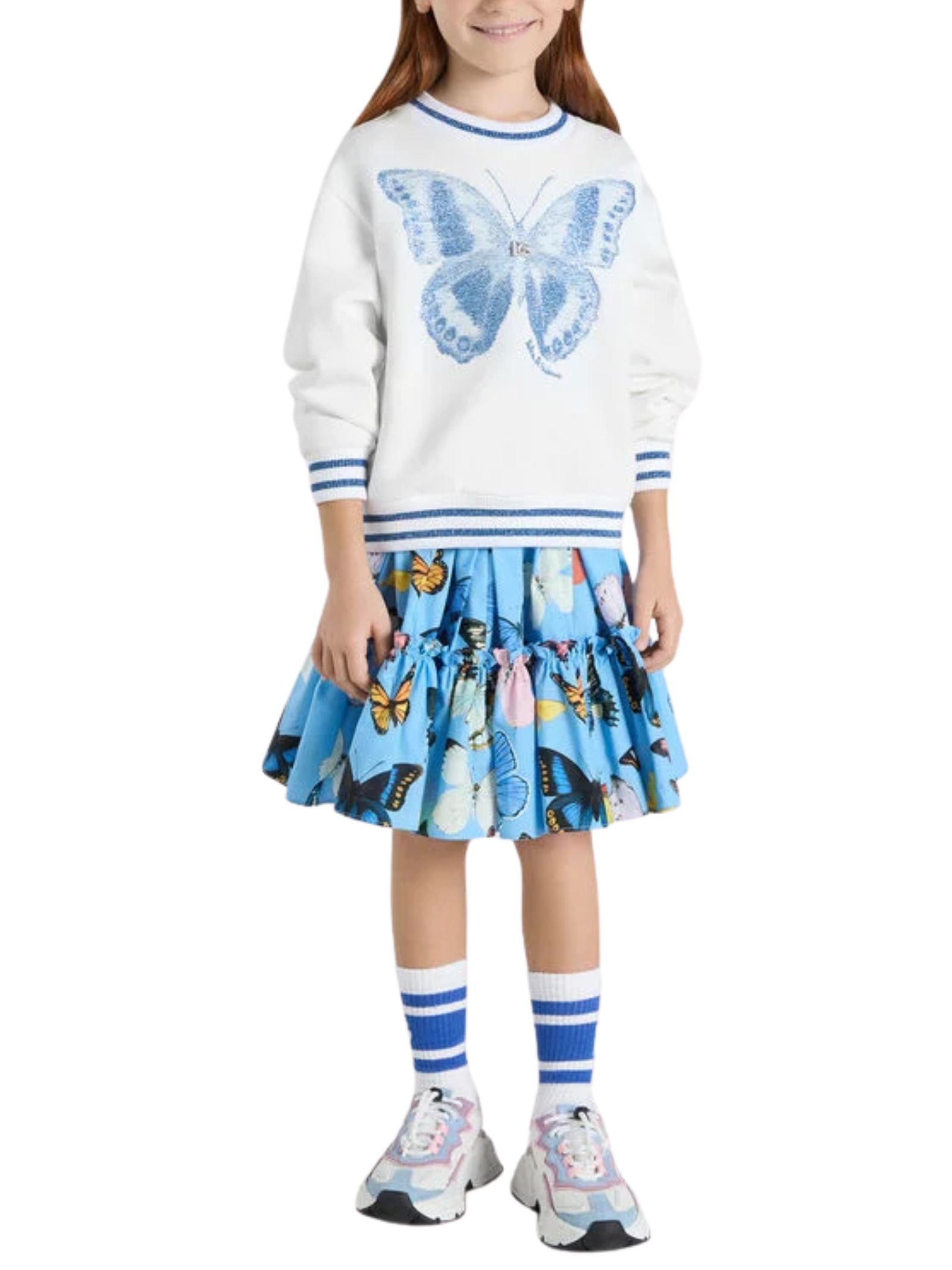 Dolce & Gabbana Kids gonna di colore azzurro in fantasia farfalle multicolor, design leggermente raccolto per una silhouette elegante e si fissa con una zip nascosta sul lato, fondo con volant. Composizione: 100% cotone. Made in Italy