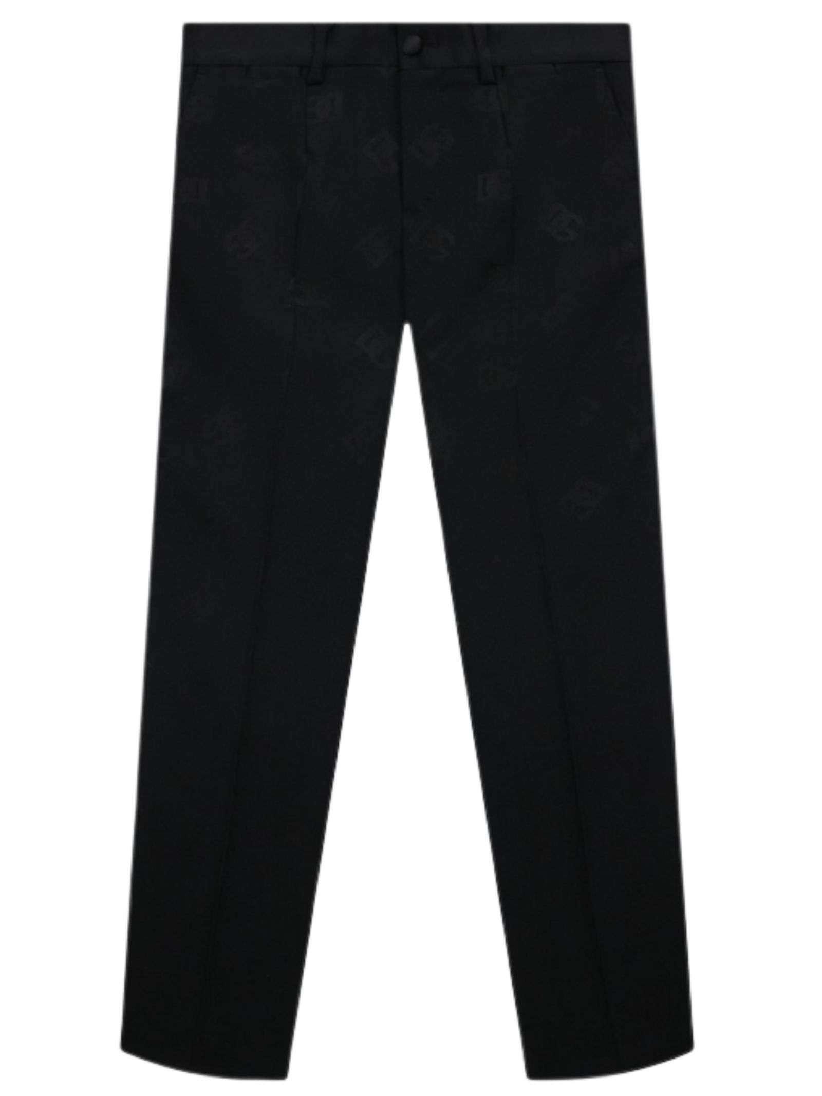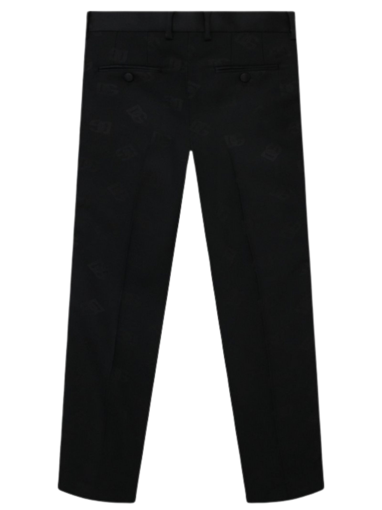 Dolce & Gabbana Kids pantalone classico di colore nero, logo all-over su tutta la superficie, modello classico con vita regolare, passanti, due bande laterali in raso, due tasche laterali, due tasche sul retro, taglio dritto. Composizione: 36% poliestere 33% lana vergine 26% lana 3% seta 2% elastan. Made in Italy