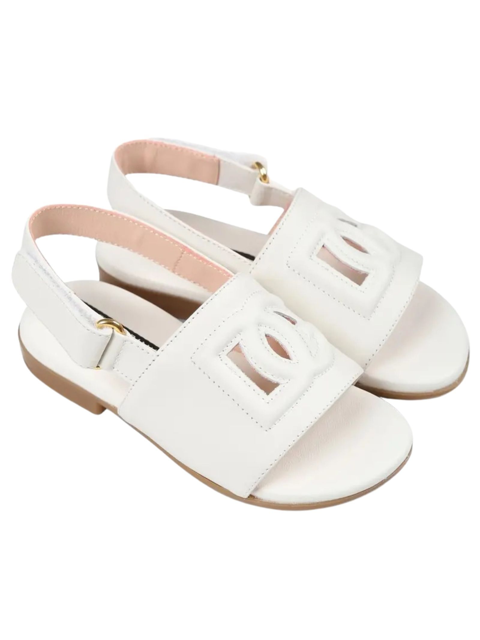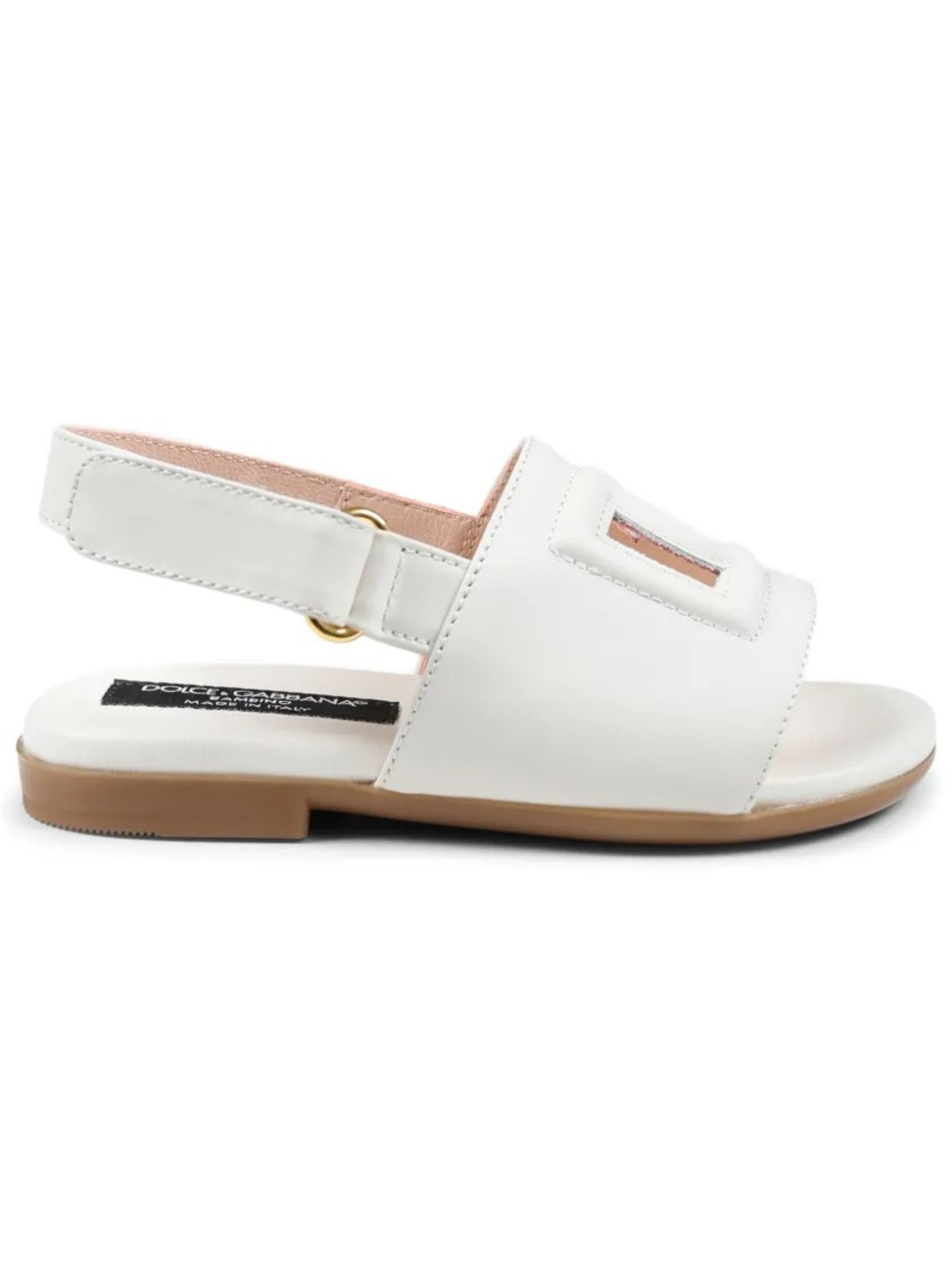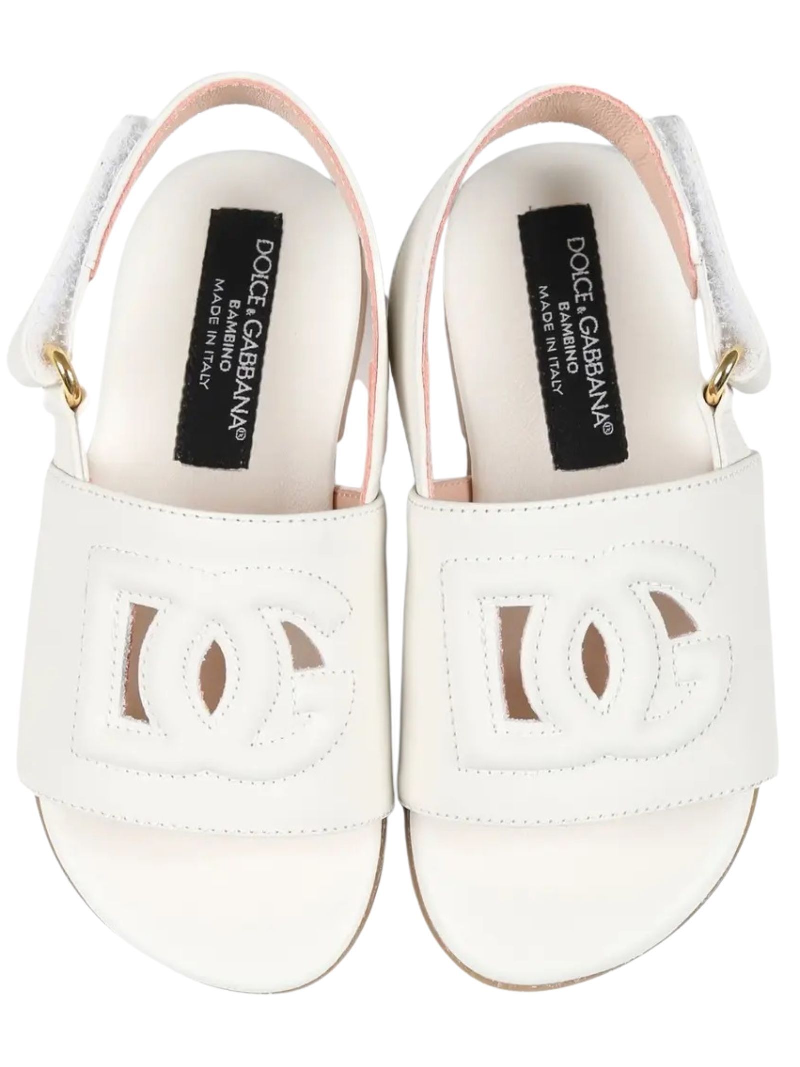Dolce & Gabbana Kids sandali di colore bianco, realizzati in pelle di vitello con chiusura a strappo, logo DG cut-out in pelle imbottita con effetto 3D, sottopiede in pelle di agnello, etichetta in tessuto logata, suola in cuoio naturale. Made in Italy
