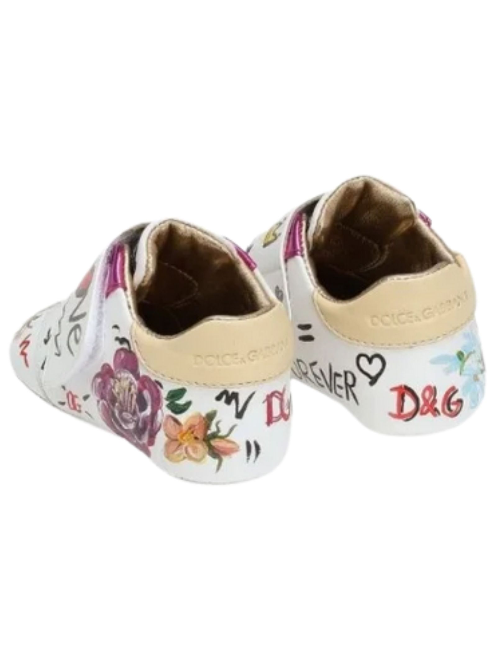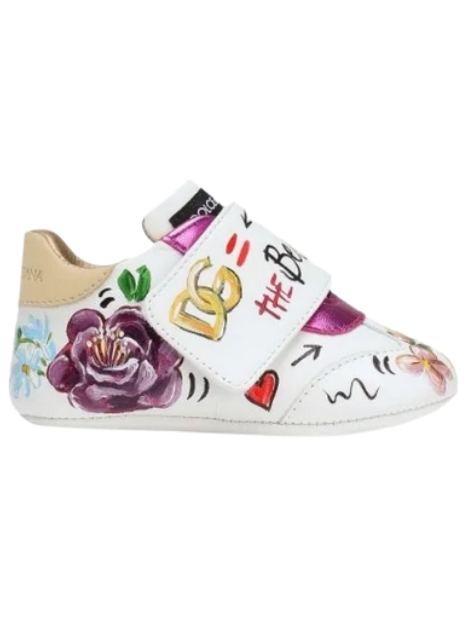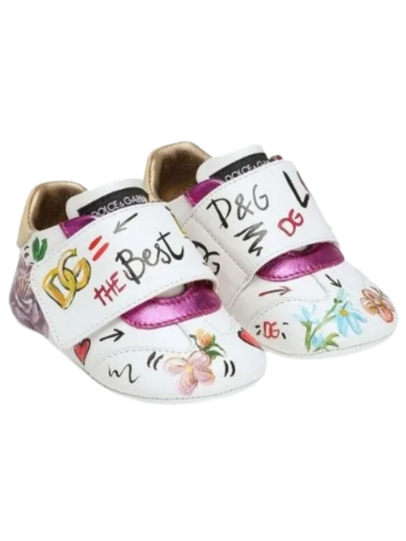 Dolce & Gabbana Kids scarpine pre-walker in pelle di colore bianco con stampe e logo a contrasto multicolor su tutta la superficie, modello con punta tonda, chiusura frontale con velcro, foderate in morbidissima pelle e hanno una suola esterna in cuoio flessibile con logo. Composizione: 100% Pelle Agnello. Made in Italy