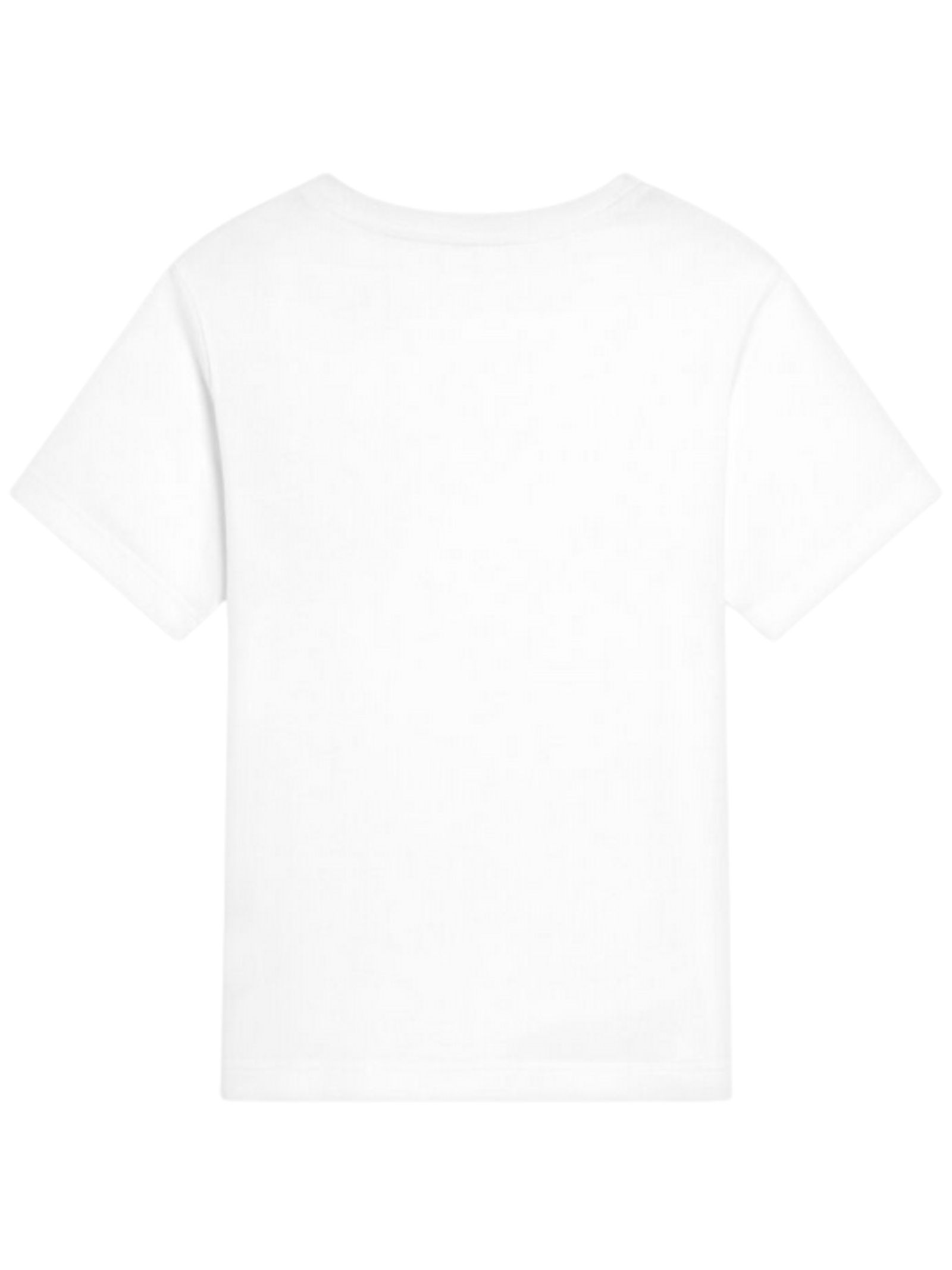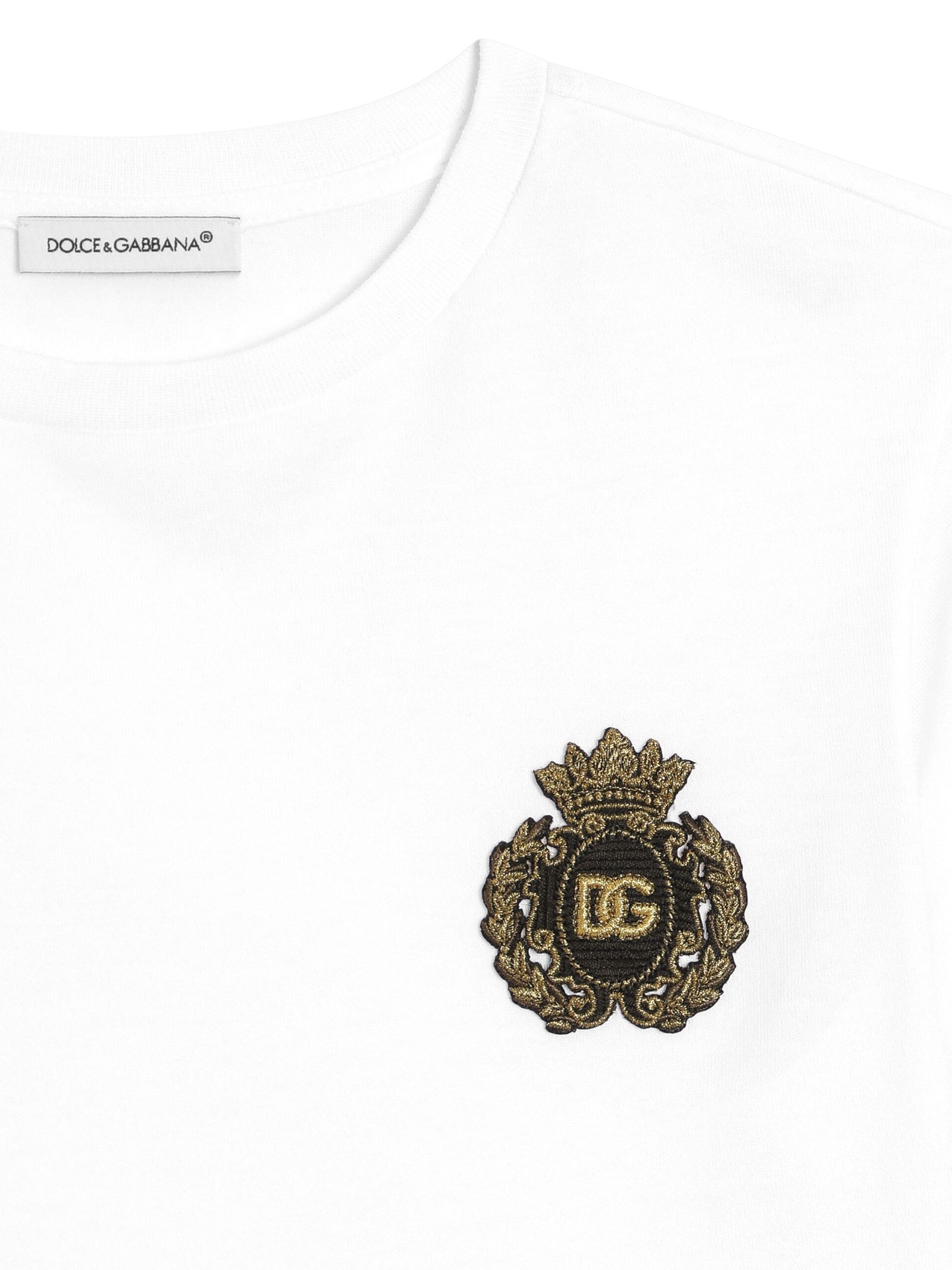 Dolce & Gabbana Kids t-shirt di colore bianco, modello girocollo, mezza manica, applicazione logo ricamato sul petto a contrasto oro/nero, orlo dritto, vestibilità regolare. Composizione: 100% cotone. Made in Italy