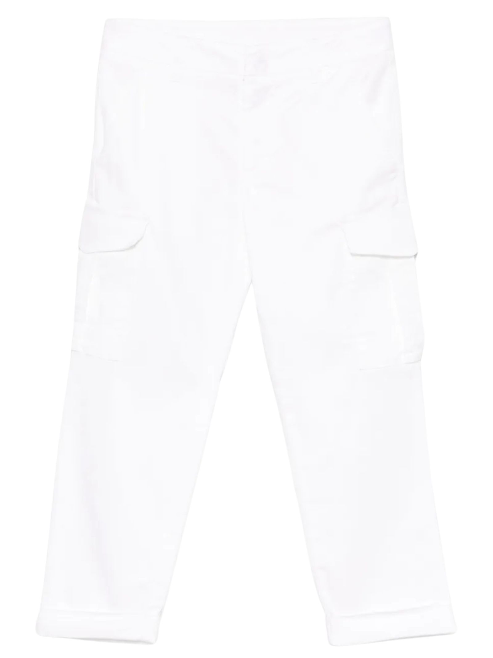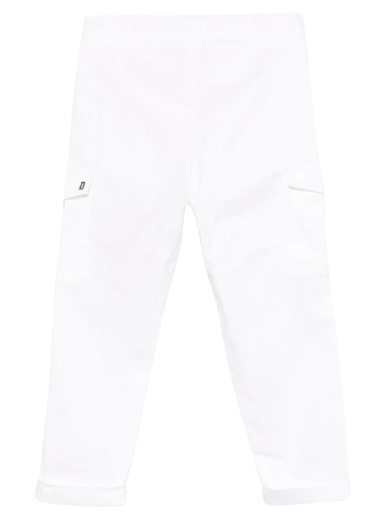 Dondup Kids pantalone di colore bianco, design con 4 tasche, due tasconi cargo laterali, vita regolare, logo in metallo applicato, orli con risvolto. Composizione: 55% lyocell 45% cotone. Made in Italy