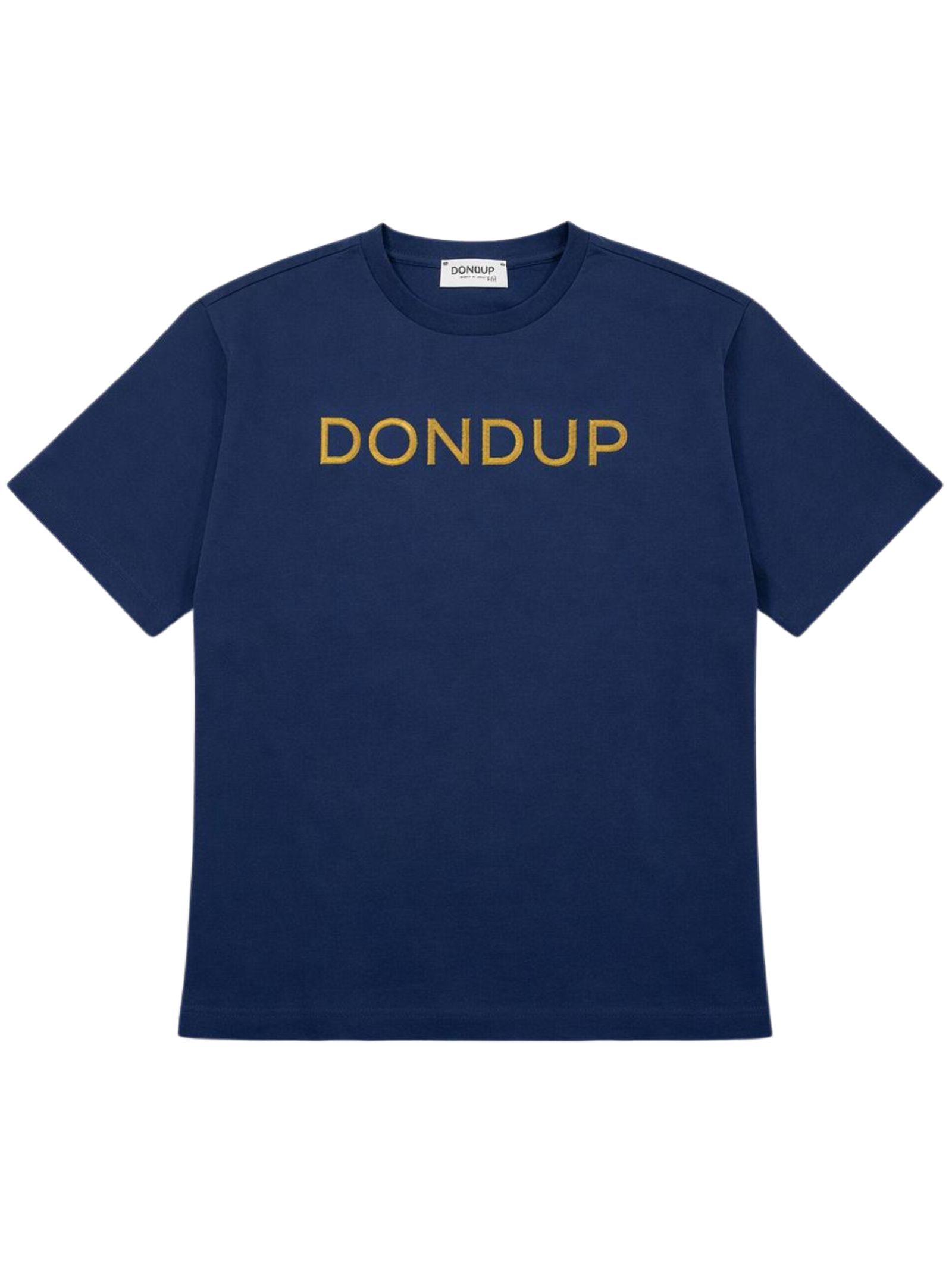 Dondup Kids t-shirt di colore blu, modello girocollo, mezza manica, applicazione centrale a contrasto con logo in rilievo, vestibilità ampia, orlo dritto. Composizione: 100% cotone. Made in Italy