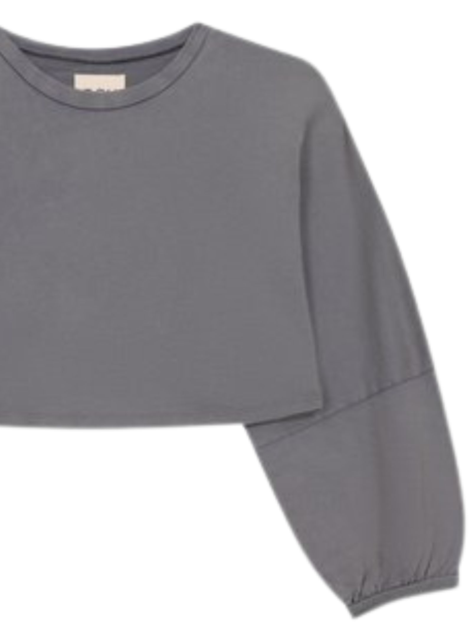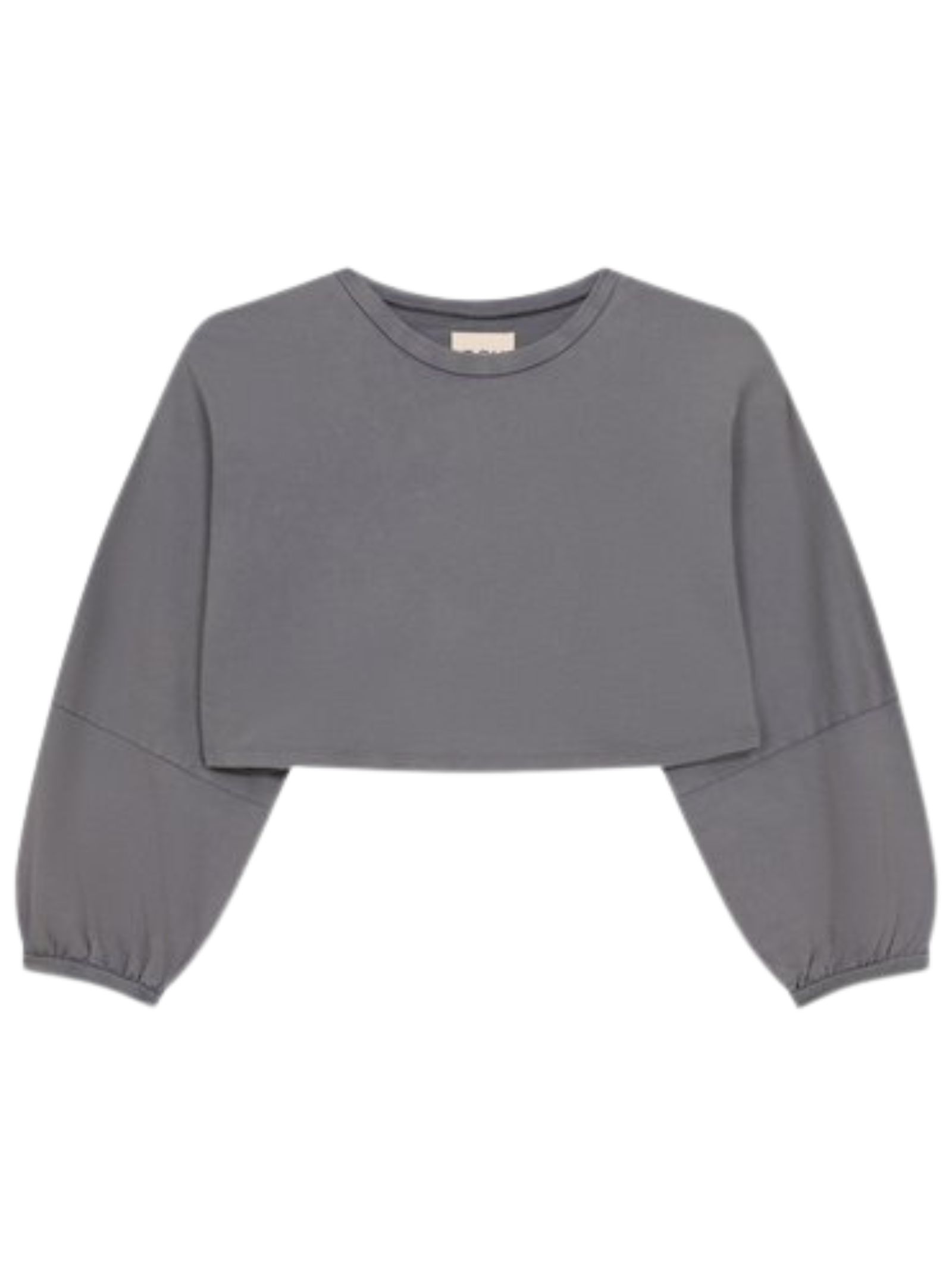 Dou Dou Kids felpa di colore grigio, modello cropped, girocollo, maniche lunghe con polsini elastici, vestibilità ampia. Composizione: 100% cotone