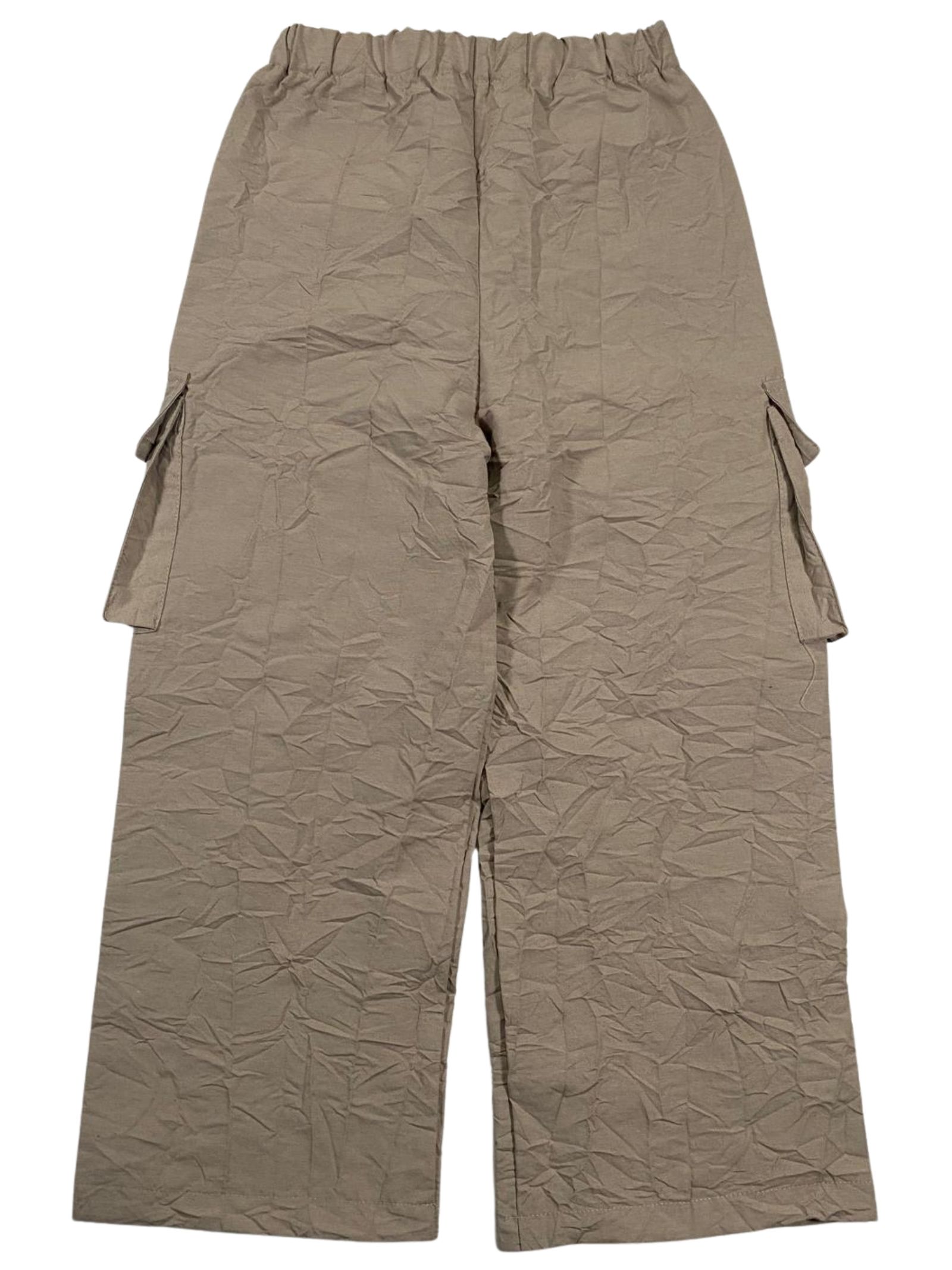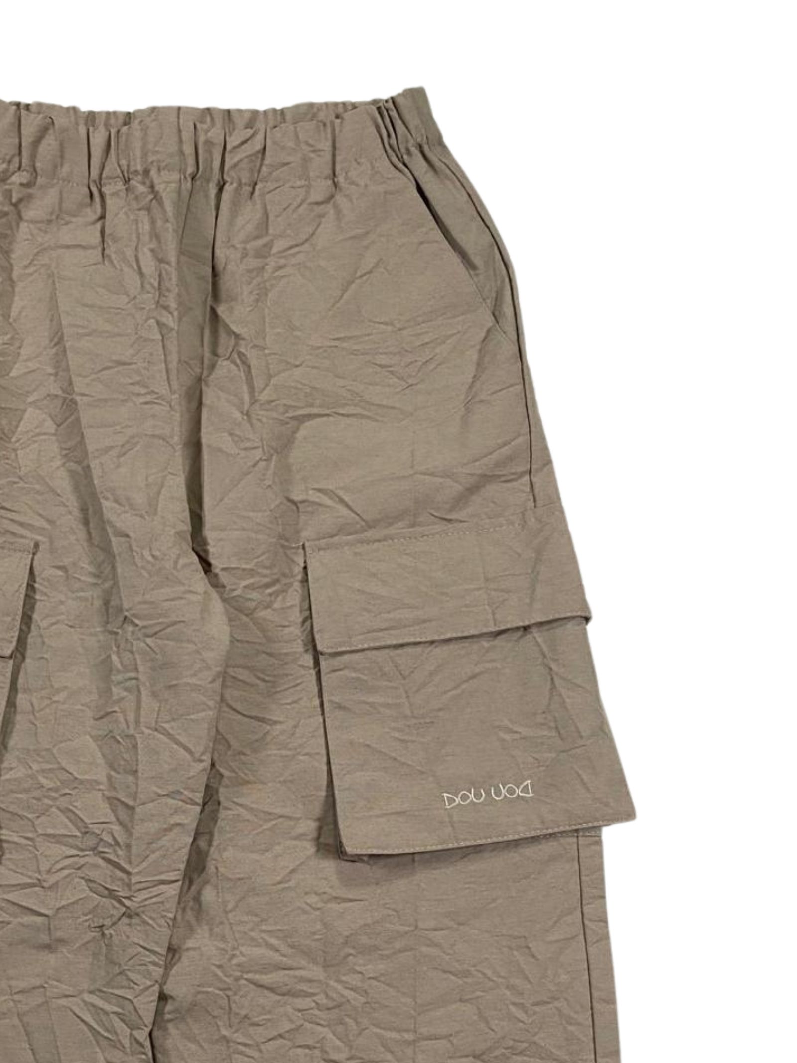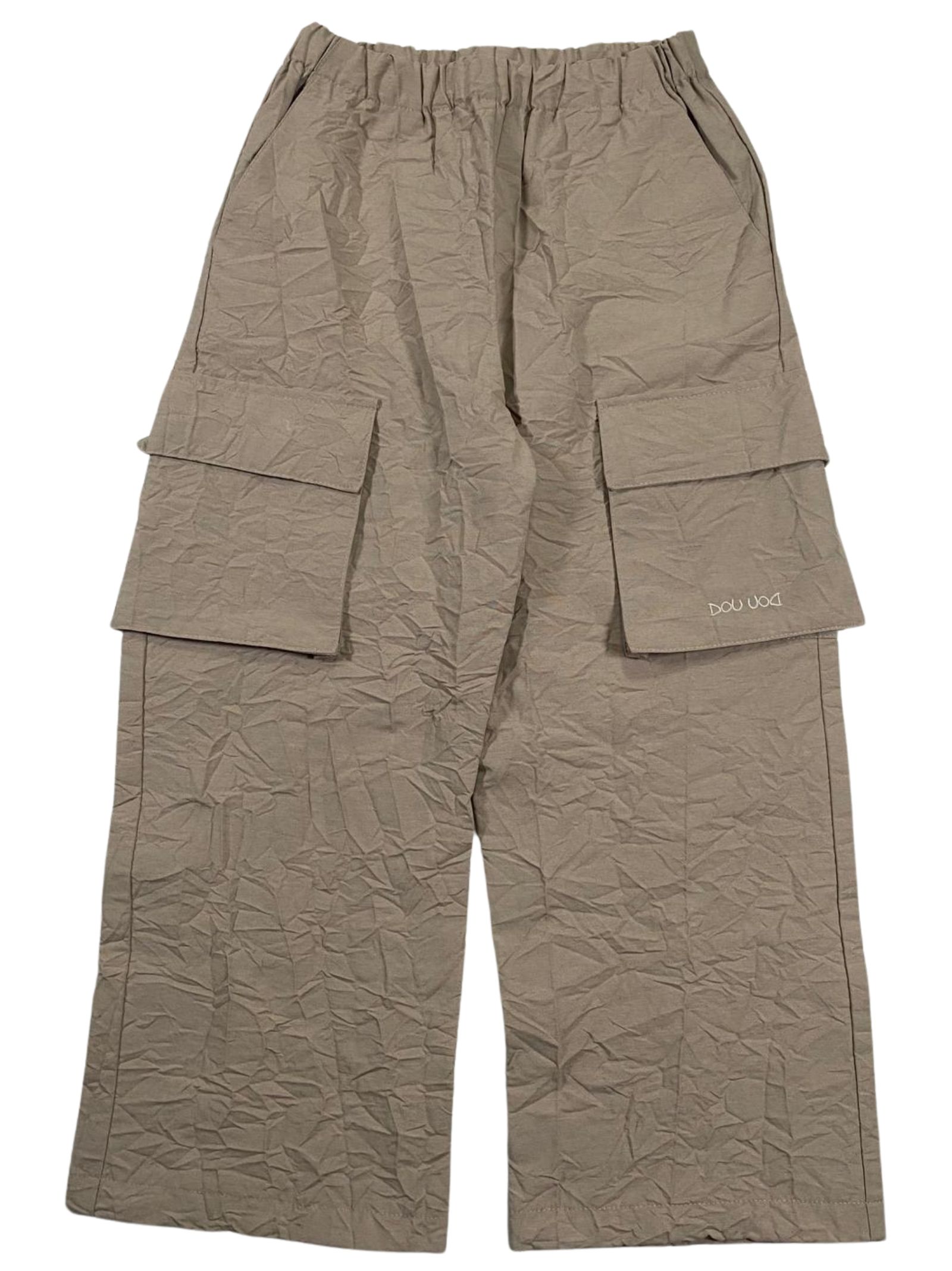 Dou Dou Kids pantalone di colore beige, realizzato in tela di misto cotone con effetto stropicciato, caratterizzato da gamba ampia con tasconi cargo applicati sul lati, vita elasticizzata, tasche oblique sui fianchi, vestibilità ampia. Composizione: 62% cotone 38% poliestere