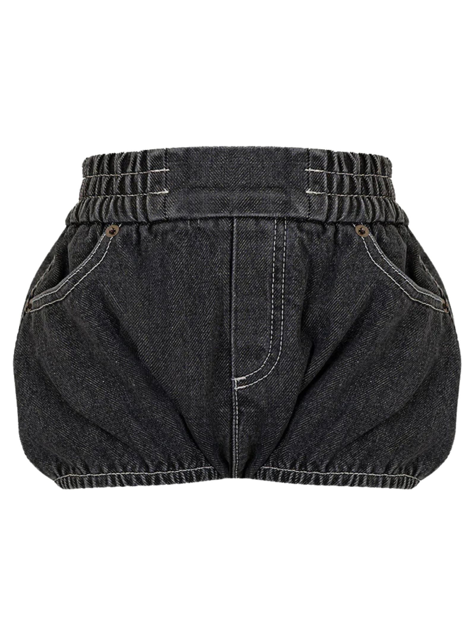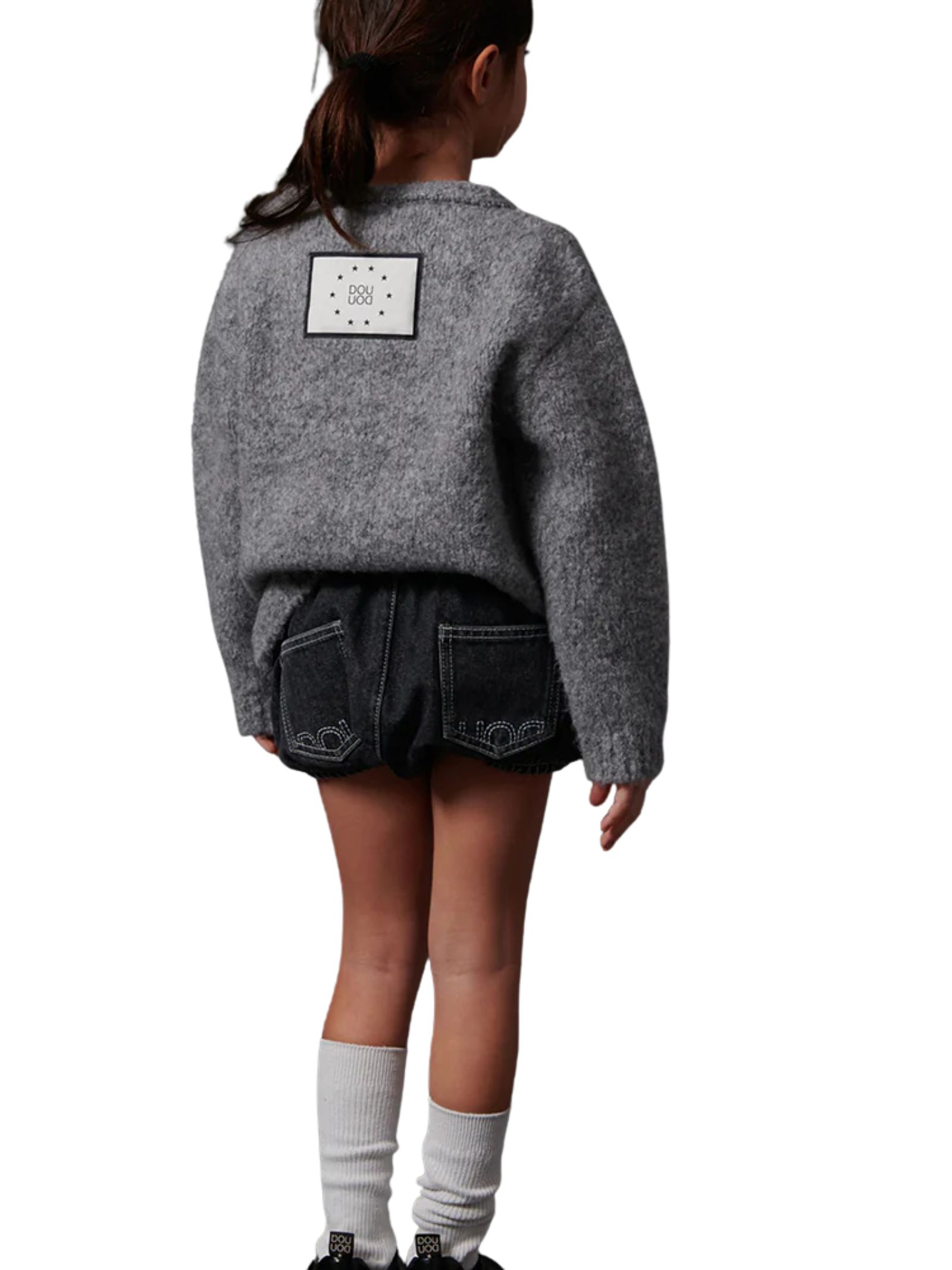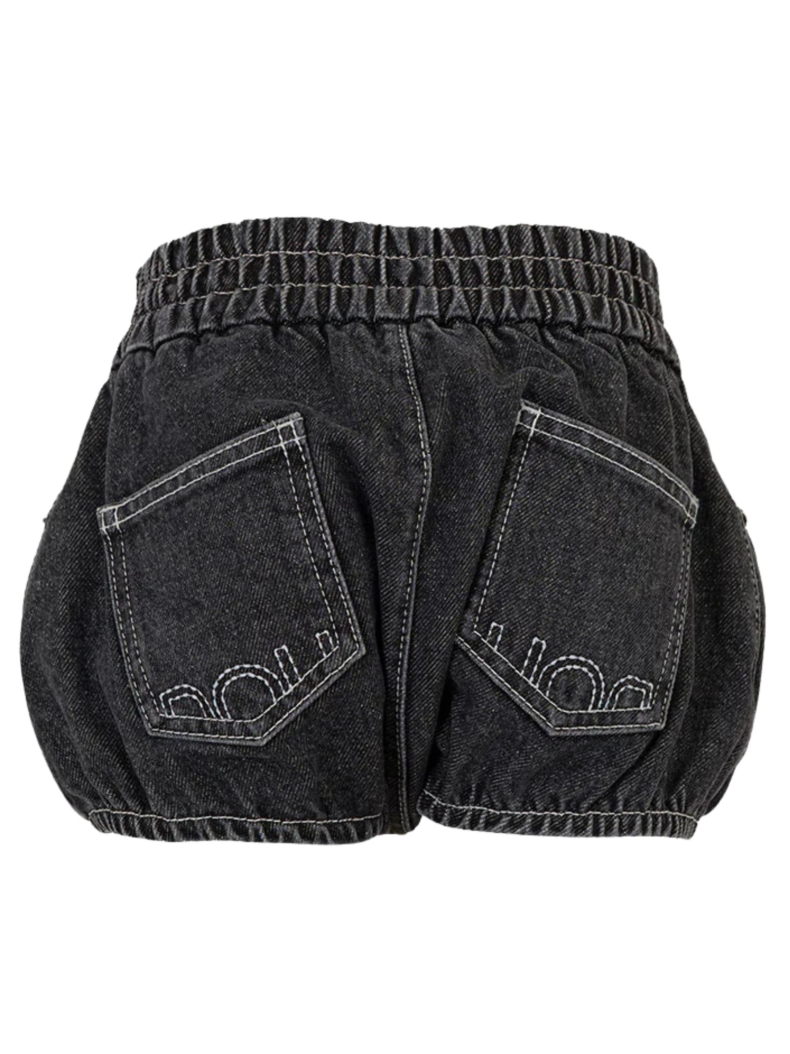 Dou Dou Kids shorts in denim nero, elastico in vita e sul girogamba, tasche laterali e taschini sul retro, con ricamo del logo e cuciture a contrasto in bianco. Composizione: 100% cotone