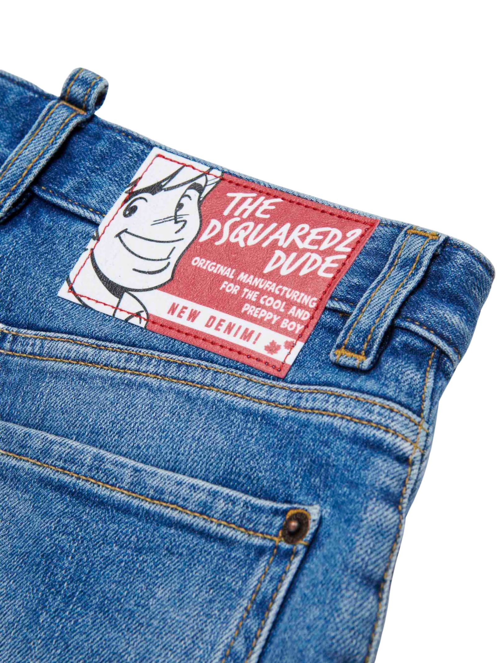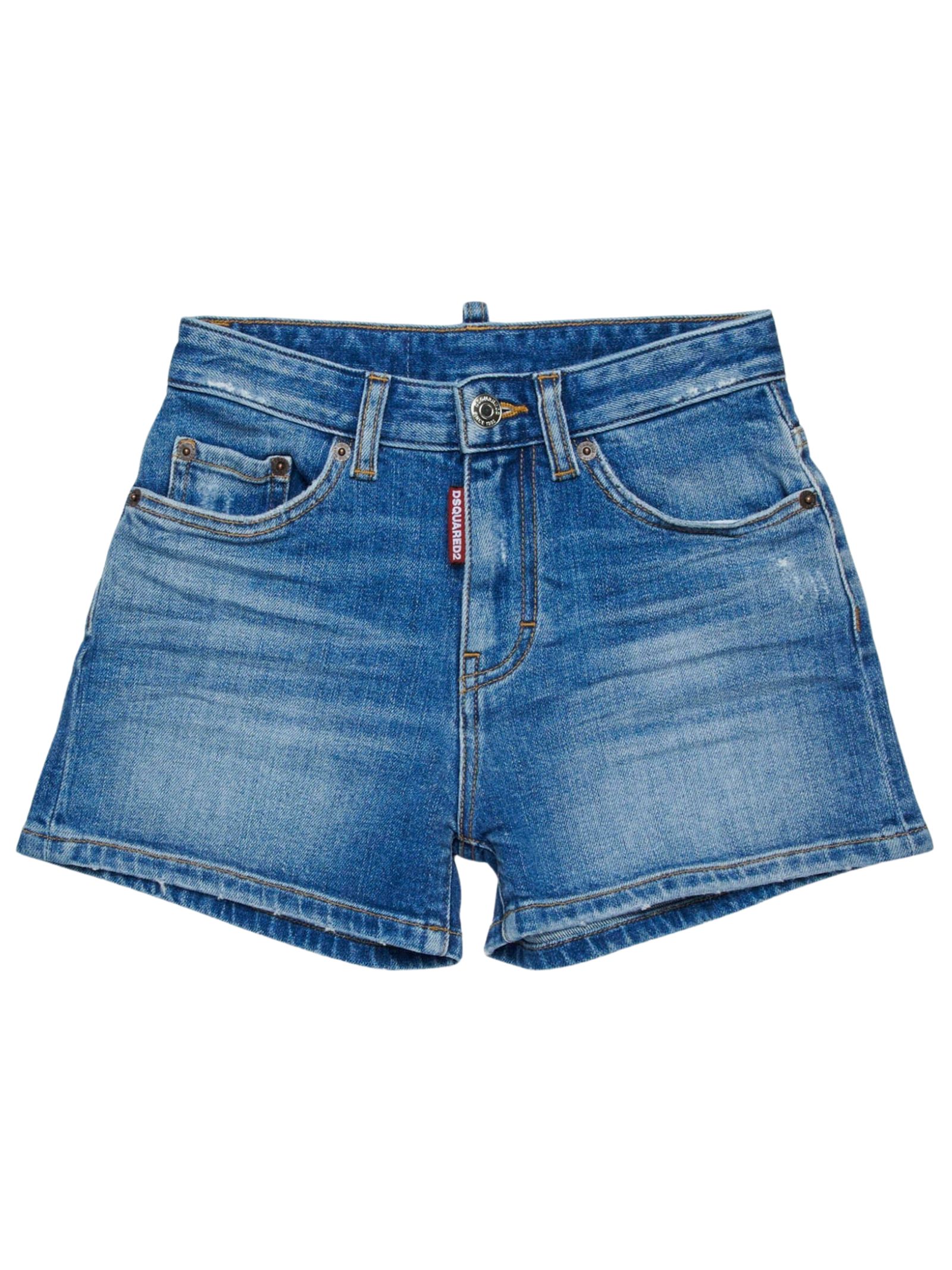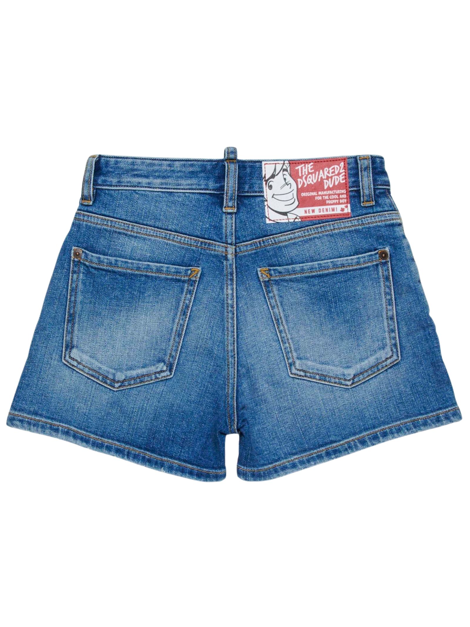 Dsquared2 Kids bermuda in denim dal lavaggio blu sbiadito, dettaglio baffature e piccole abrasioni che donano un effetto vissuto, vita regolare con passanti, chiusura con zip nascosta e bottone, design a cinque tasche e applicazione con logo sul retro, vestibilità regolare. Composizione: 99% cotone 1% elastan