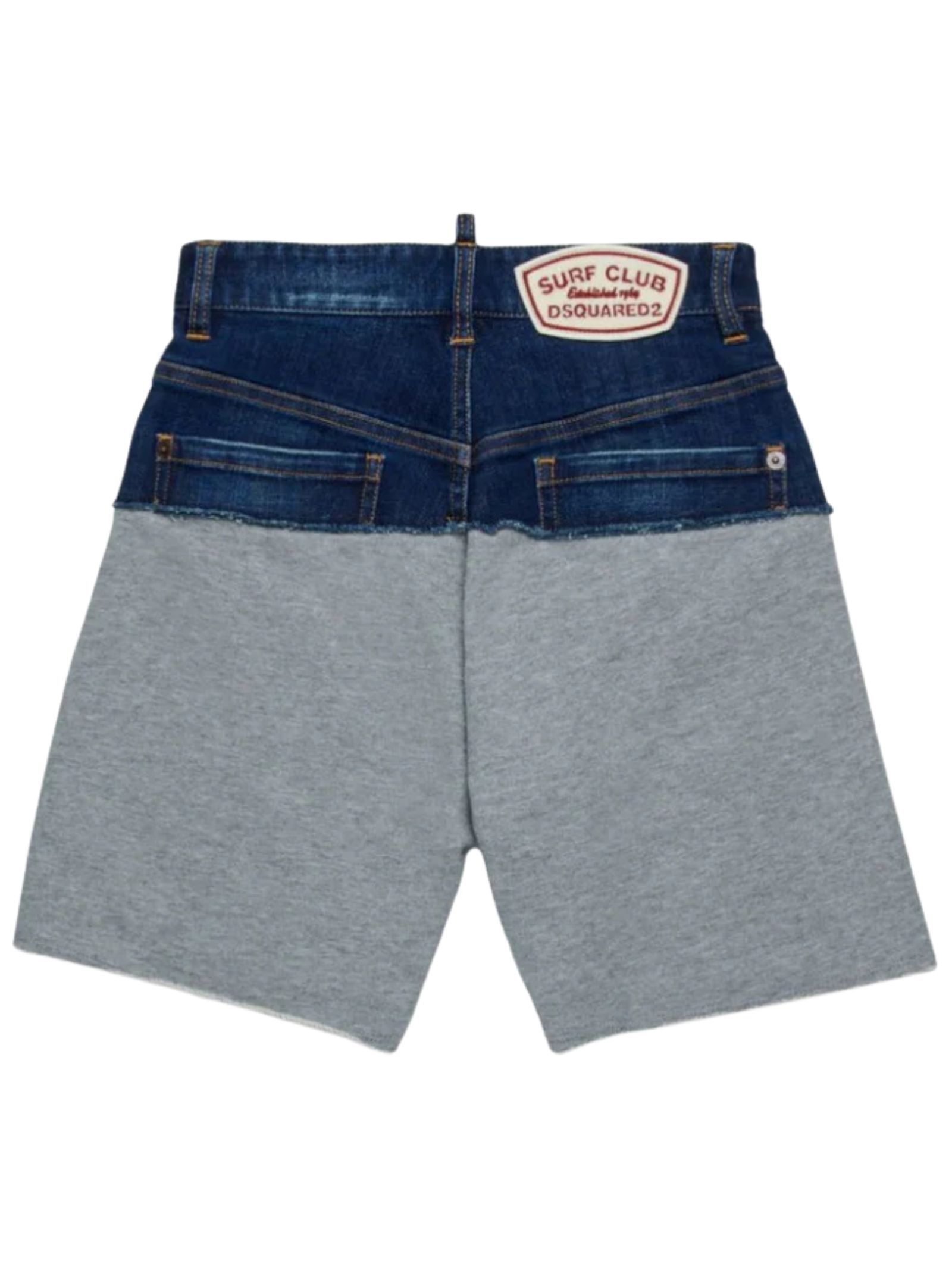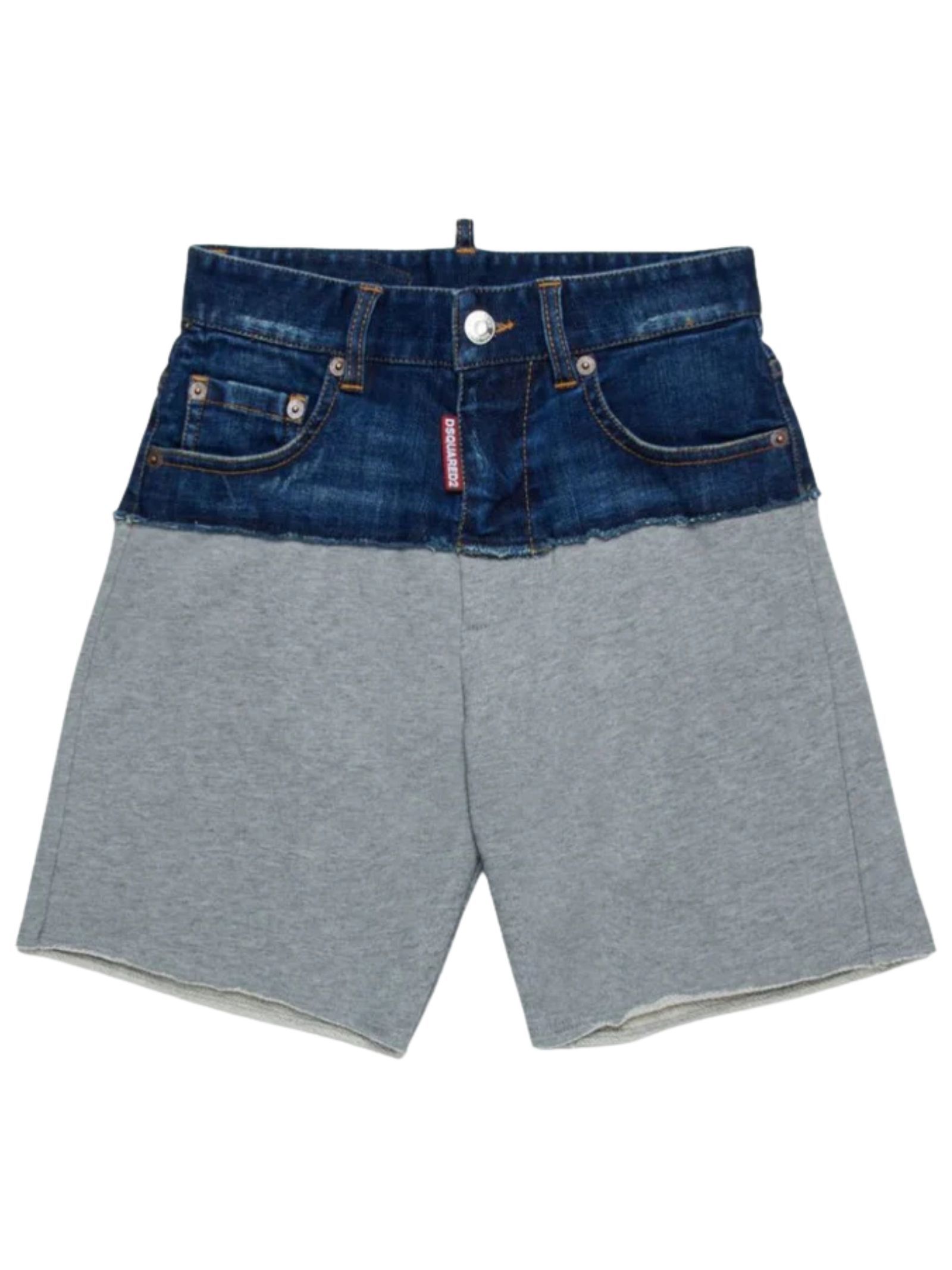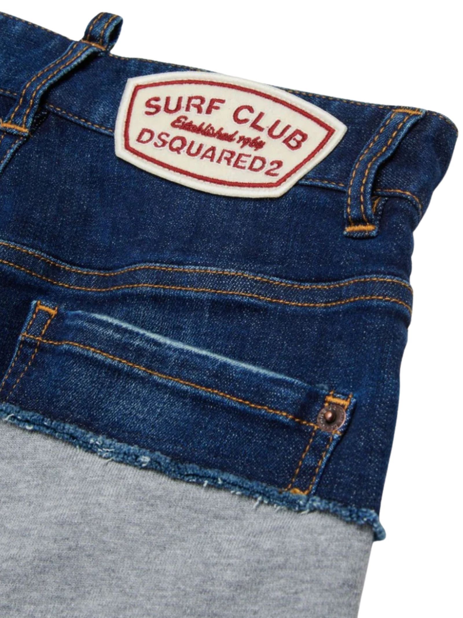 Dsquared Kids bermuda in jeans dal lavaggio blu medio-scuro, dettaglio parte inferiore a contrasto grigio, sfumature e baffature, vita regolare, 5 tasche, patch con logo sul retro, fondo a taglio vivo, vestibilità regolare. Composizione: 100% Cotone