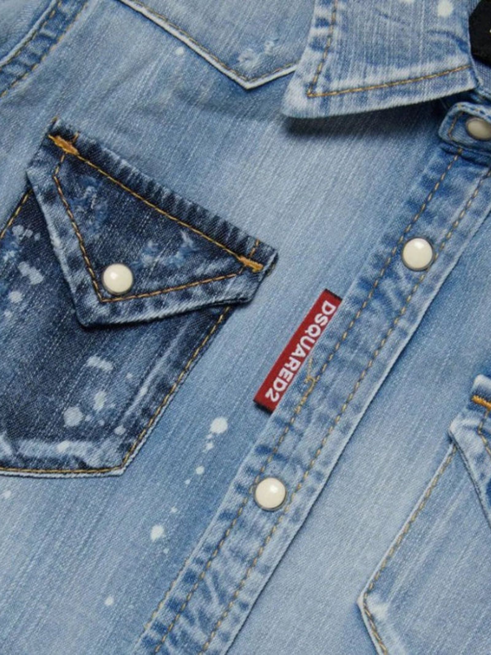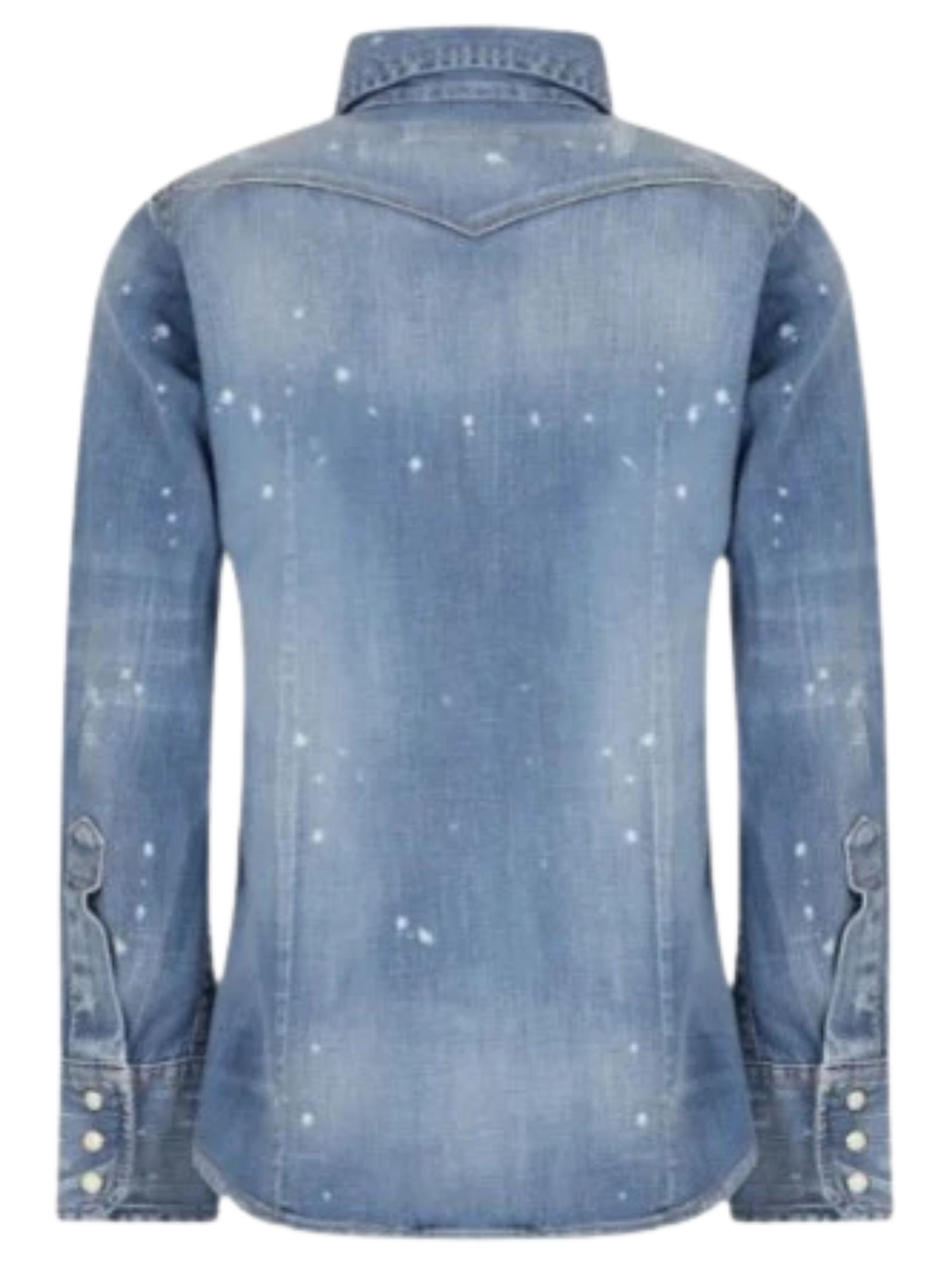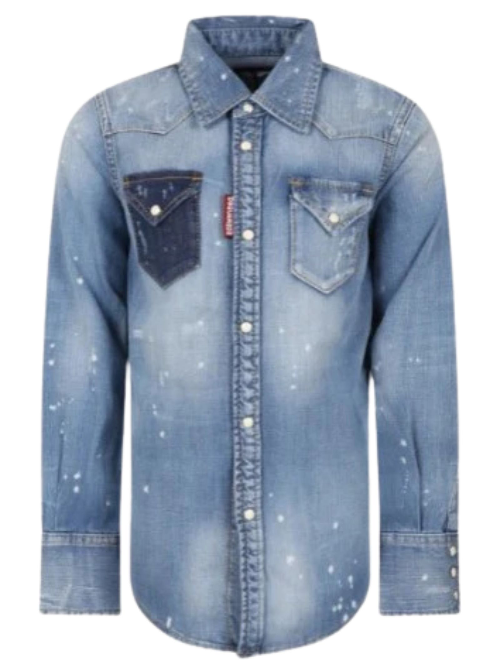 Dsquared2 Kids camicia in denim di cotone effetto vernice a manica lunga, colletto classico, chiusura frontale con bottoni a pressione, dettaglio sbiaditure, taschini applicati sul petto, label Dsquared2 applicata sul davanti, orlo curvo, vestibilità regolare. Composizione: 98% Cotone 2% Elastan