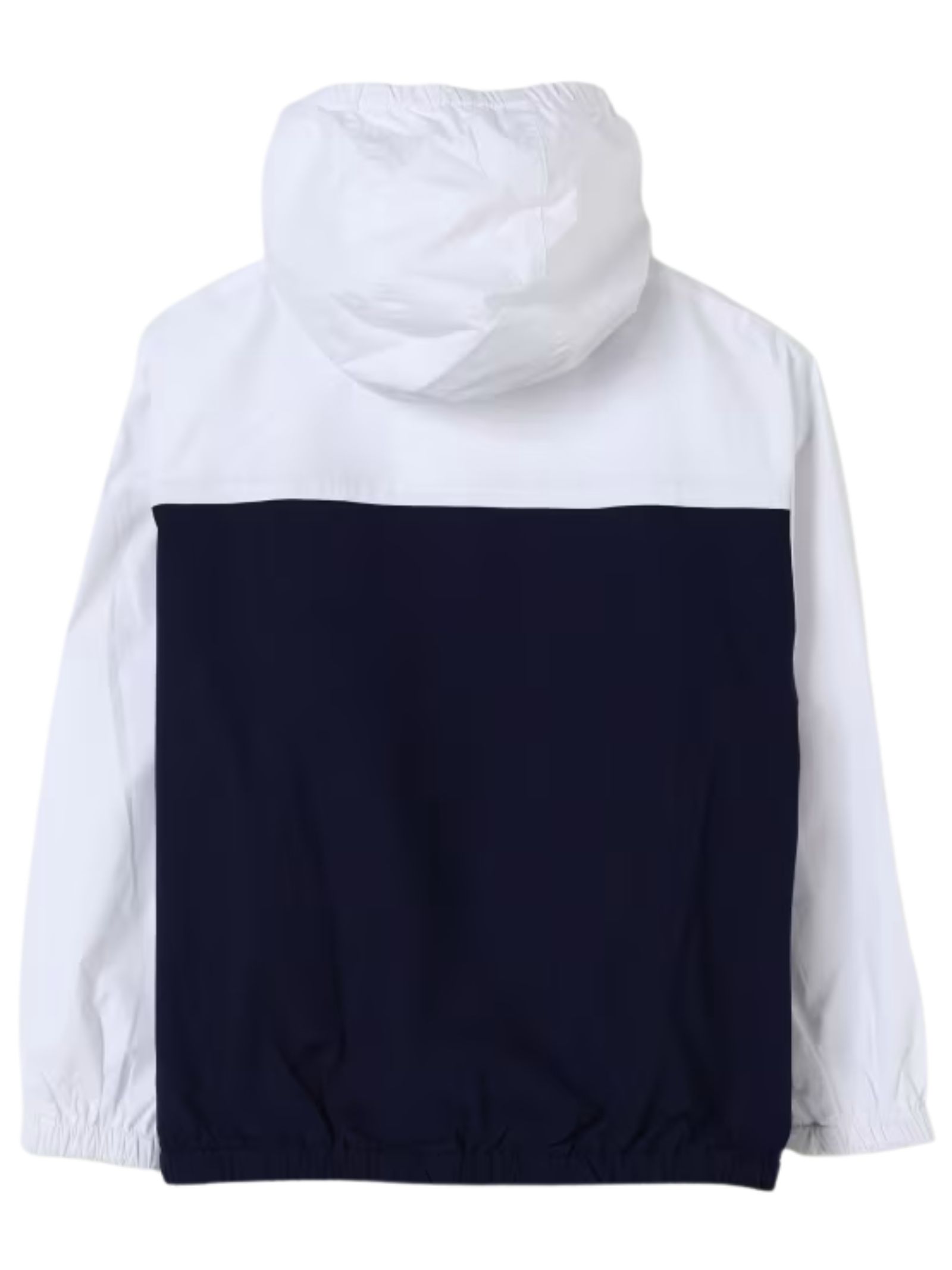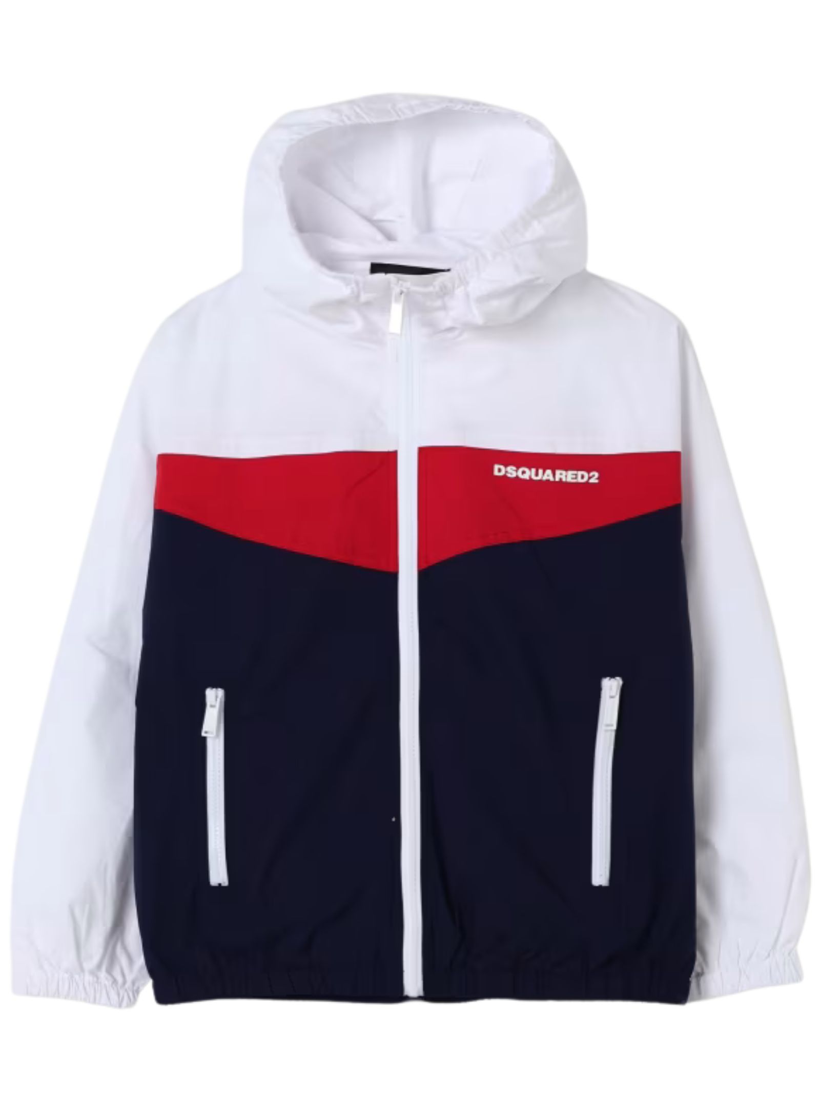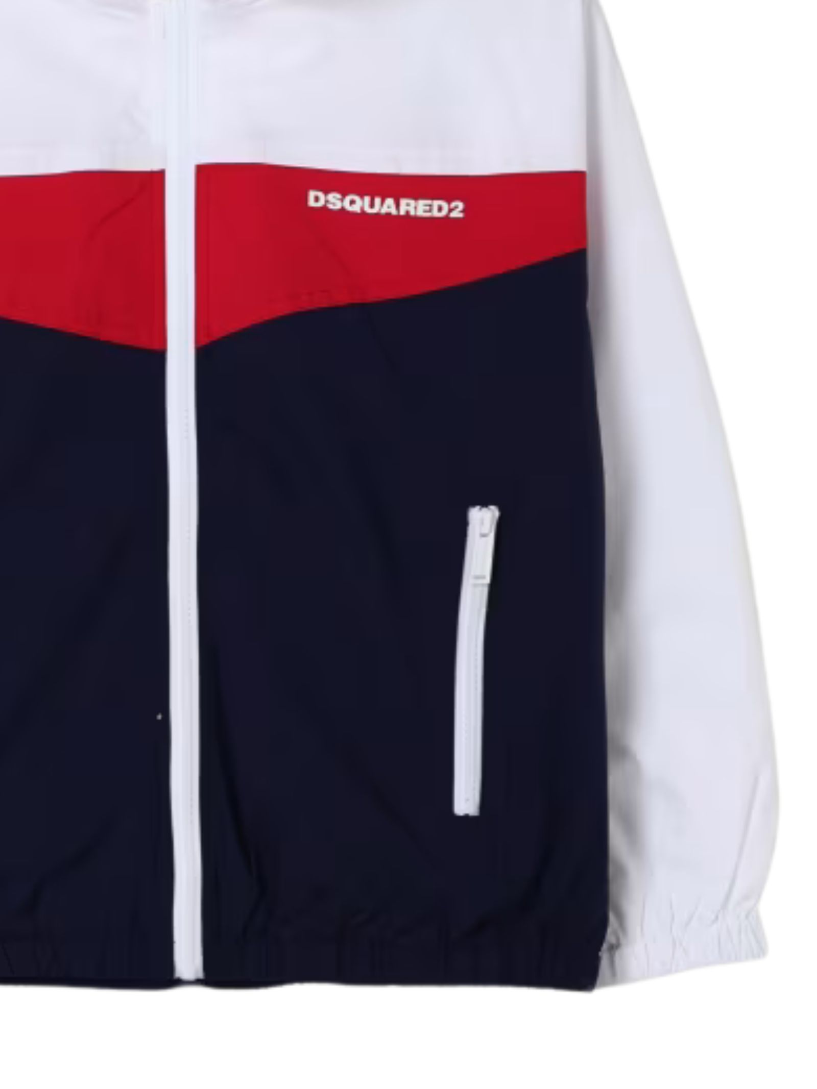Dsquared2 Kids giubbino di colore bianco/blu, dettagli a contrasto rosso, antivento, tessuto tecnico, logo a contrasto, collo con cappuccio, maniche lunghe, interno foderato, chiusura con zip, multitasche. Composizione: 98% Cotone 2% Elastan