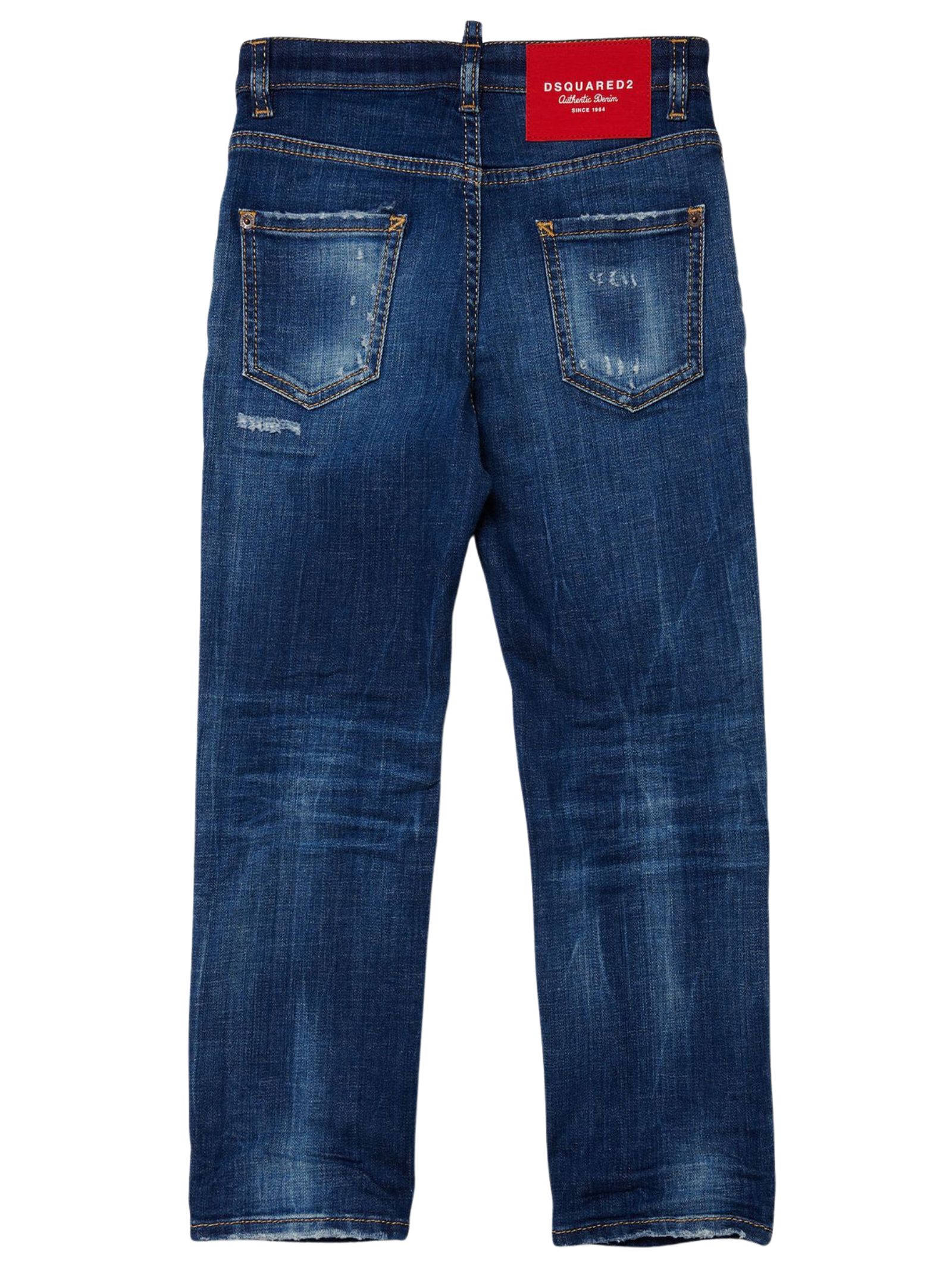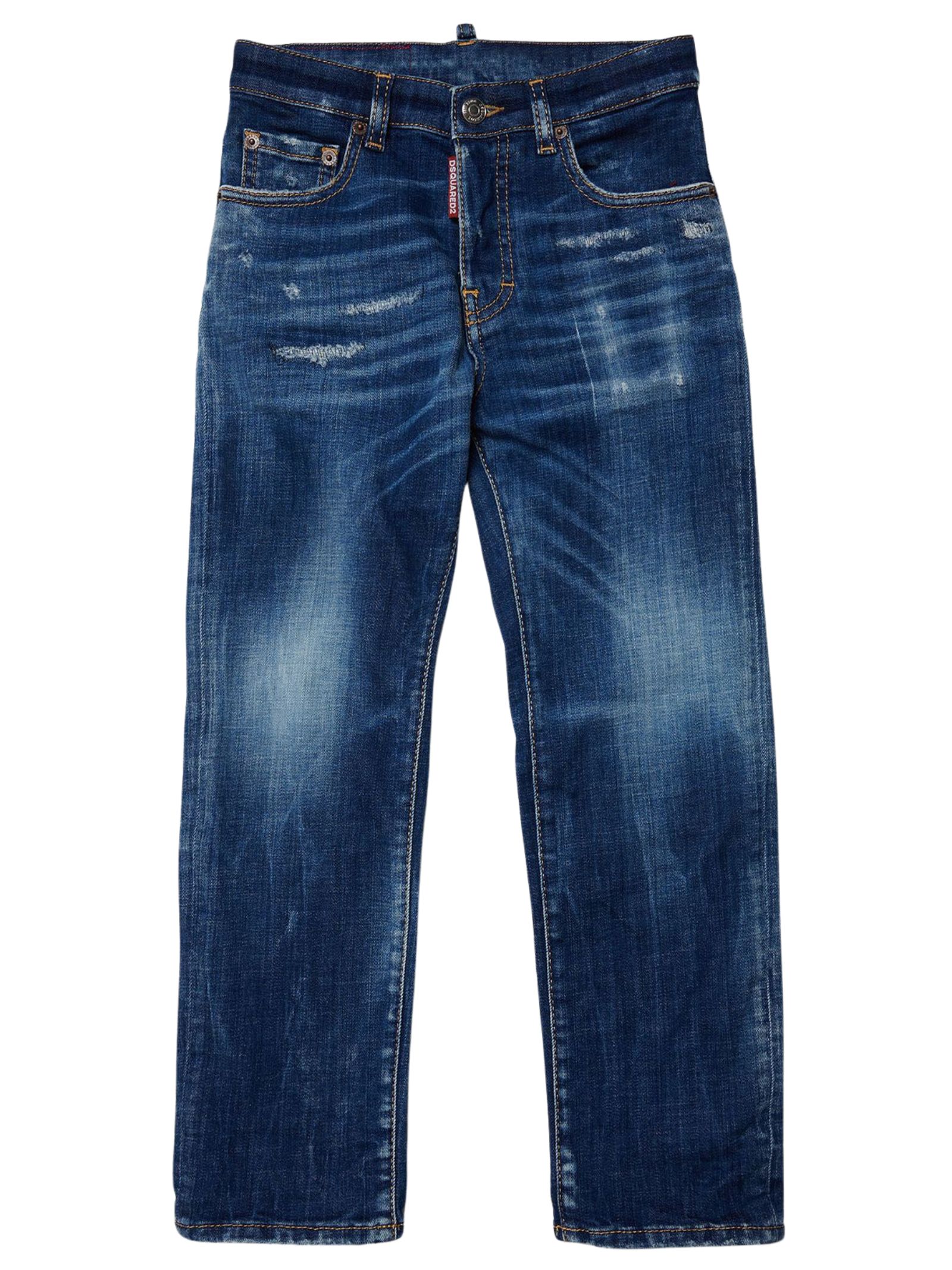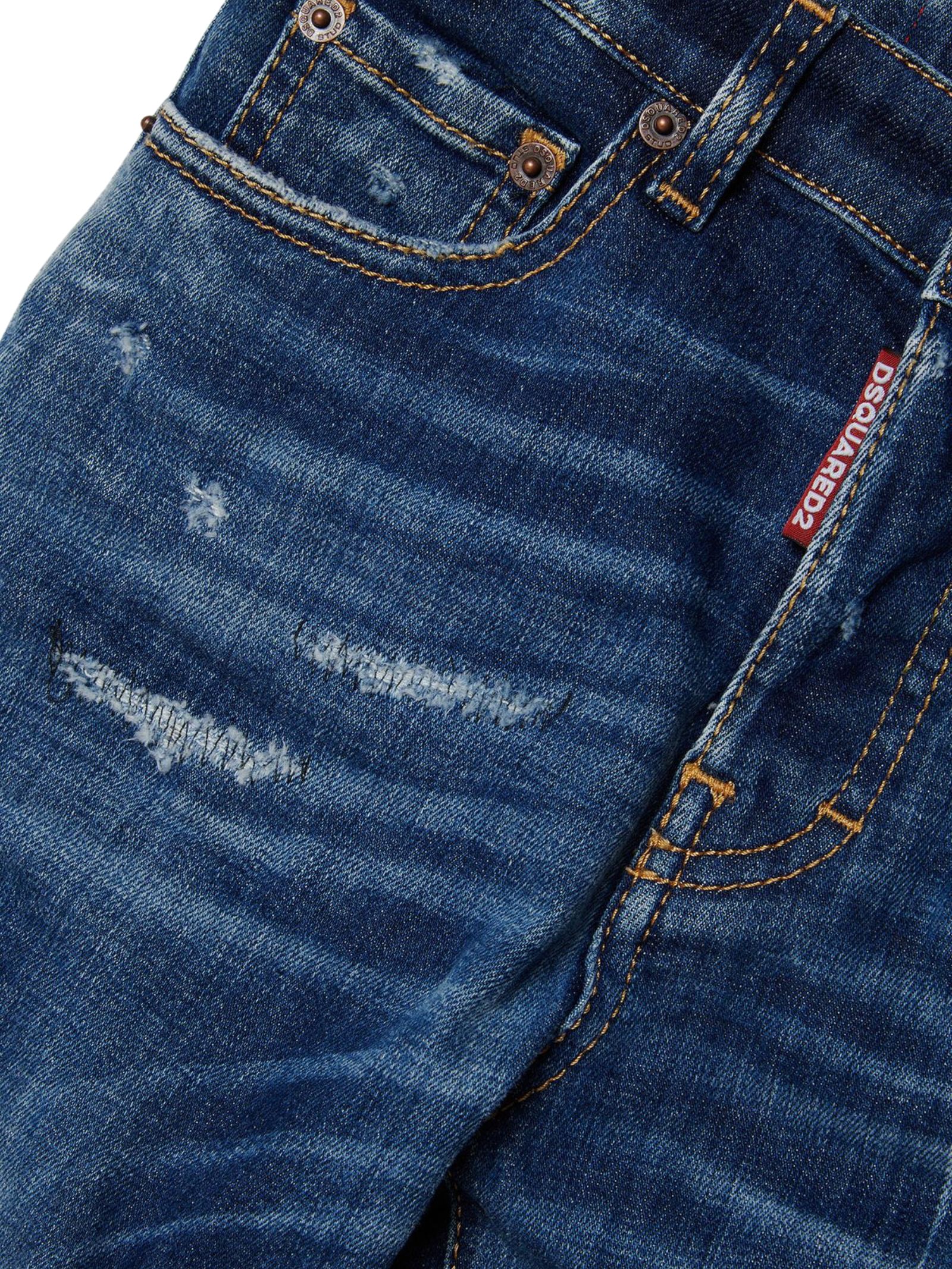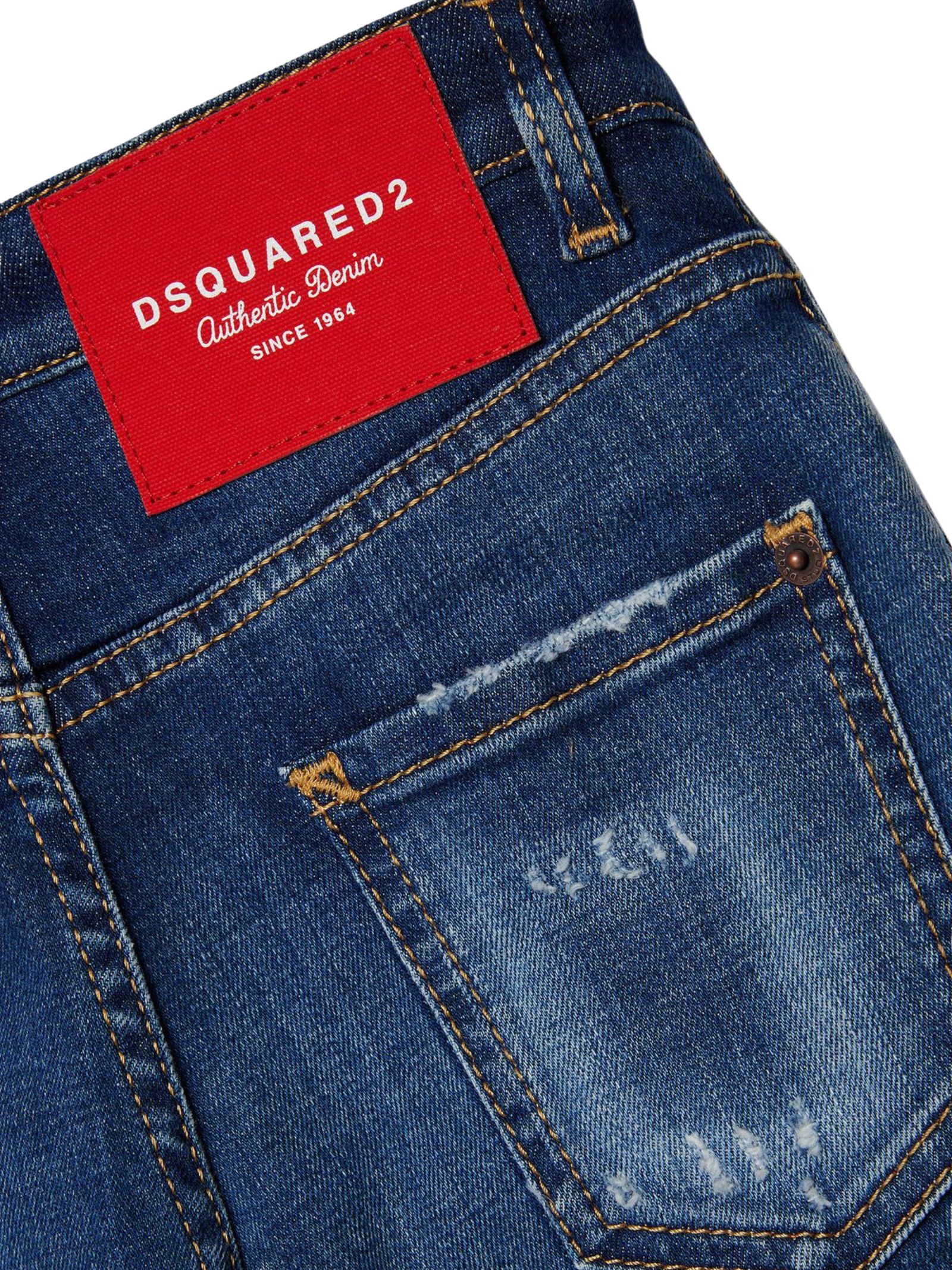 Dsquared Kids jeans di colore blu in cotone leggermente elasticizzato, effetto consumato, dettaglio sbiaditure a contrasto bianco, modello 5 tasche, passanti per cintura, patch con logo sul retro, vestibilità regolare. Composizione: 98% cotone 2% elastan