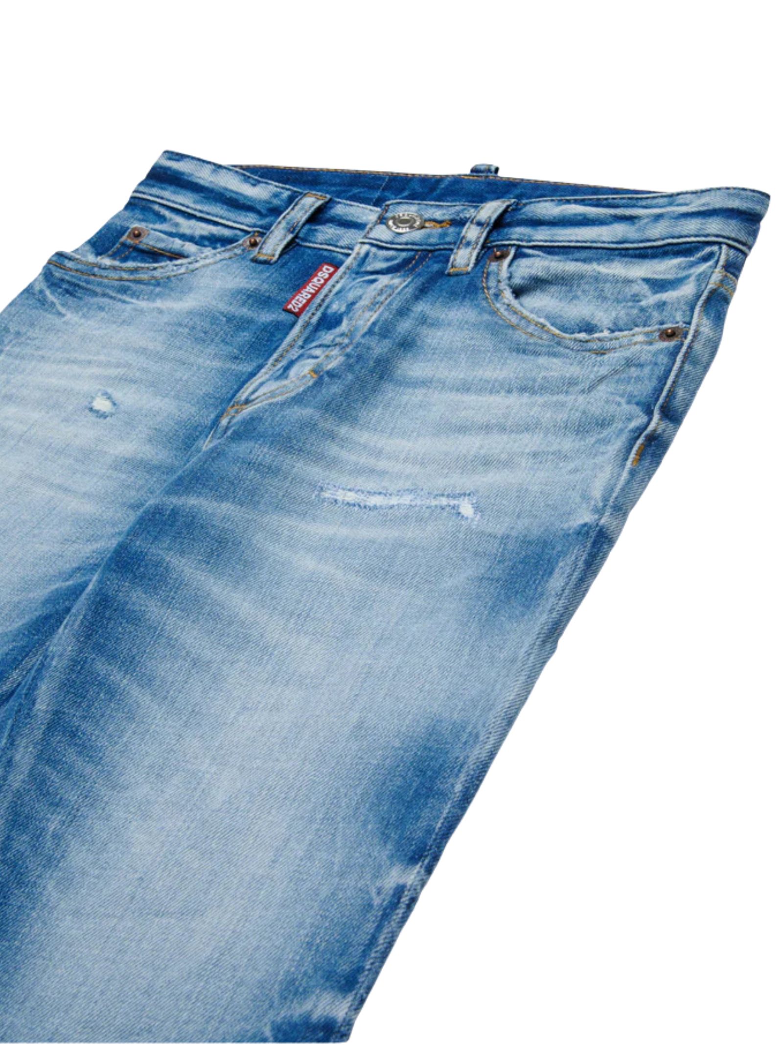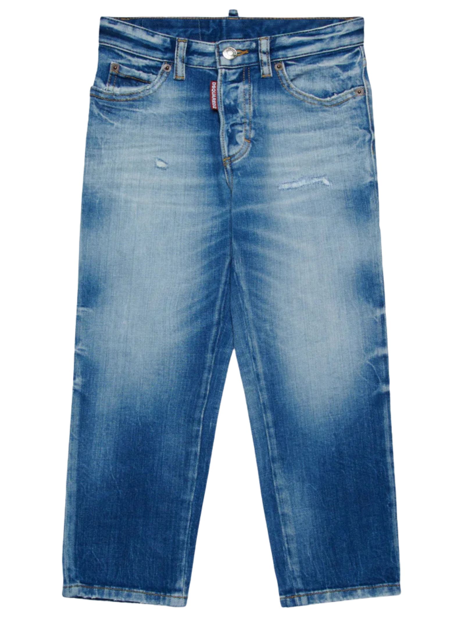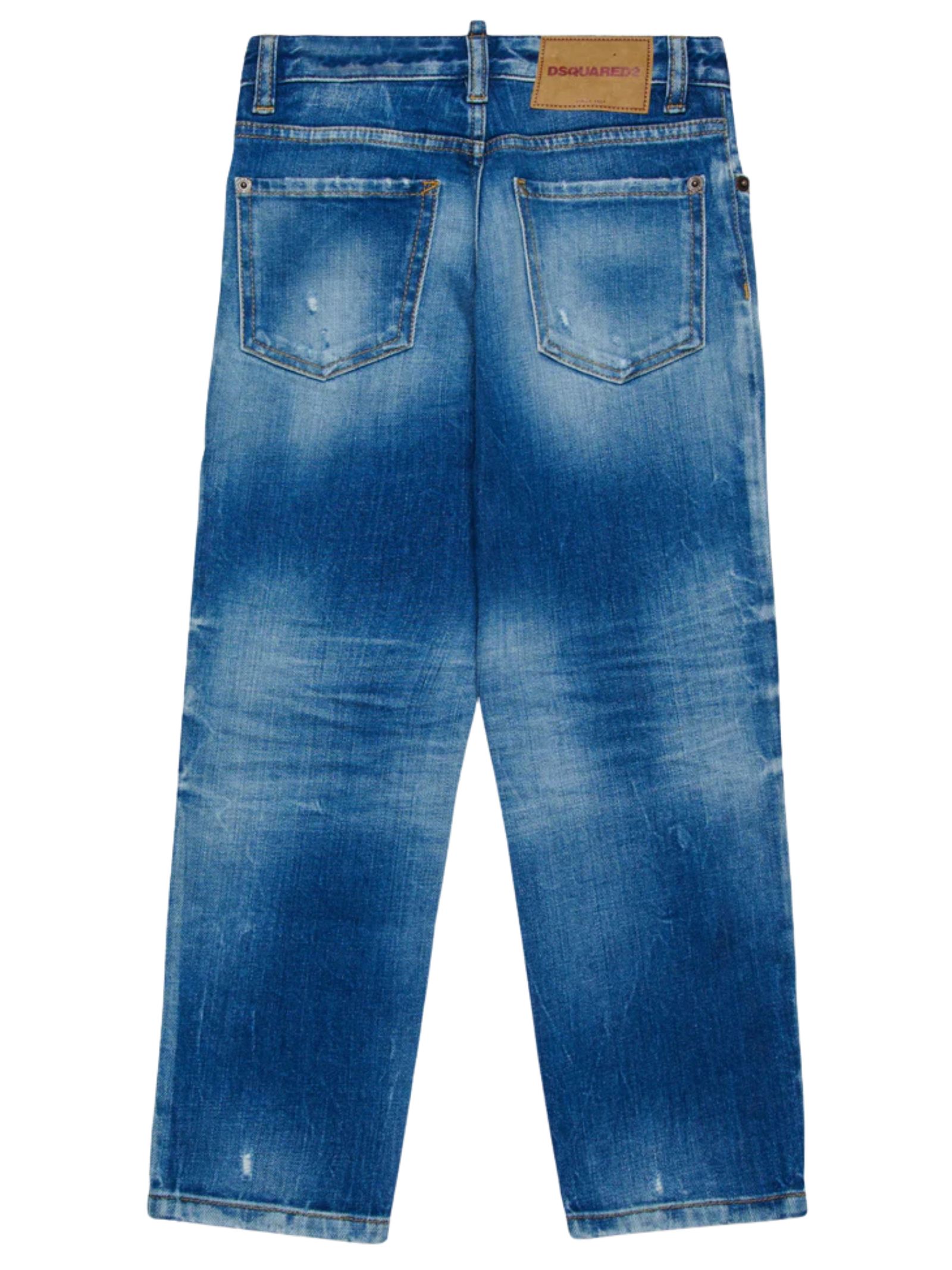 Dsquared Kids jeans di colore blu in cotone leggermente elasticizzato, effetto consumato, dettaglio sbiaditure a contrasto bianco, modello 5 tasche, passanti per cintura, patch con logo sul retro, vestibilità regolare. Composizione: 99% cotone 1% elastan