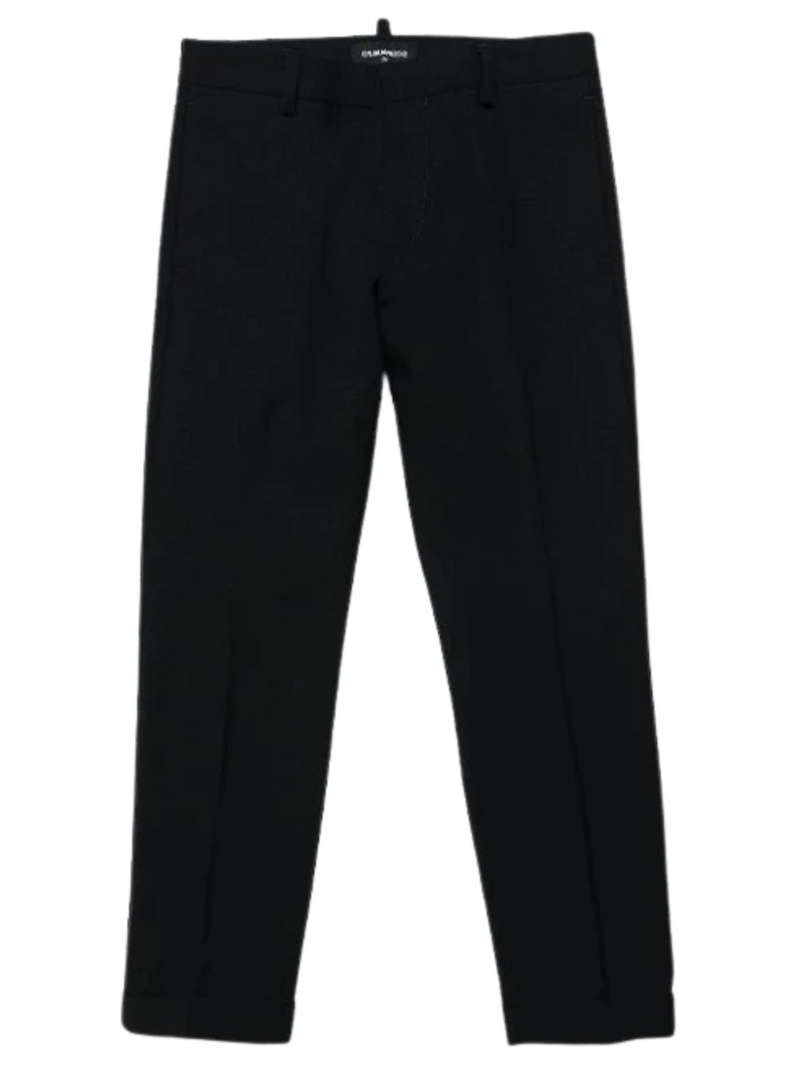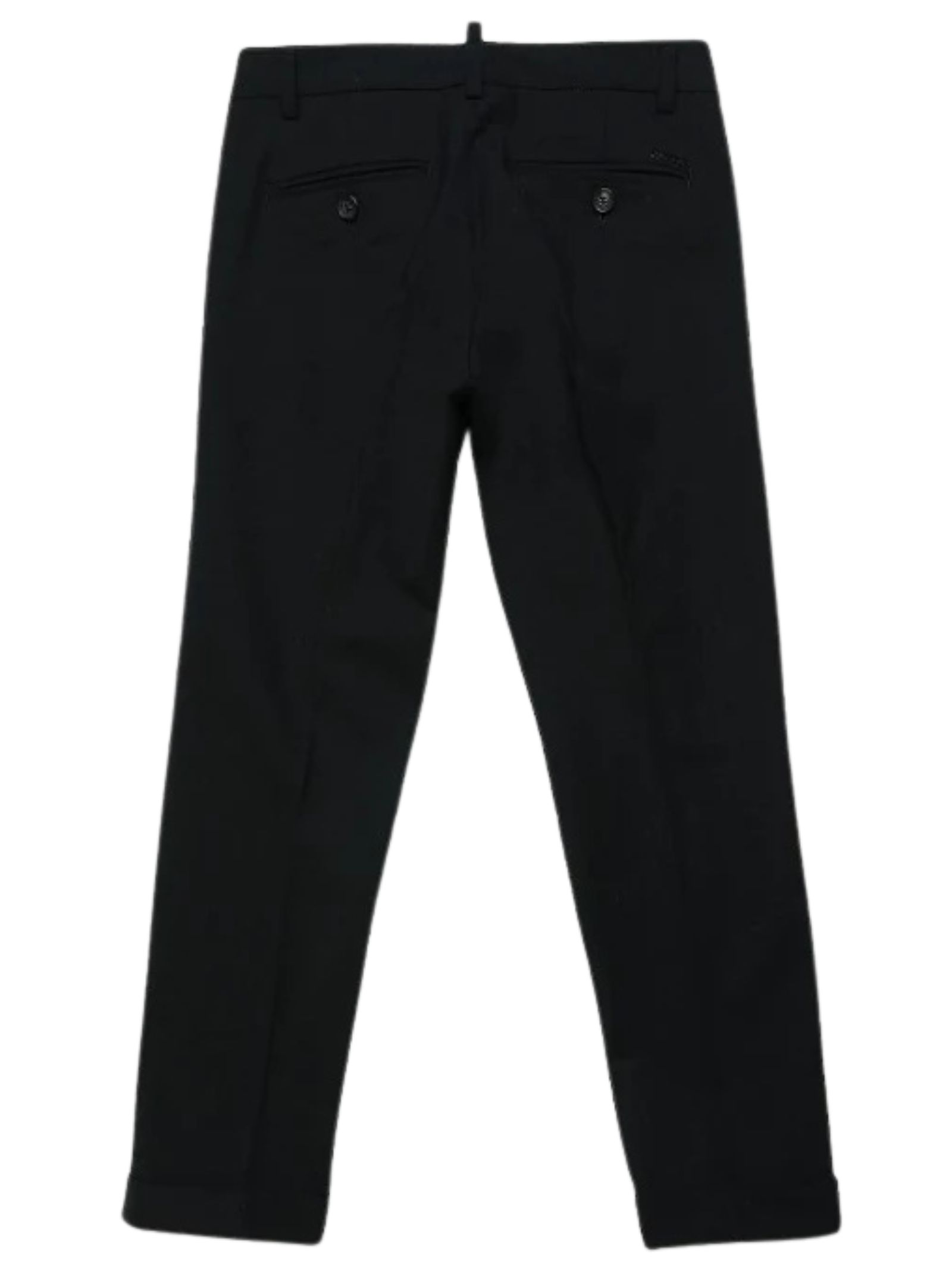 Dsquared2 Kids pantalone di colore nero, realizzato in lana vergine, modello con vita regolare, due tasche laterali, due tasche a fessura sul retro, decorato con logo in metallo posteriore, vestibilità regolare. Composizione: 95% lana vergine 5% elastan. Fodera: 60% viscosa 40% poliestere