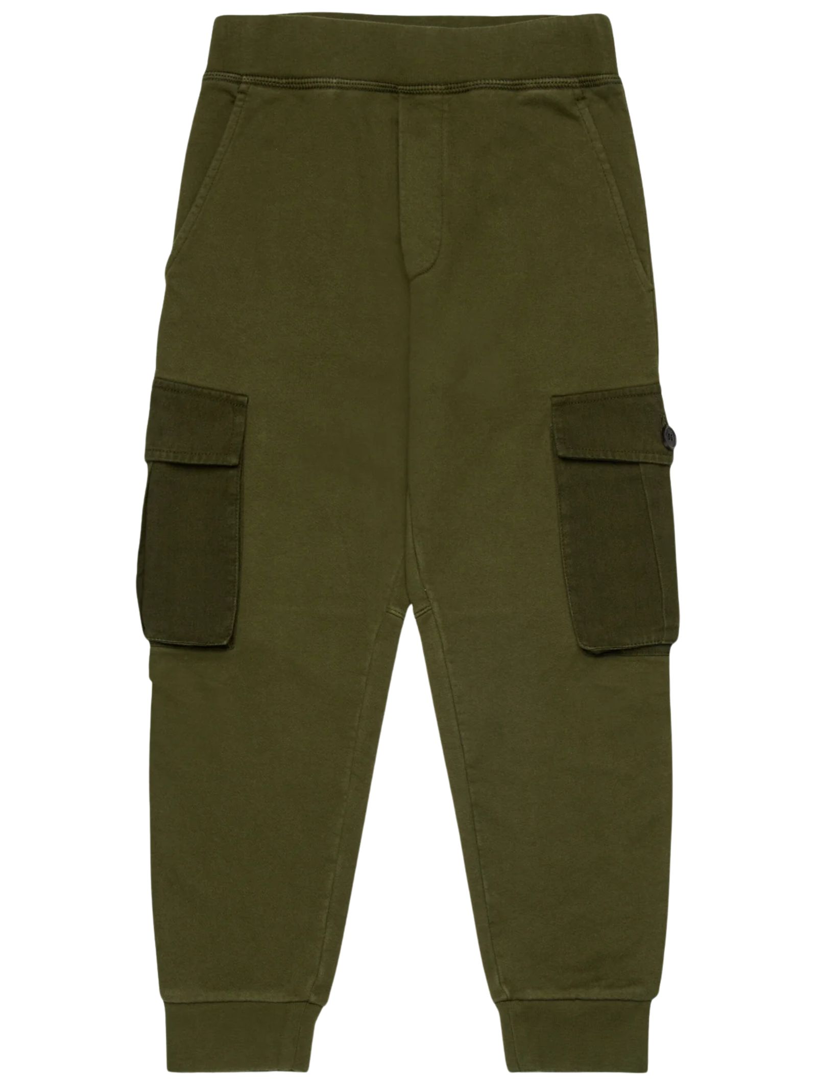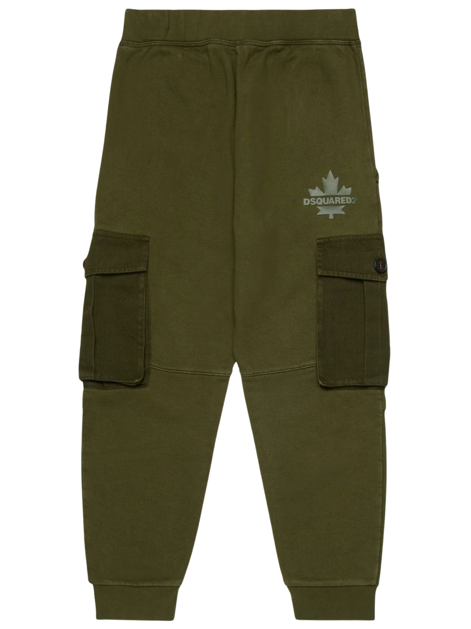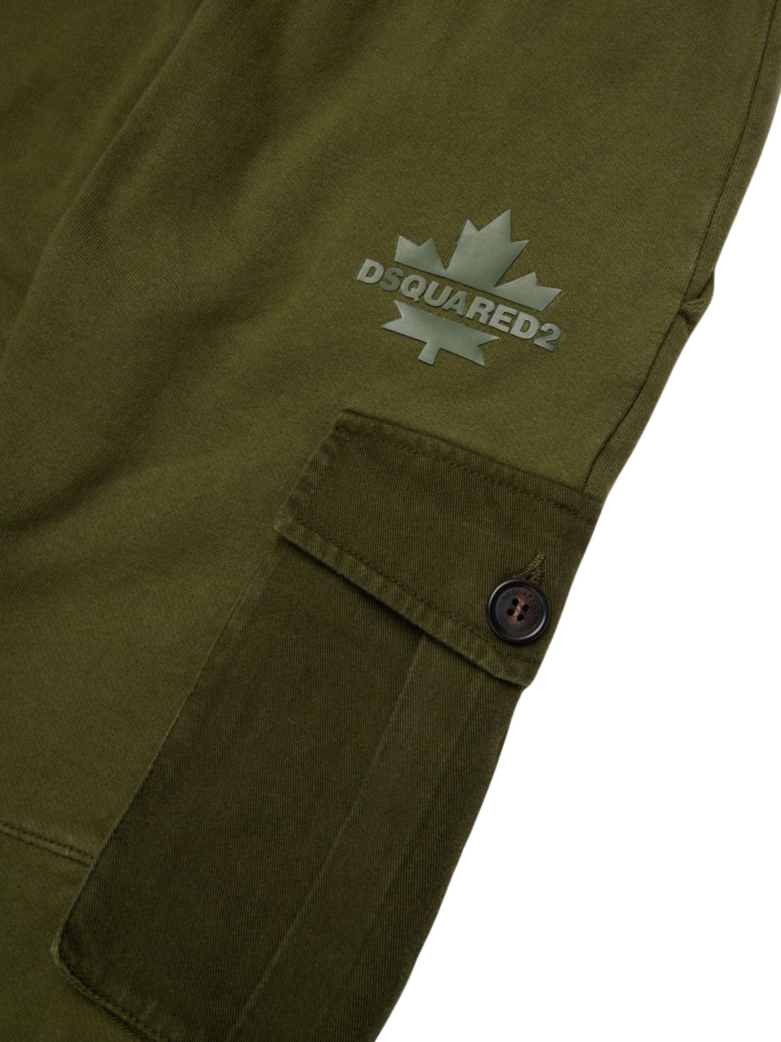 Dsquared2 Kids pantalone di colore verde, design cargo in felpa, elastico in vita ed alla caviglia, logo Maple Leaf effetto gommato in tono colore sul davanti, tasche all'americana anteriori, tasche laterali in gabardina. Composizione: 100% cotone
