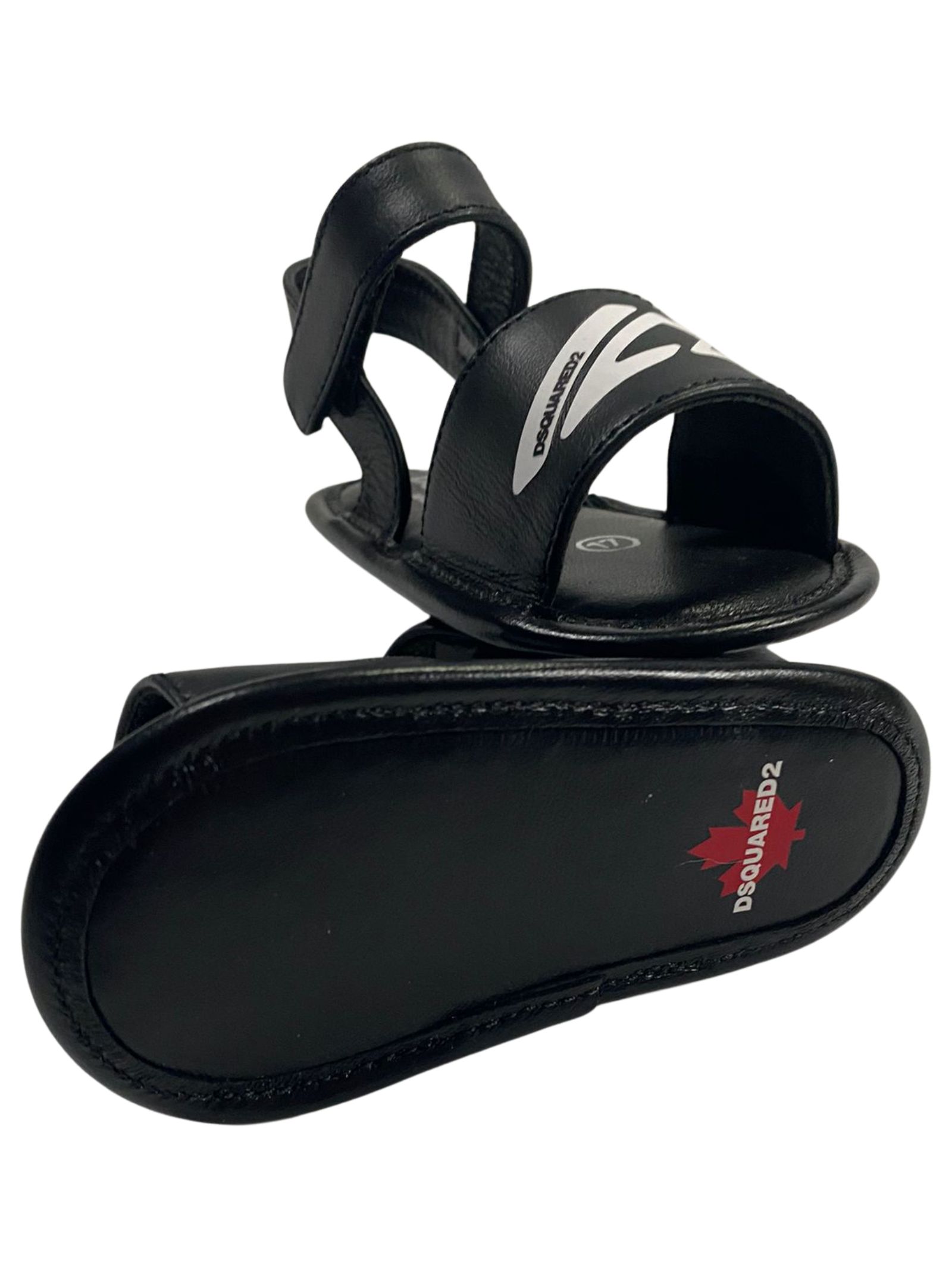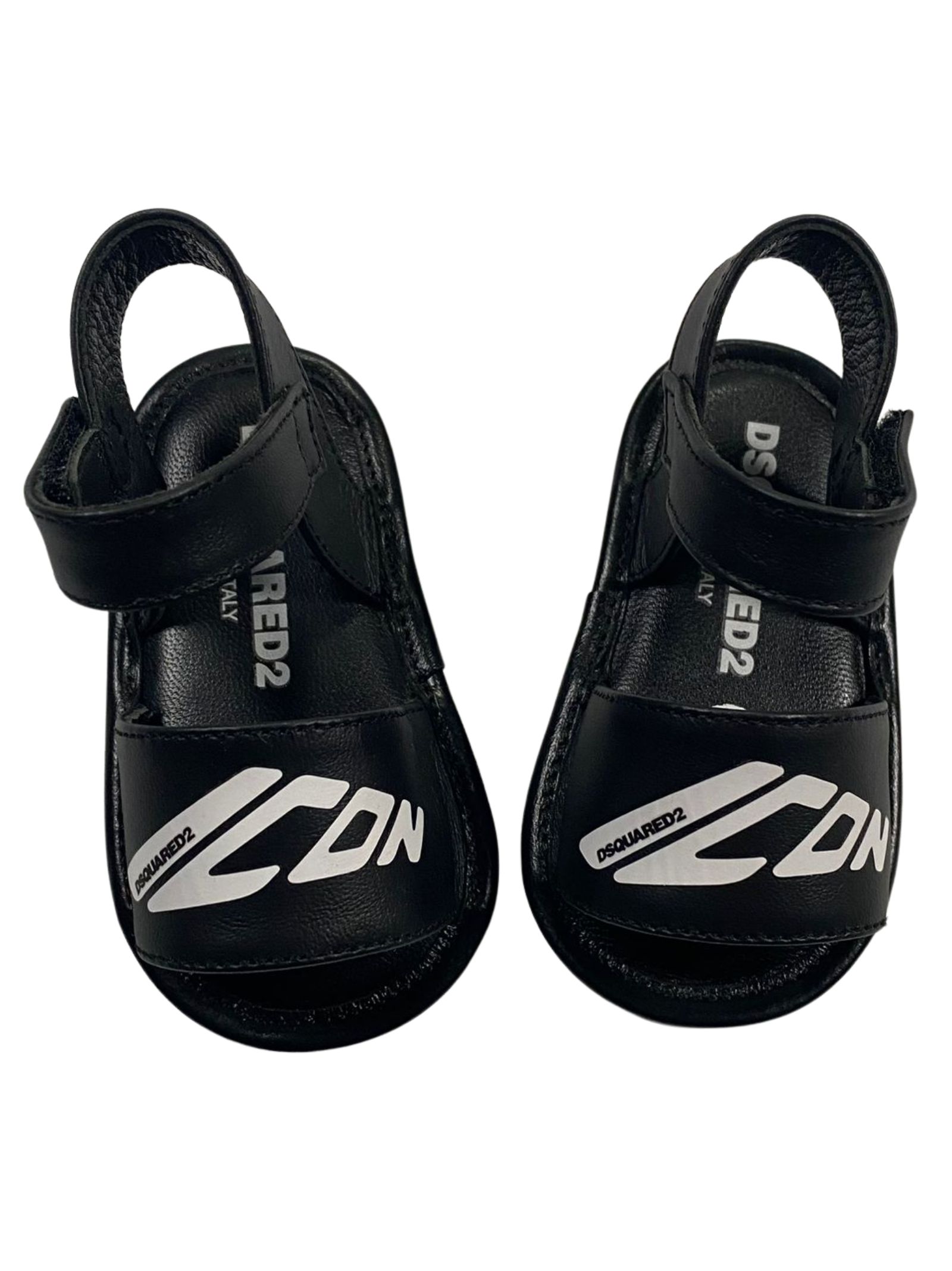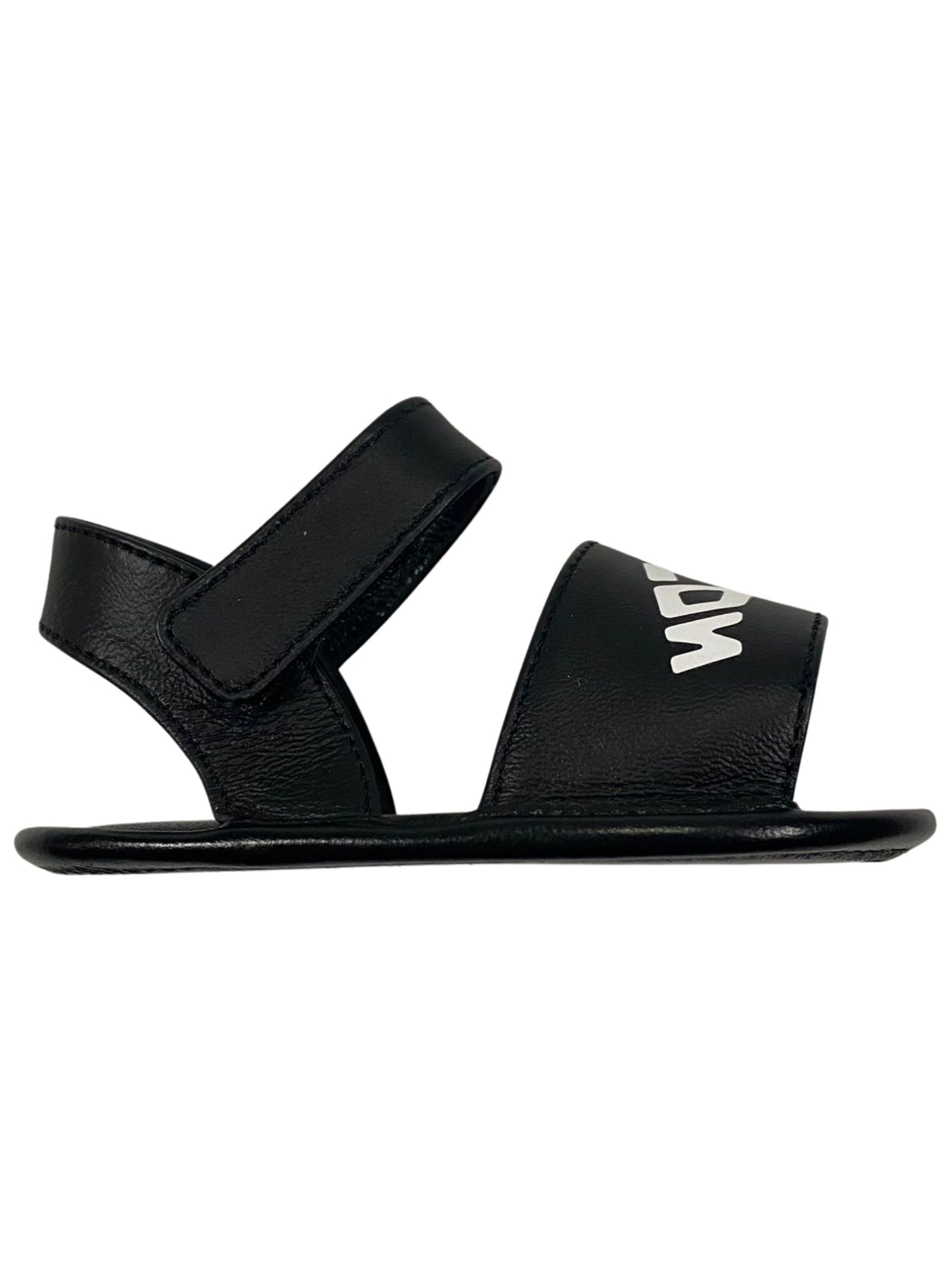 Dsquared2 Kids sandalo di colore nero in pelle di vitello, stampa con logo sul davanti a contrasto bianco, punta aperta, soletta con logo, chiusura laterale con strappo regolabile e suola piatta. Composizione: 100% pelle di vitello. Made in Italy