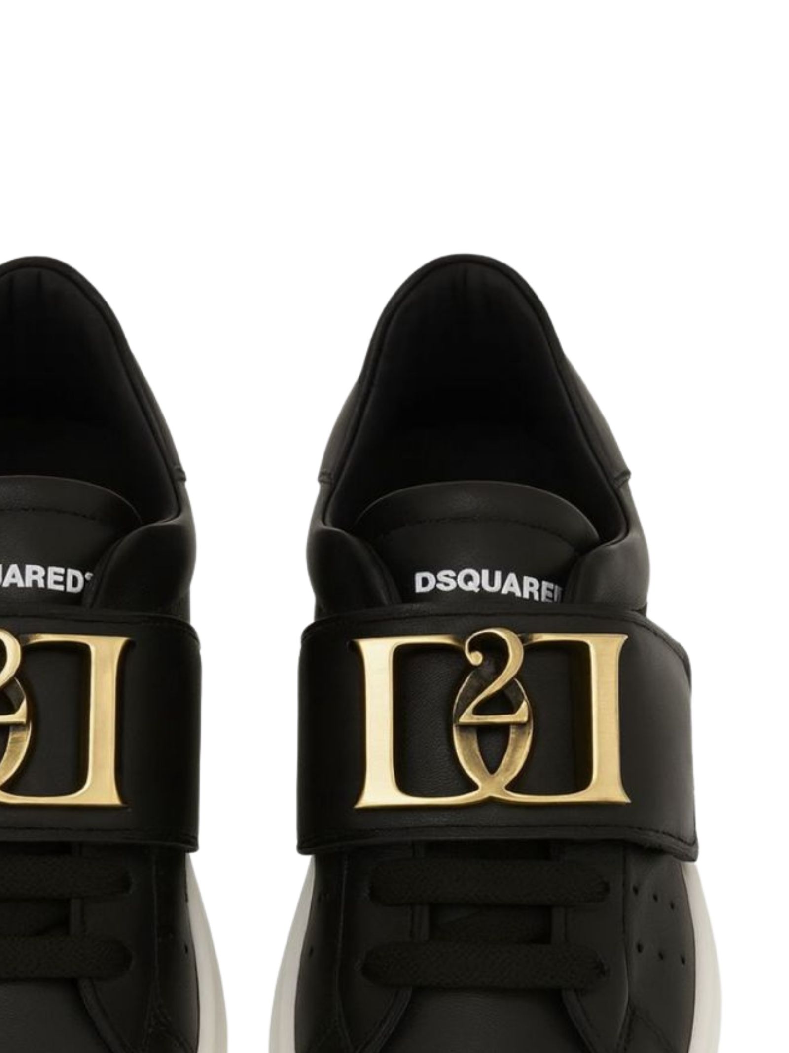 DSQUARED2 Kids scarpe in pelle di colore nero, modello con punta tonda, chiusura frontale con lacci e chiusura con velcro, dettaglio logo in metallo oro, linguetta imbottita, suola in gomma e soletta interna in pelle. Fodera: pelle di vitello 100% Esterno: pelle di vitello 100% Suola: gomma 100%. Made in Italy