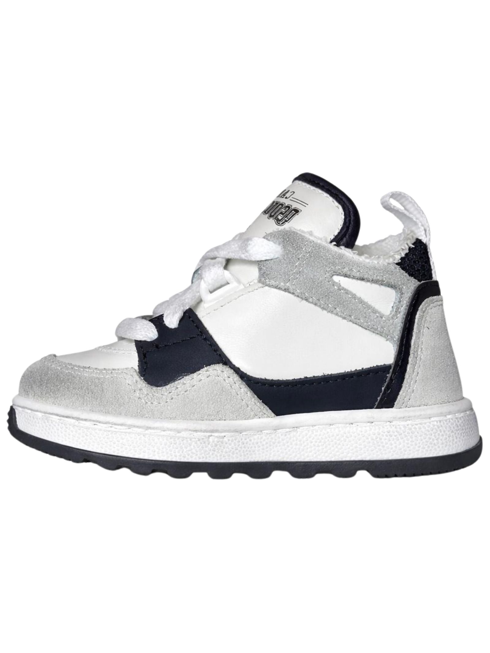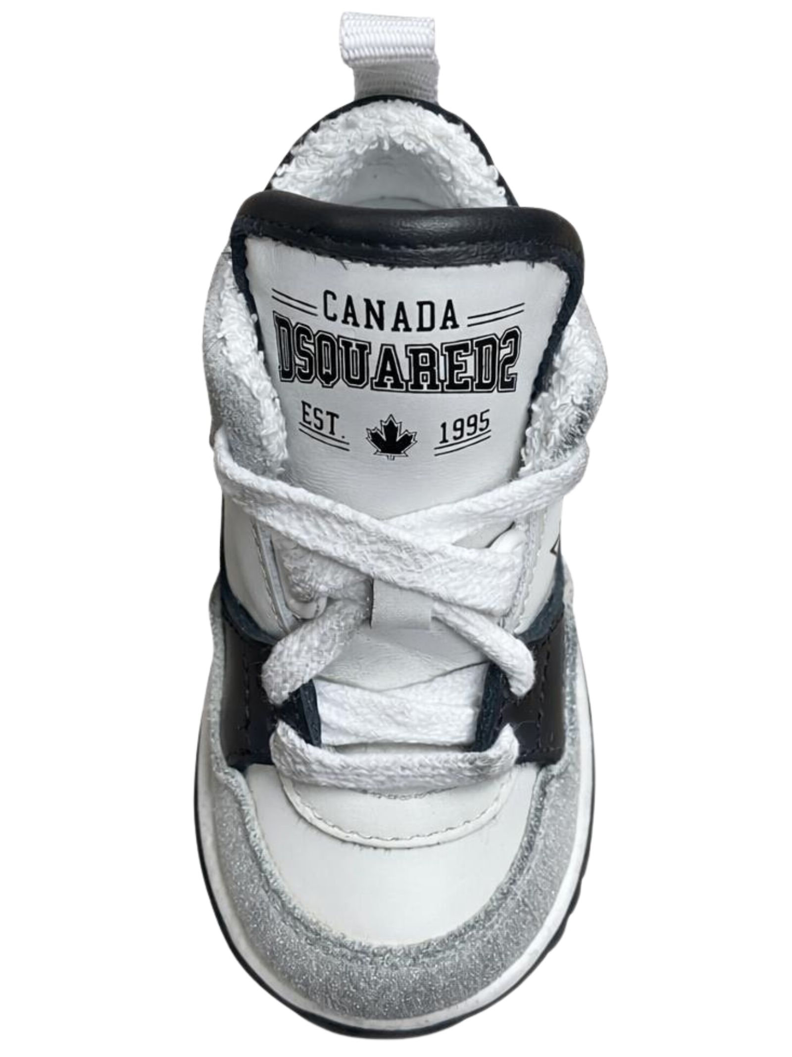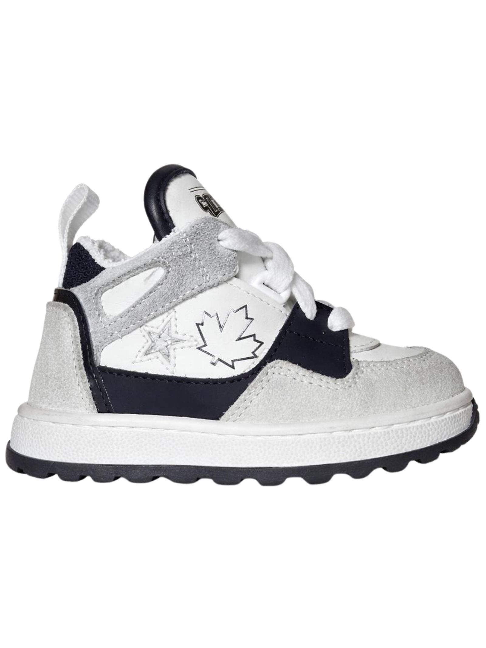 DSQUARED2 Kids scarpe di colore bianco/nero realizzate in pelle, dettagli in pelle scamosciata a contrasto grigio, logo laterale, modello con collo alto, punta tonda, chiusura frontale con lacci, linguetta con logo, suola in gomma. Made in Italy