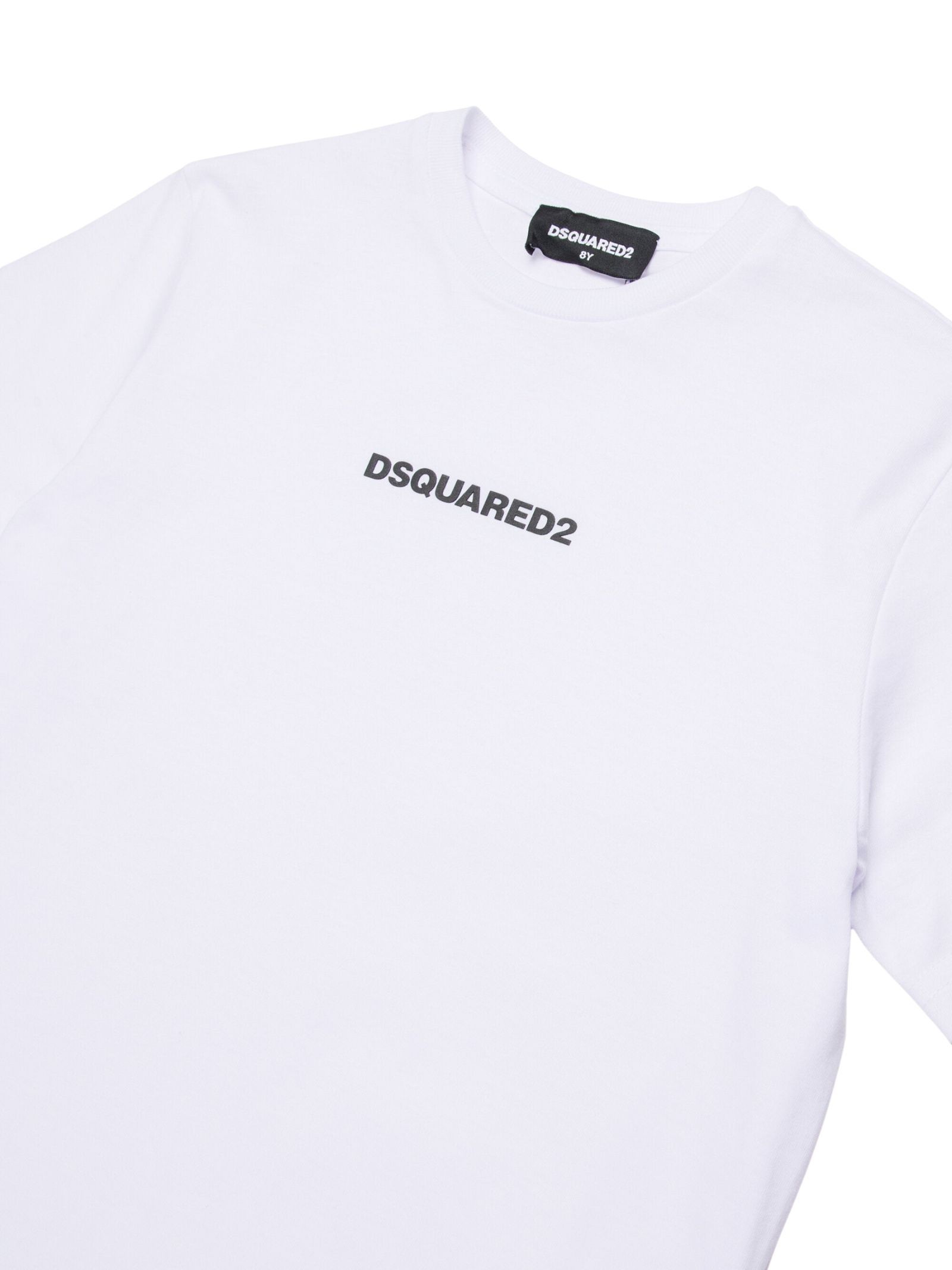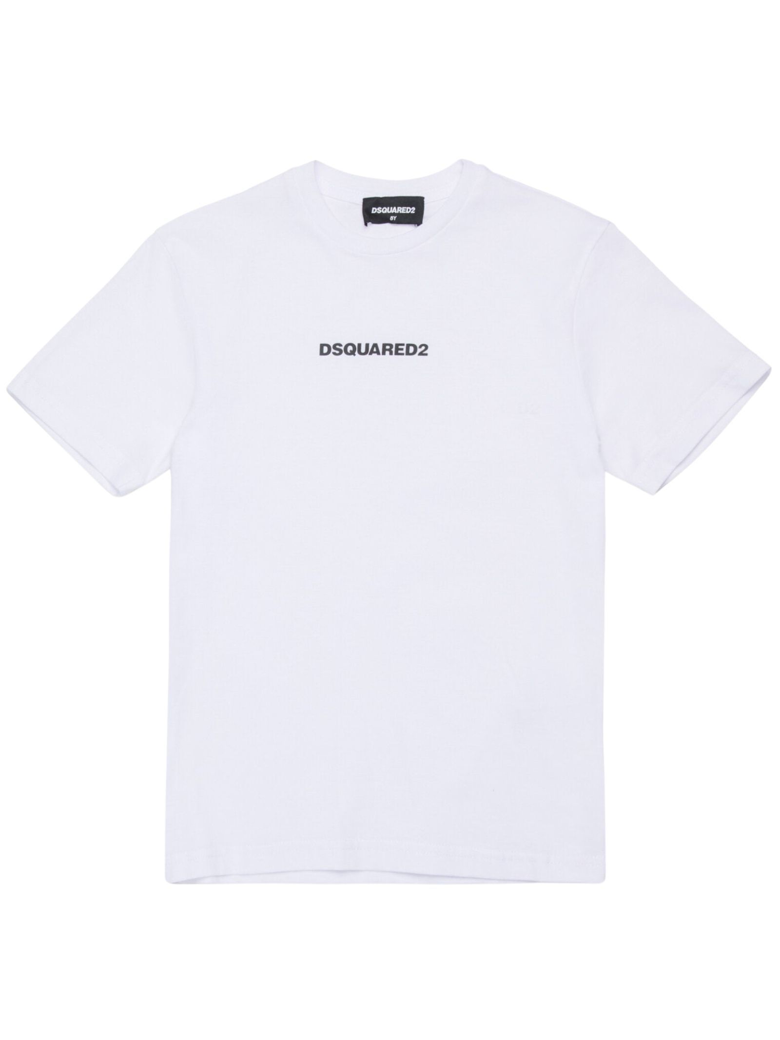 Dsquared2 Kids t-shirt di colore bianco, modello girocollo, mezza manica, stampa centrale logo gommato a contrasto nero, vestibilità regolare. Composizione: 100% cotone