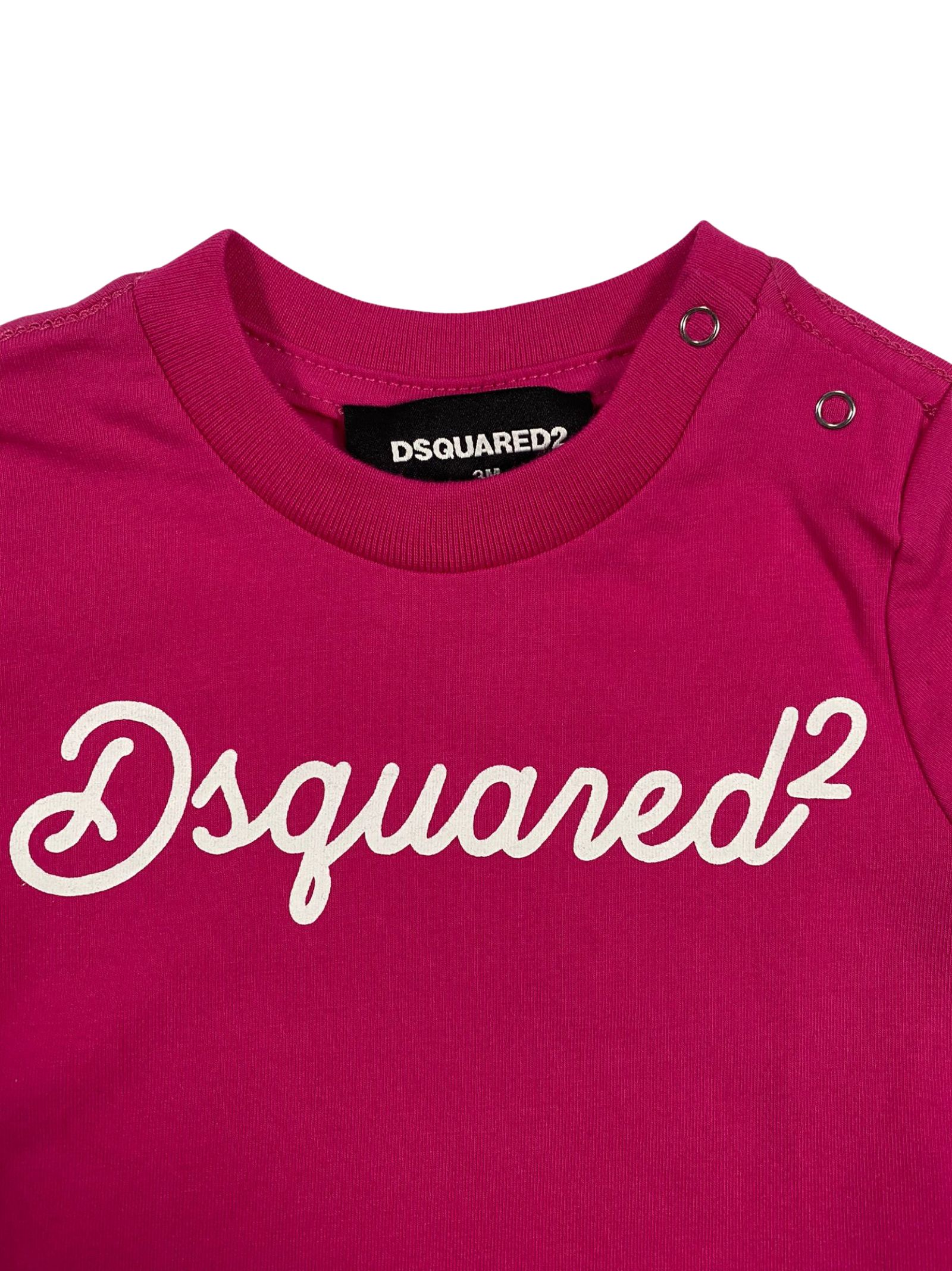 Dsquared2 Kids t-shirt di colore fucsia, modello girocollo, manica lunga, decorata con stampa logo centrale a contrasto bianco, bottoni automatici sulla spalla, vestibilità regolare. Composizione: 95% cotone 5% elastan