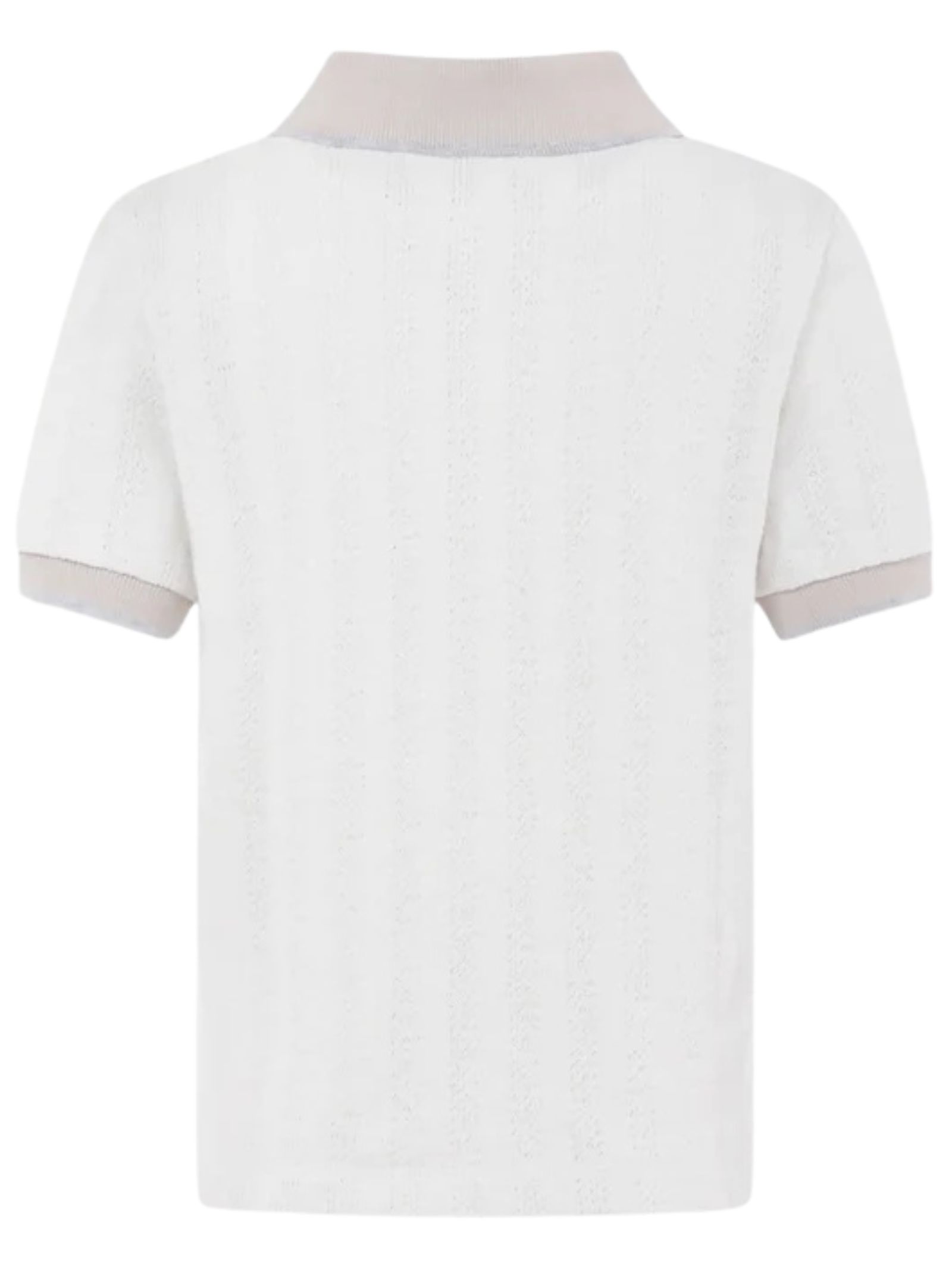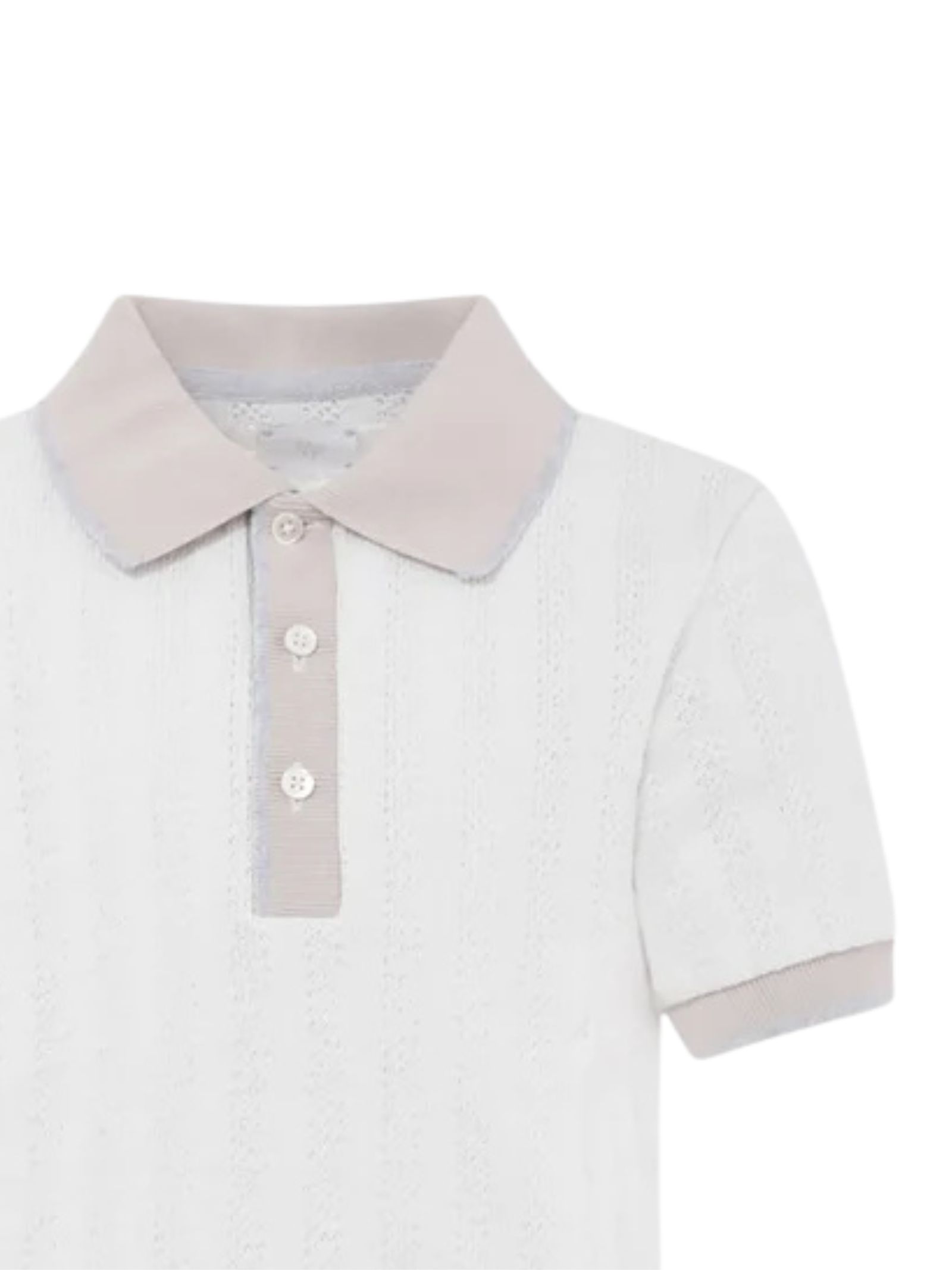 Eleventy Milano Kids polo di colore avorio, realizzata in maglia di cotone con dettagli traforati, colletto e bordo maniche a contrasto beige, patch con logo sul retro, vestibilità regolare. Composizione: 100% cotone