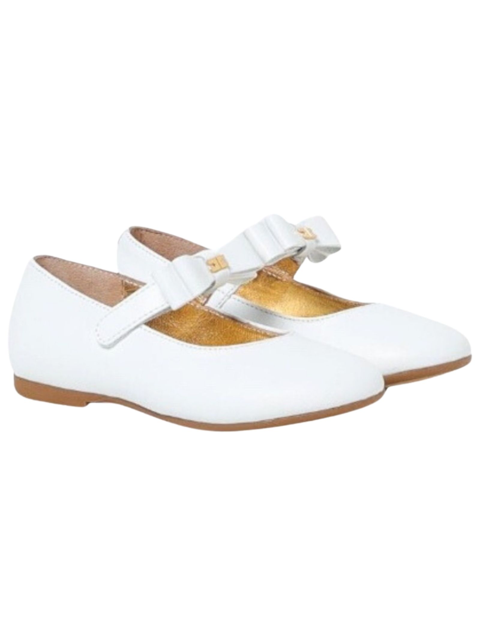 Elisabetta Franchi Kids ballerine di colore bianco, realizzate in pelle, chiusura con velcro regolabile, applicazione fiocco, logo in metallo, design punta tonda, suola in gomma. Made in Italy